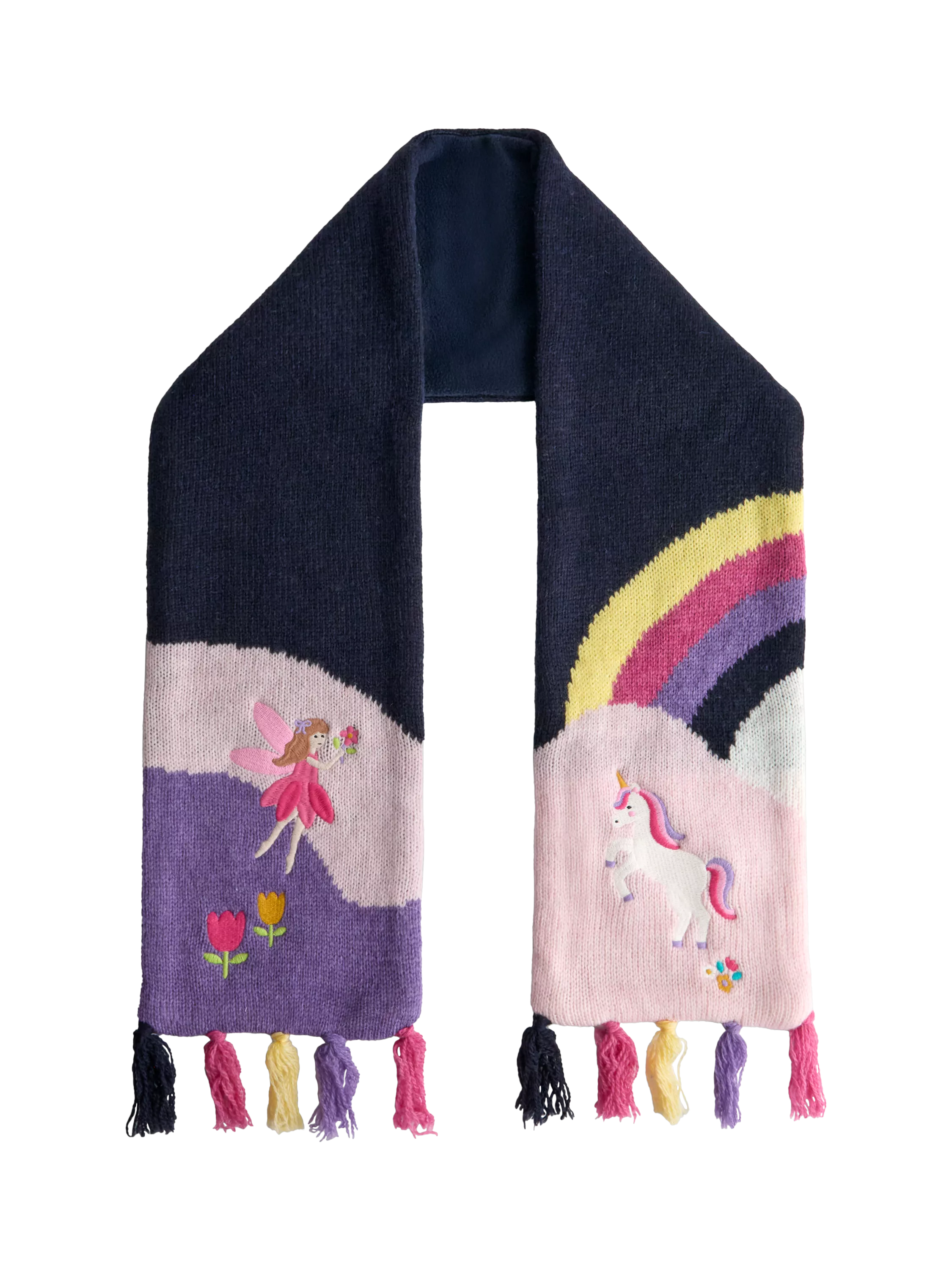 Made from a soft wool blend, this scarf has a fluttering fairy and unicorn design, a fleece lining and tassel ends.