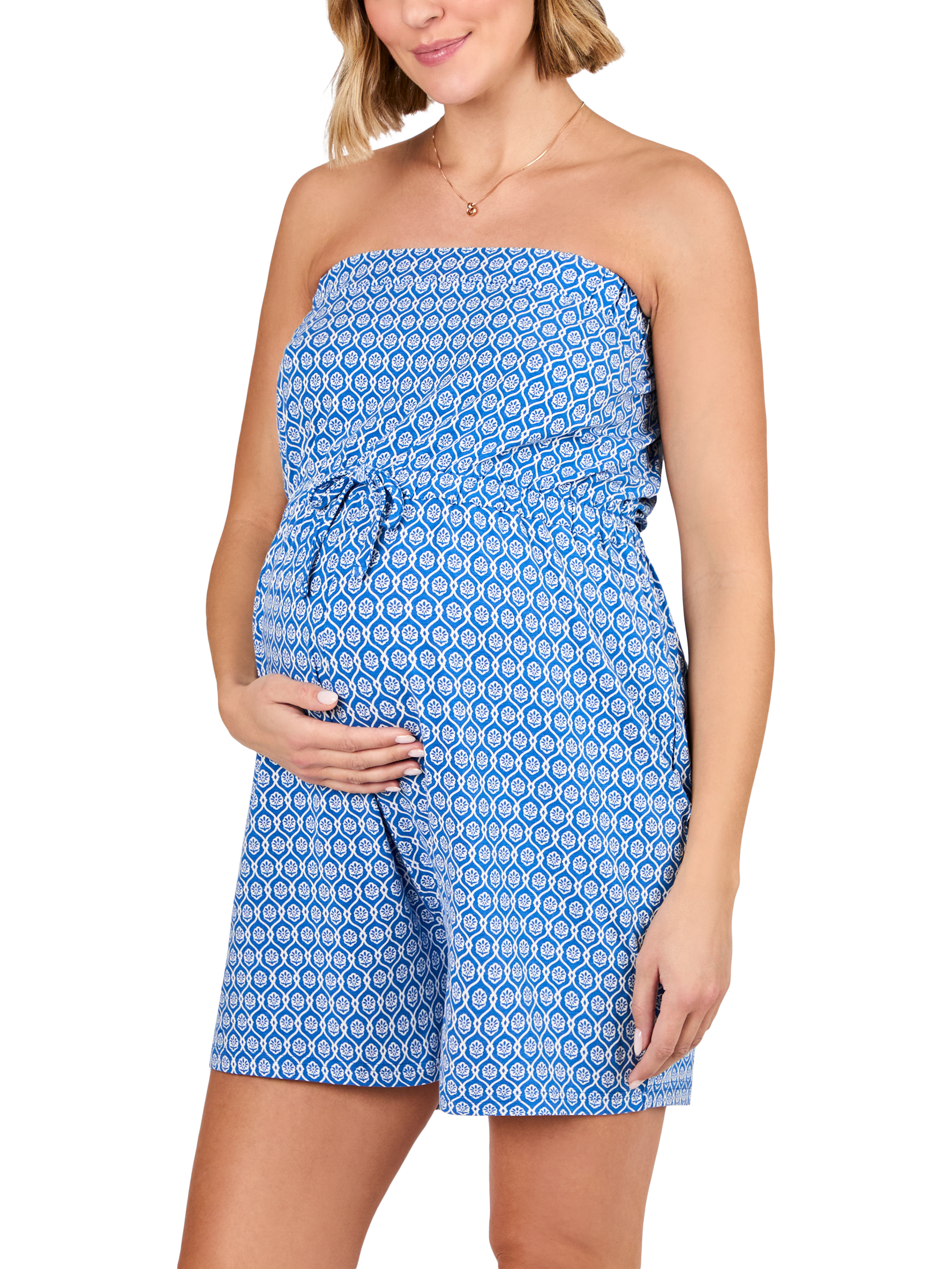 Light, breezy and beautiful blue, enjoy irresistable comfort for you and bump too! This Patterned Bandeau Maternity Playsuit has an elastic drawstring waist and top band so it stays up while allowing for easy movement so you can stay cool while looking oh so stylish.