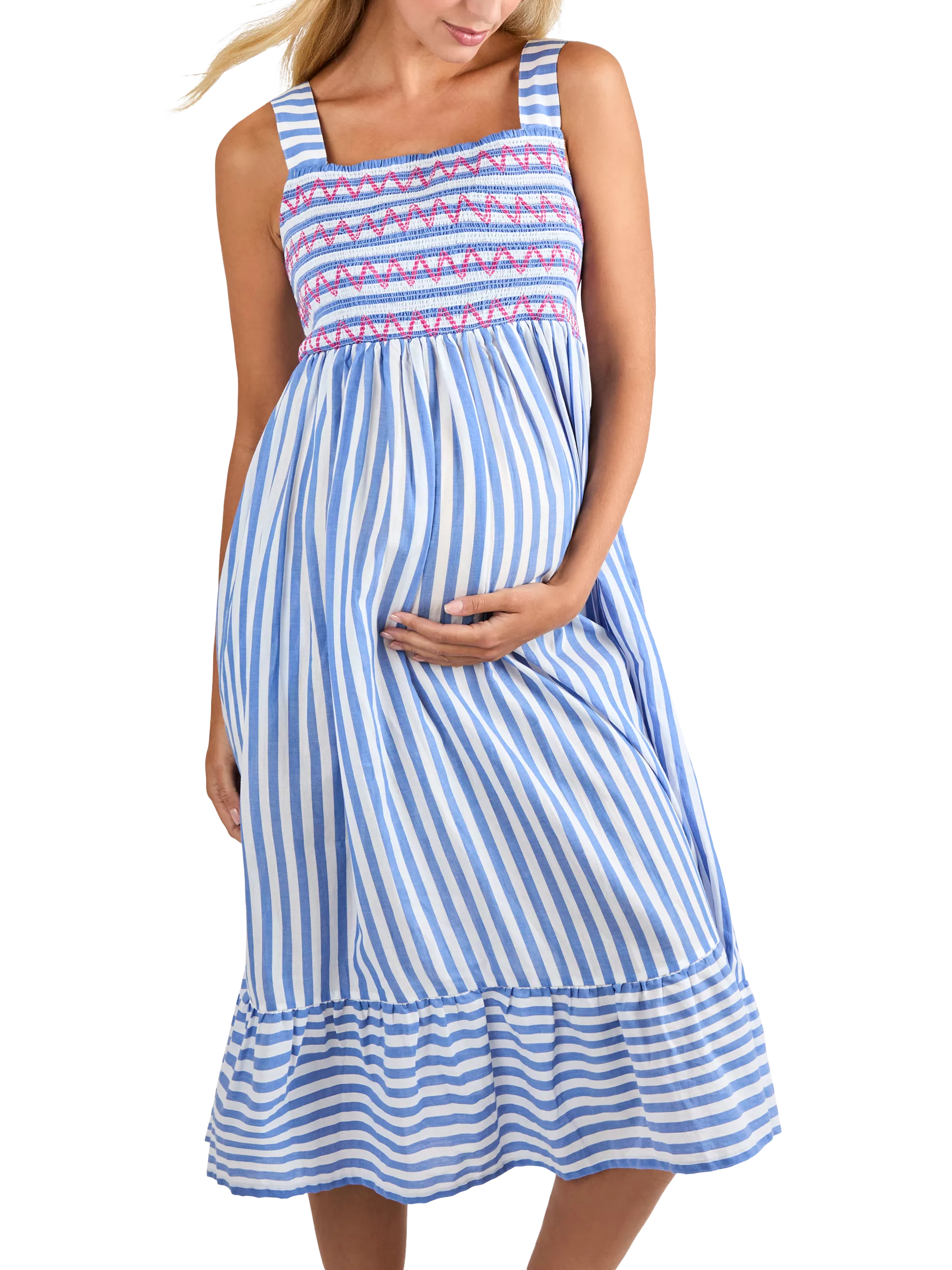 Summer days are on their way! And there's nothing better than keeping cool in the sun than this Striped Shirred Maternity Midi Dress. Designed with comfort in mind, the stretchy shirred material on the top offers a flexible and secure fit, whilst the delicate zig zag embroidery adds colour.