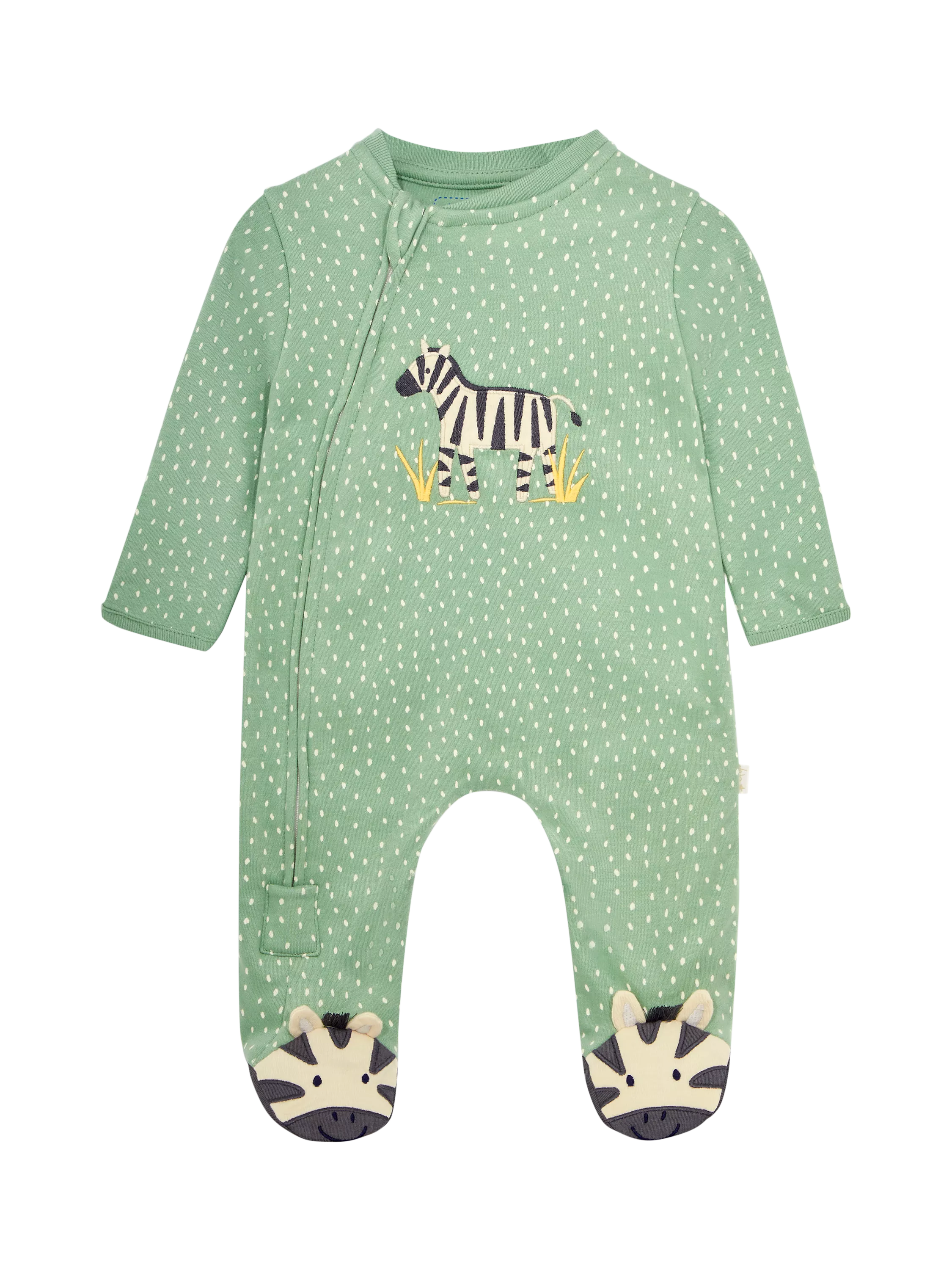 JoJo Maman Bébé's popular Appliqué Zip Sleepsuit now comes in a new and charming design that's sure to make any child have sweet dreams. A sage green bodysuit with cream lines adds a contemporary flair to a traditional outfit, while zebra faces on each foot and a zebra appliqué on the front give a playful, relaxed look.