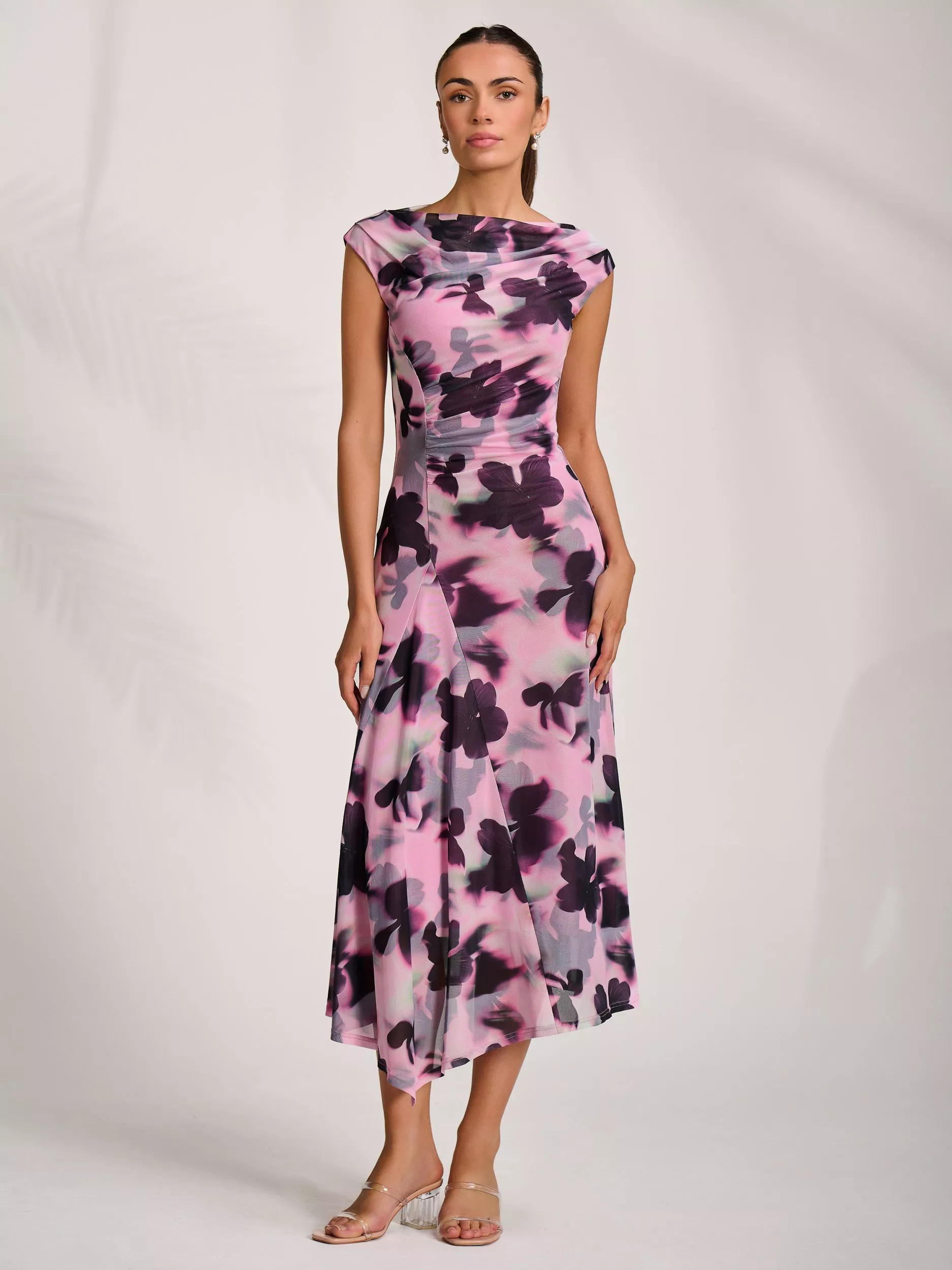 The Draped Mesh Midaxi Dress by Jolie Moi features slight gathers at the front, with a waterfall neckline, versatile for multiple looks. The sleeveless design is fully lined and finished with an asymmetric hem.