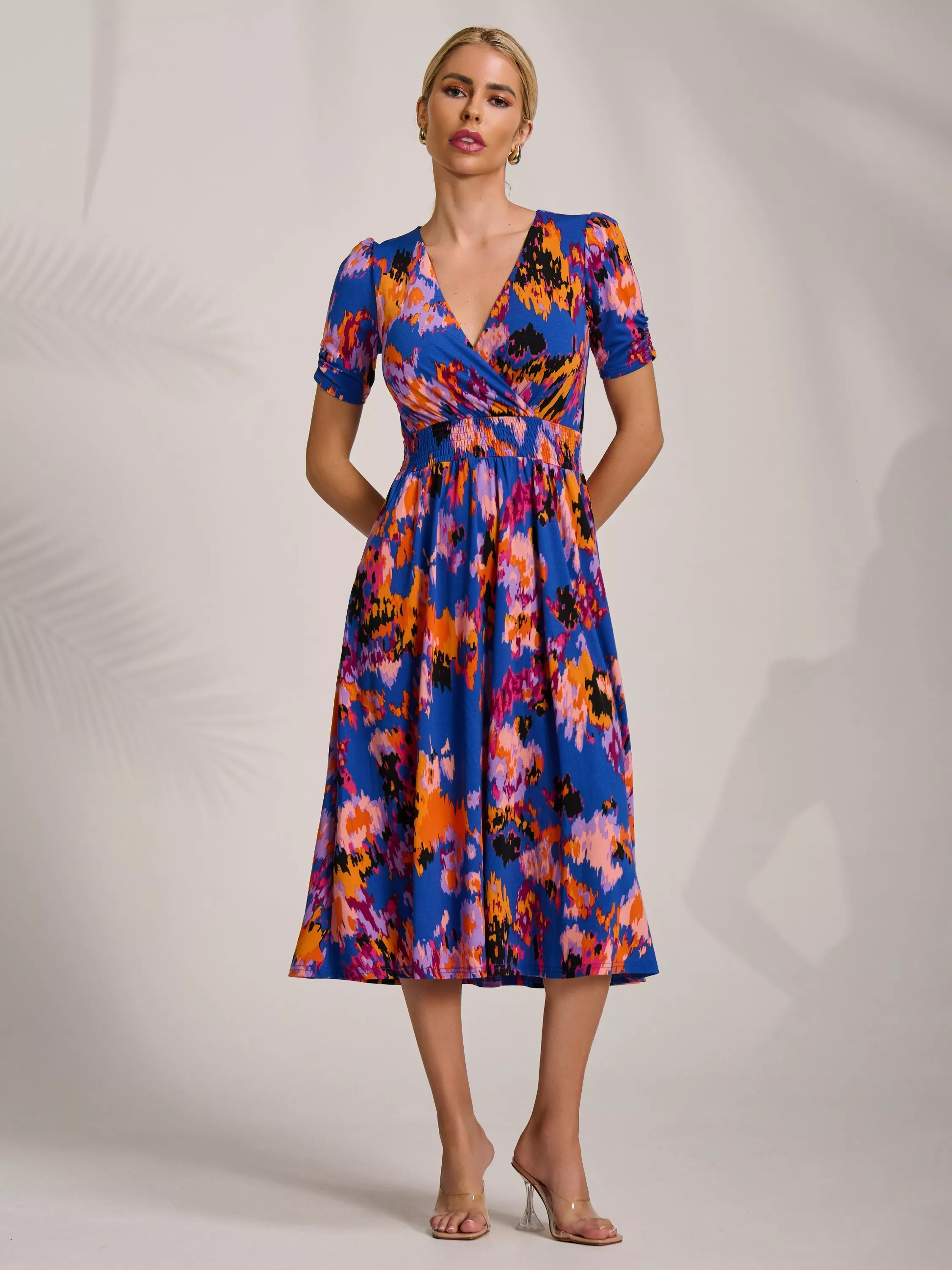 The Printed Jersey Midi Dress from Jolie Moi. Made from soft jersey, this midi dress features short ruched sleeves, a wrap V-neckline, and a shirred thick waistband that flatters the waist. Fully lined for comfort, the dress includes discreet pockets and a pleated skirt for elegant movement.