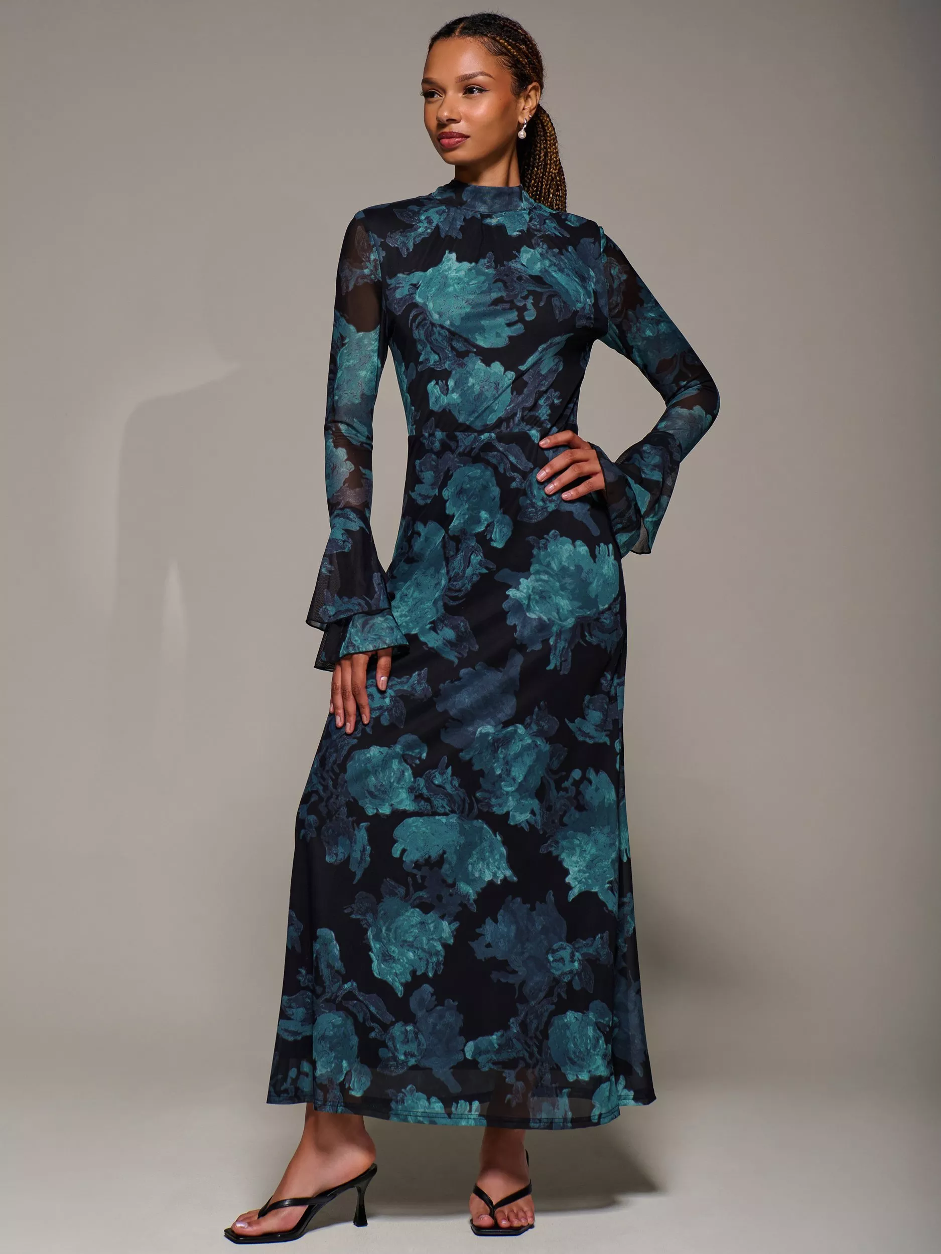 The Ruffle Long Sleeve Mesh Maxi Dress by Jolie Moi features a high neckline adorned with subtle pleats at the centre. The back is finished with a tie fastening at the neck. The dress has long sleeves finished with two delicate frills for an elegant touch.