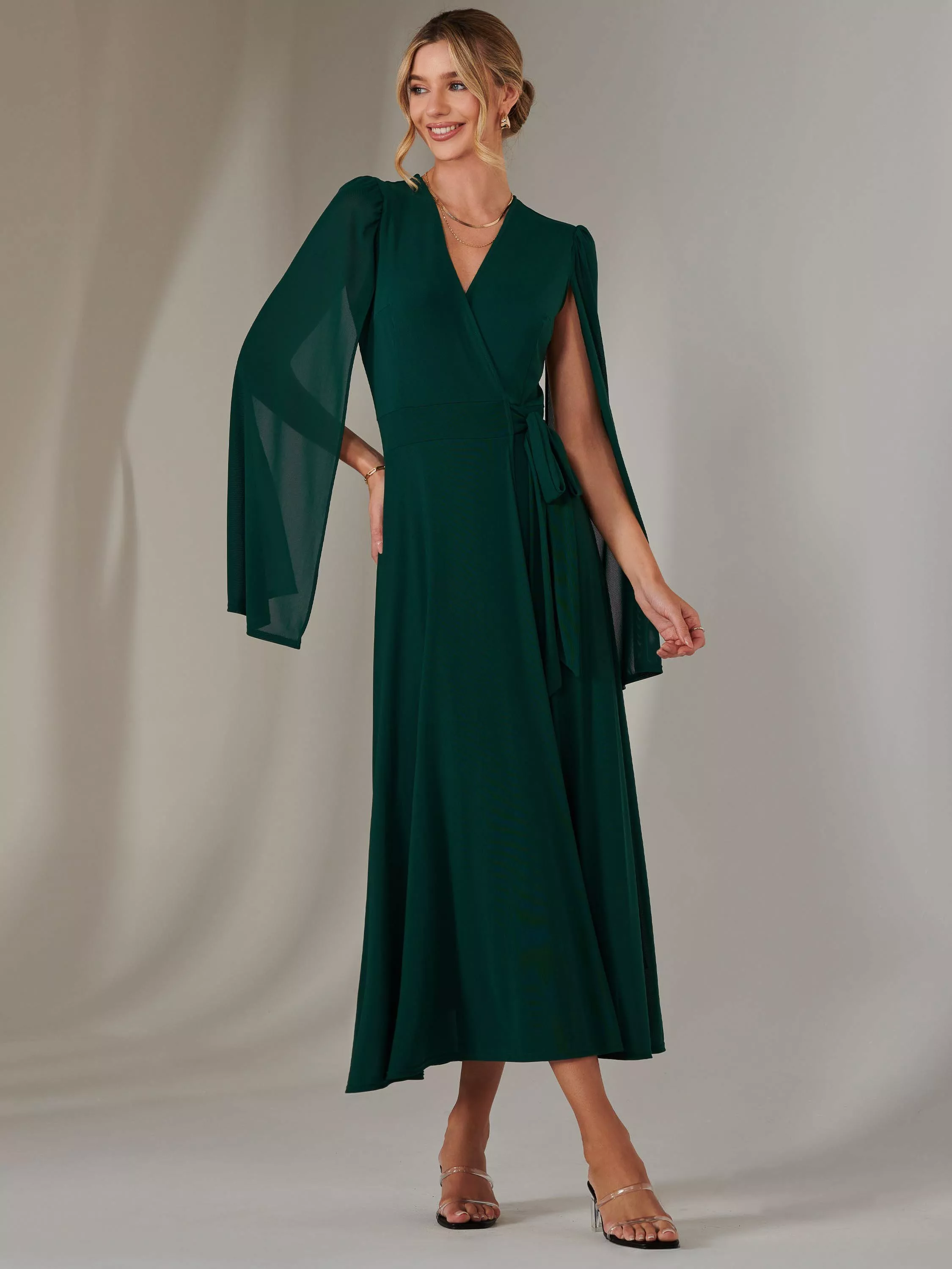 The Amira Cape Sleeve Wrapped Maxi Dress is a formal evening dress that is certain to become a wardrobe staple. In a colour that will compliment a variety of skin tones, this adjustable dress exudes elegance. This adjustable wrap dress features a deep plunge V Neckline that draws attention to the collarbone, creating a stylish and flattering look.