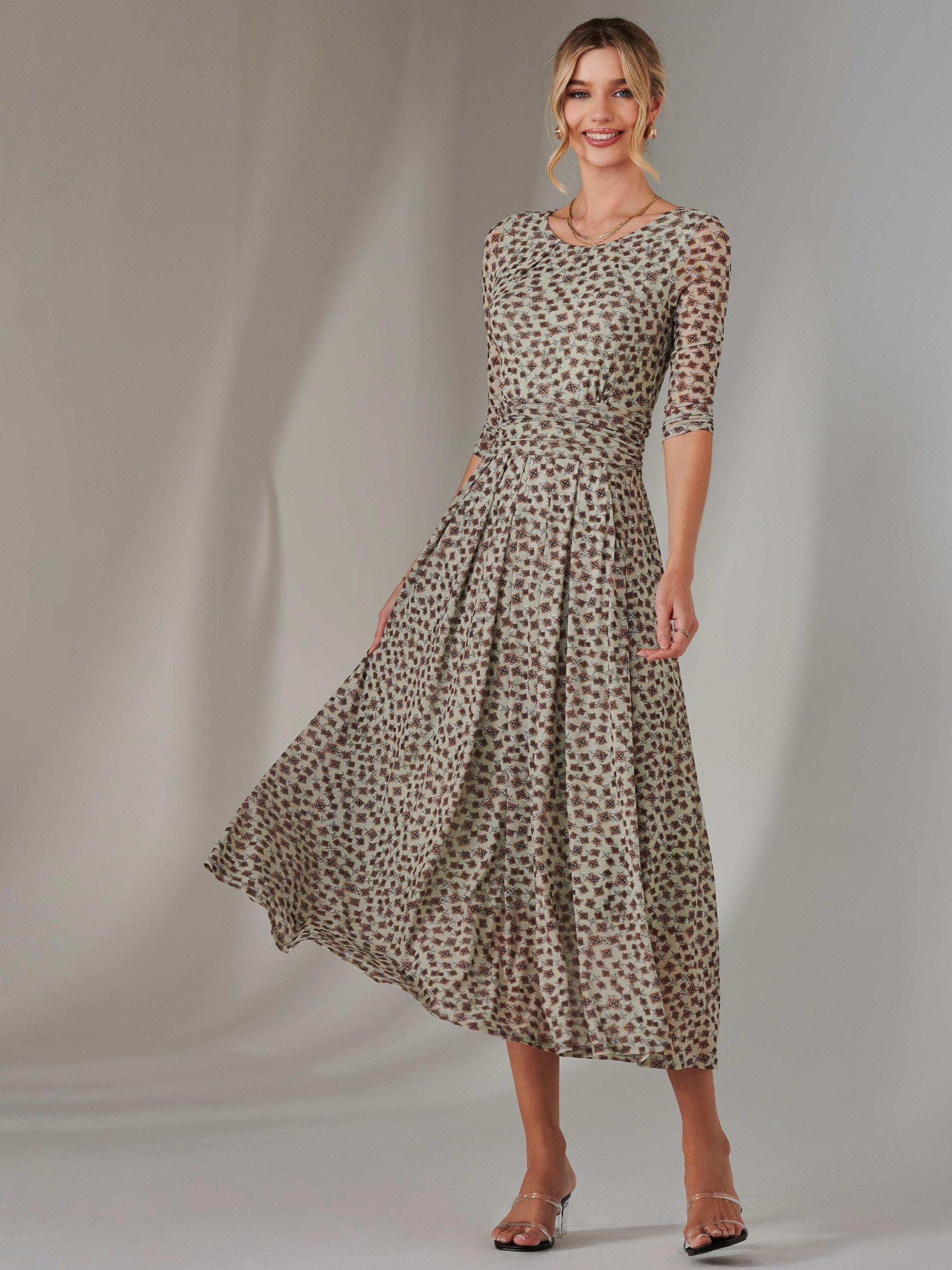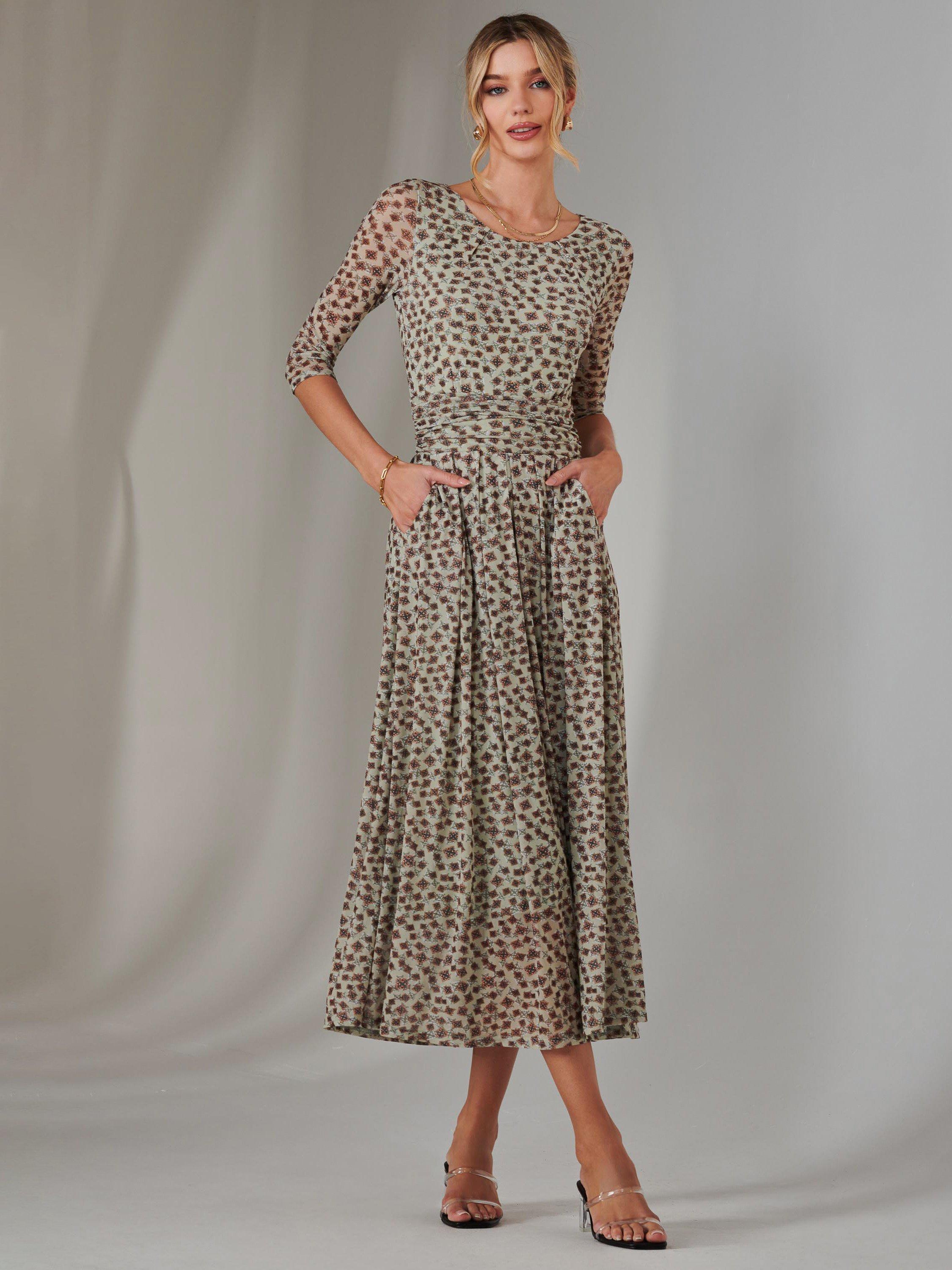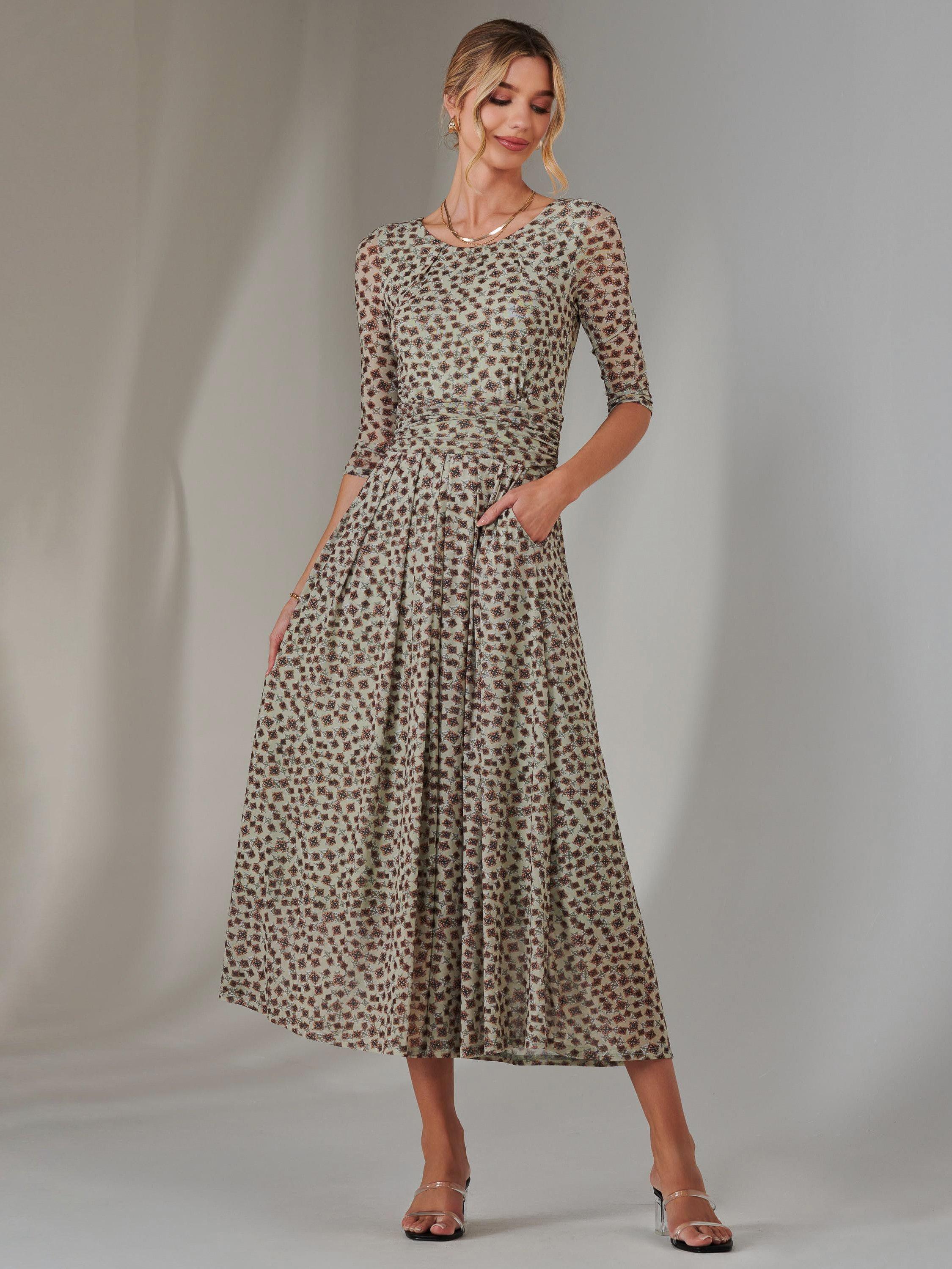 Featuring a charmful floral print on an airy mesh fabric, this dress exudes elegance. It's cut with 3/4 length sleeves and has a flattering ruched waistband and two handy side pockets.