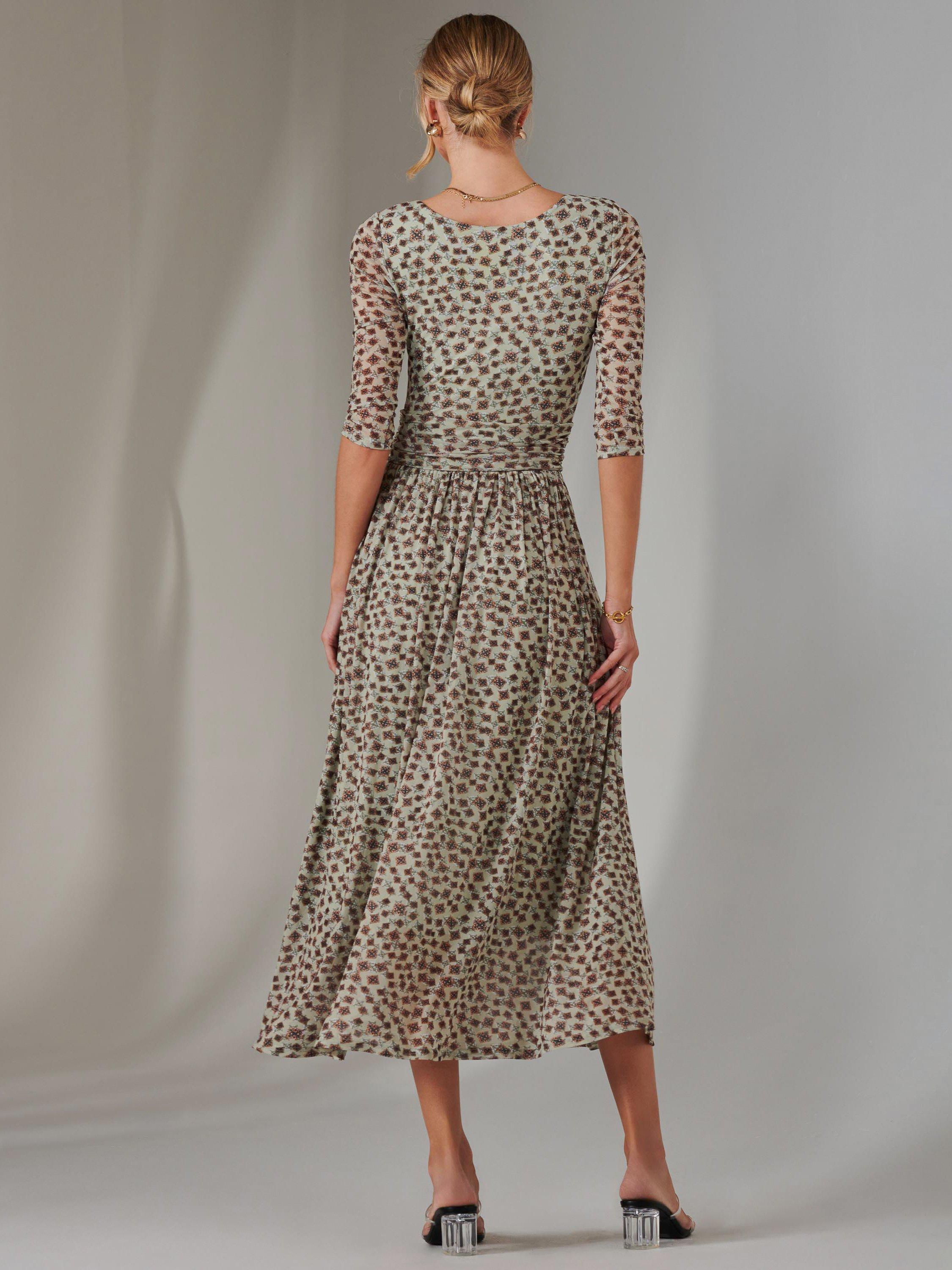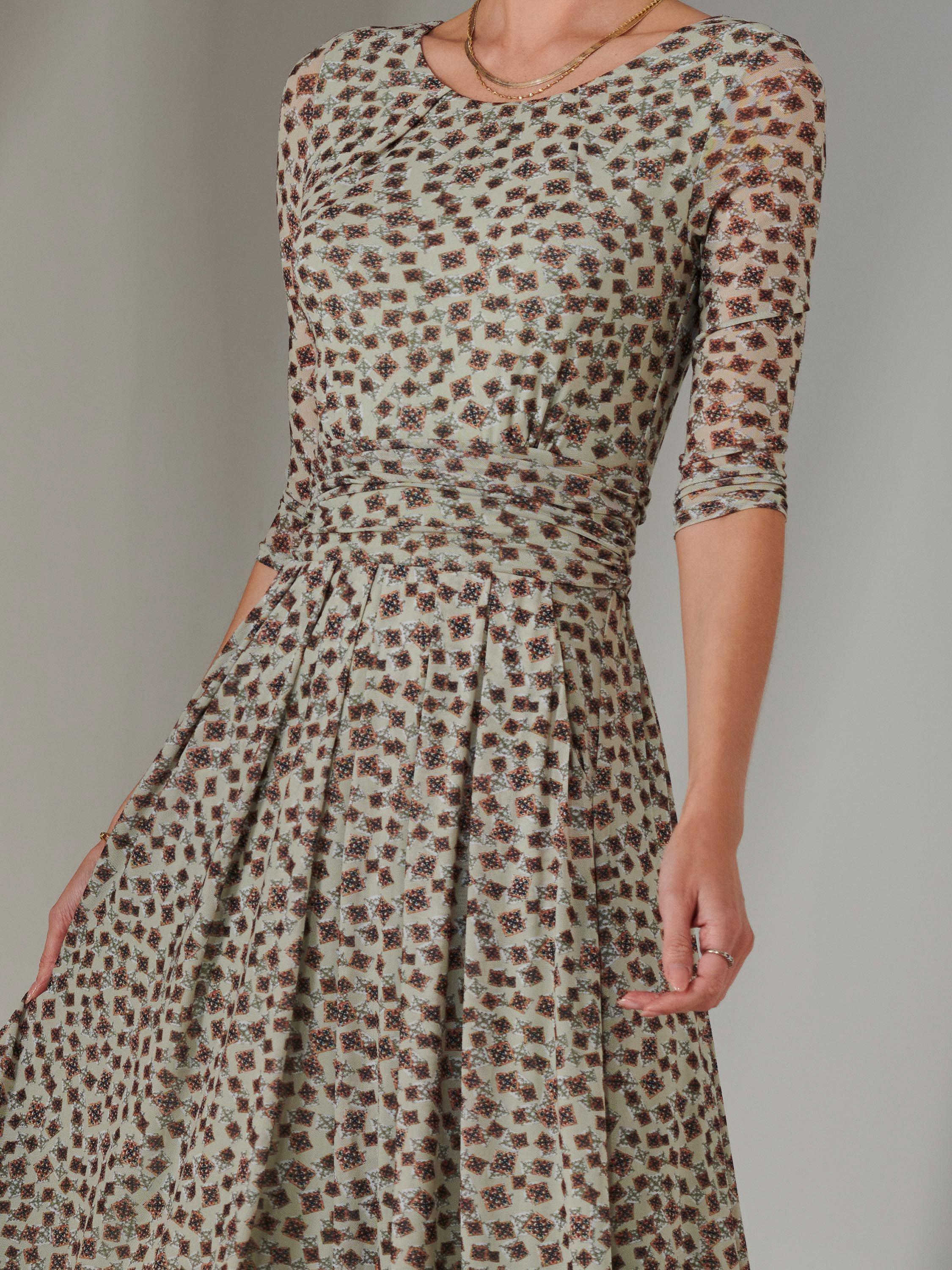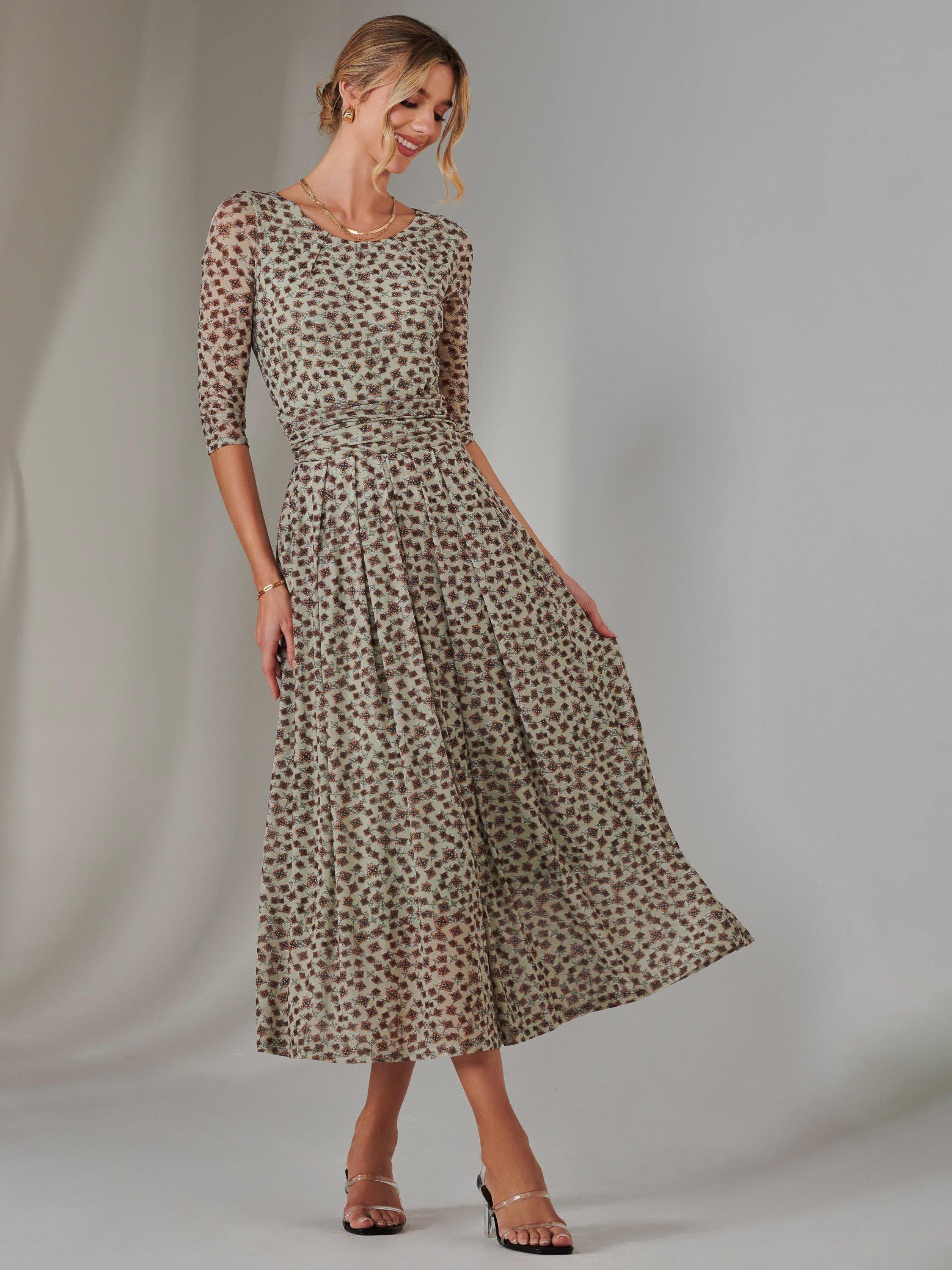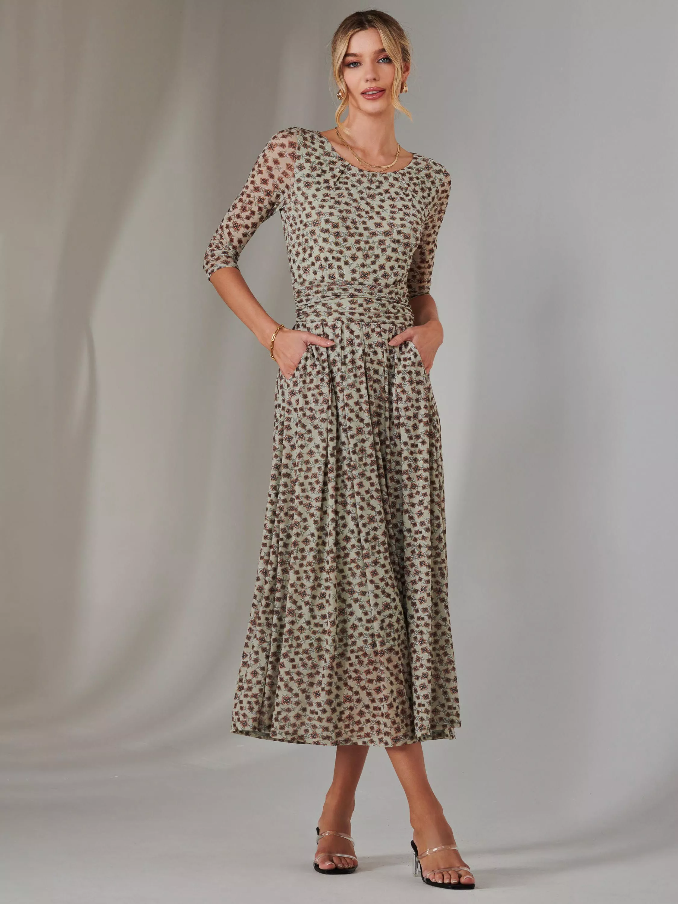 Featuring a charmful floral print on an airy mesh fabric, this dress exudes elegance. It's cut with 3/4 length sleeves and has a flattering ruched waistband and two handy side pockets.