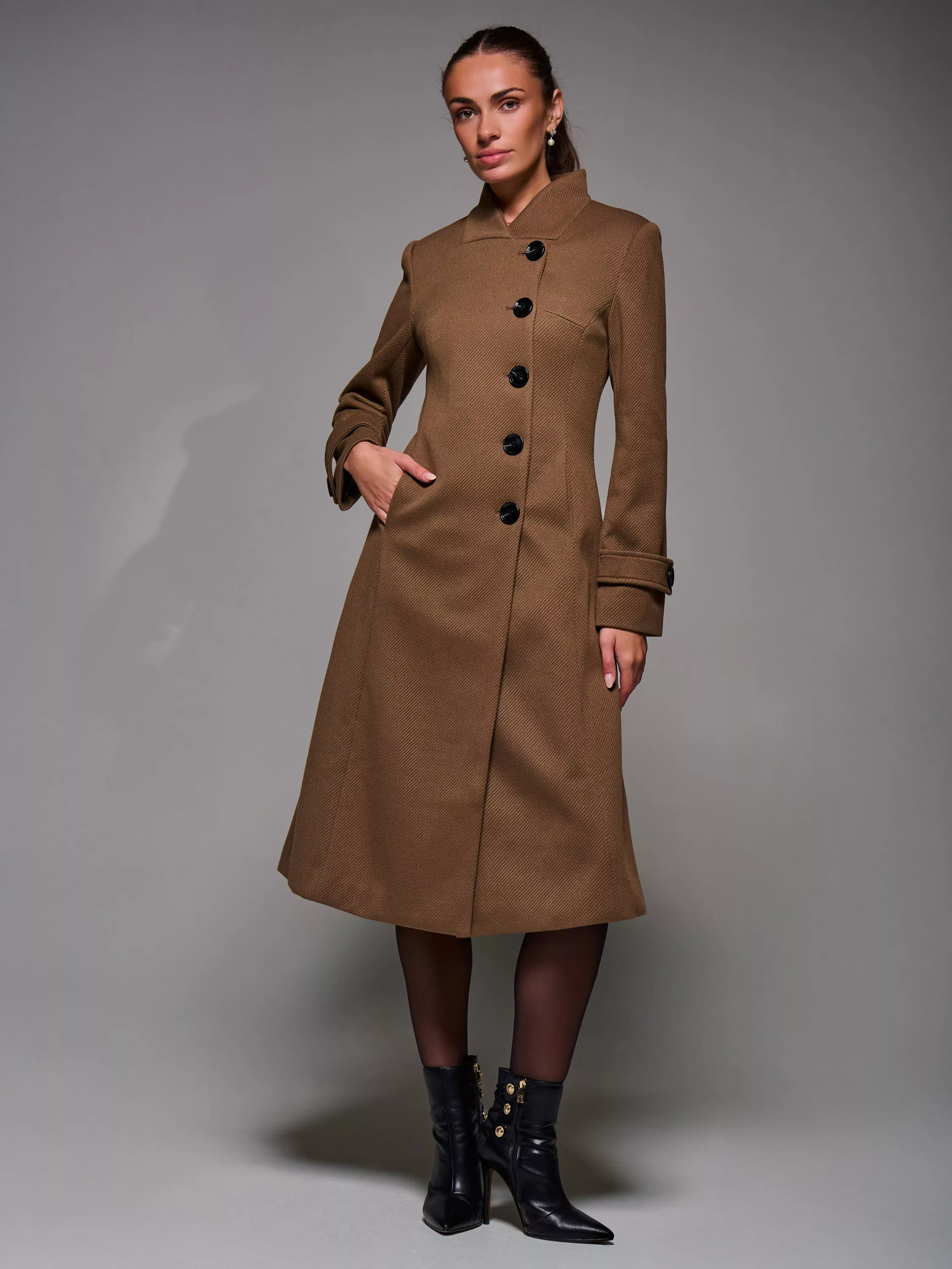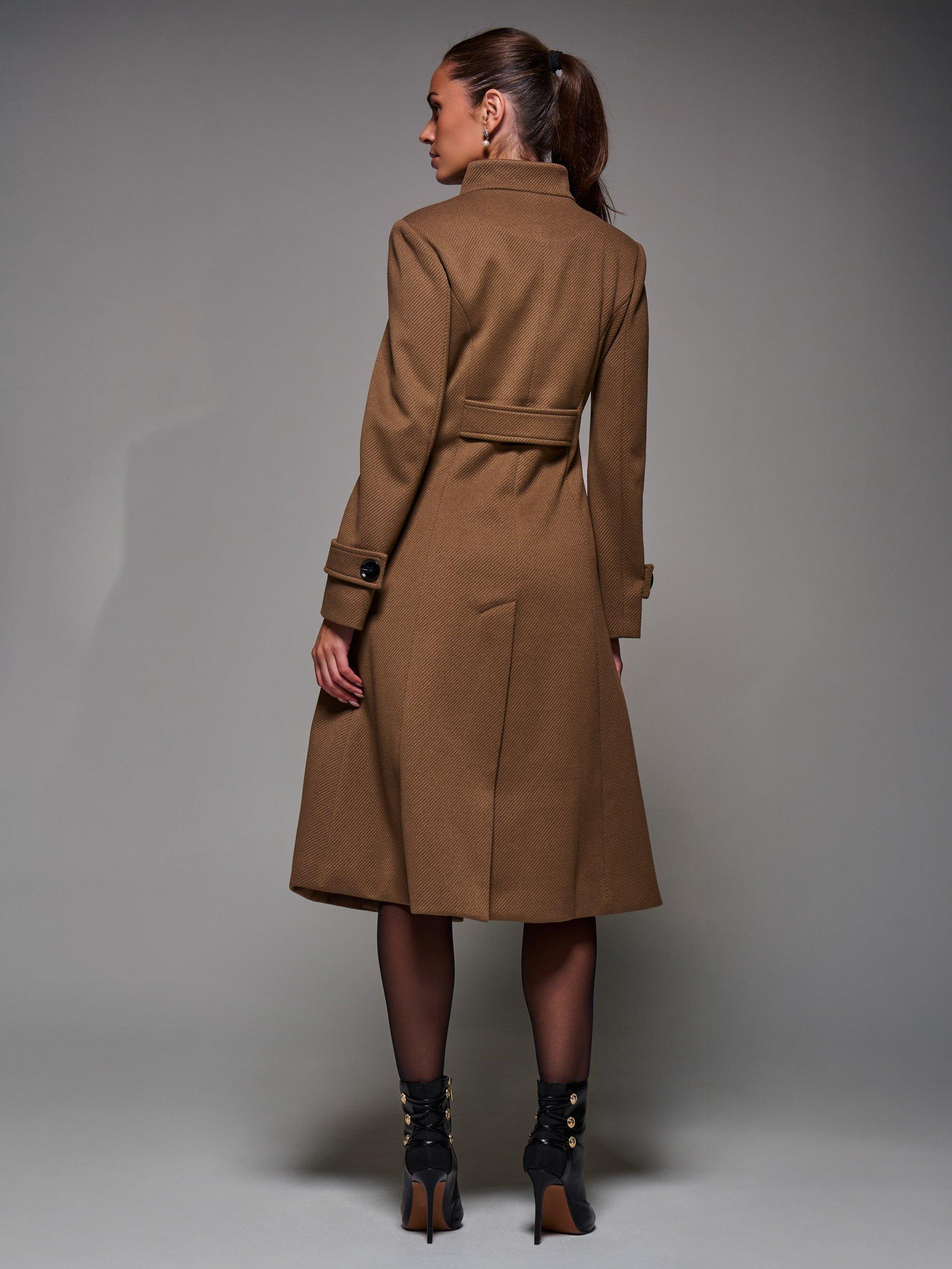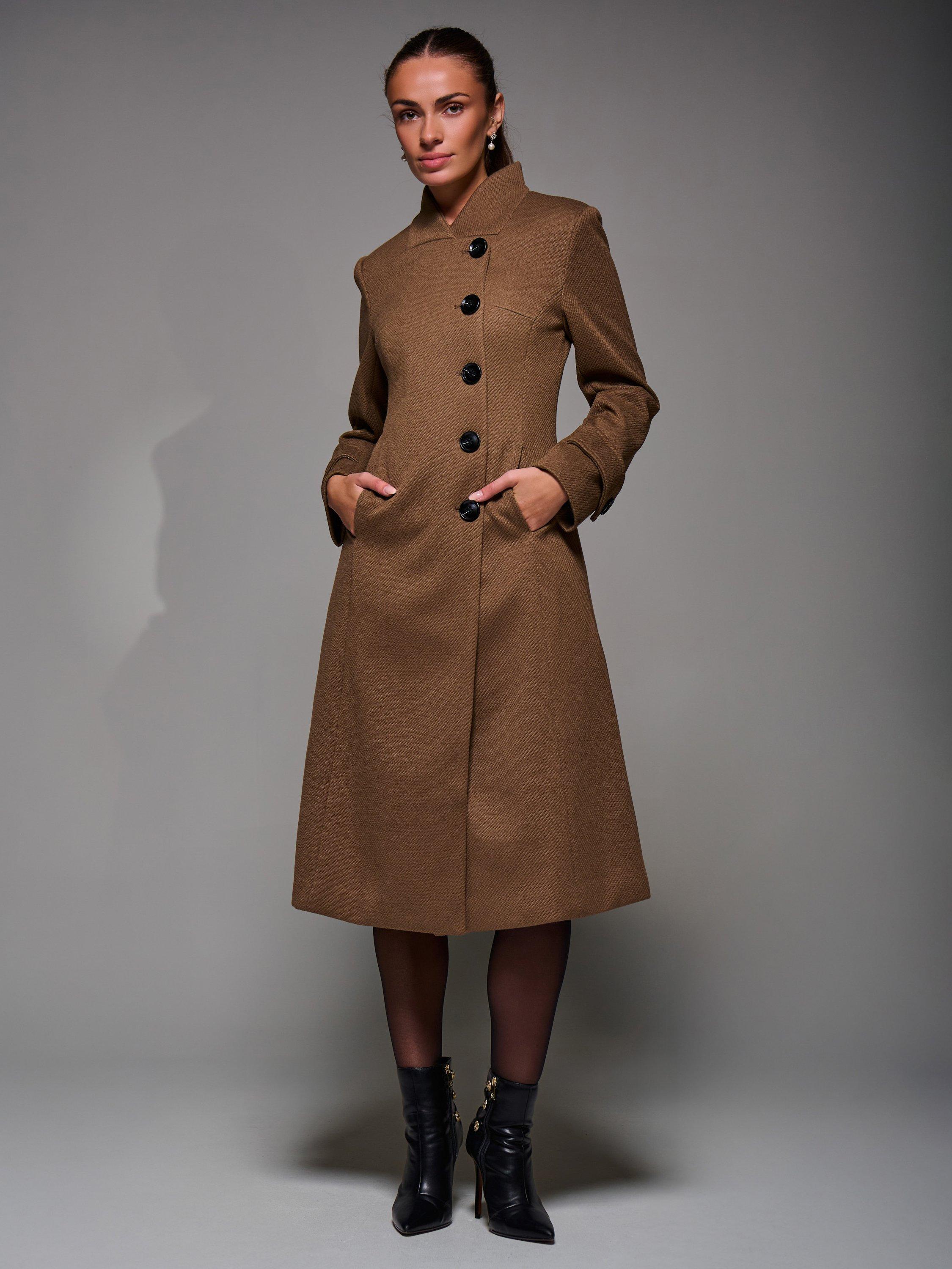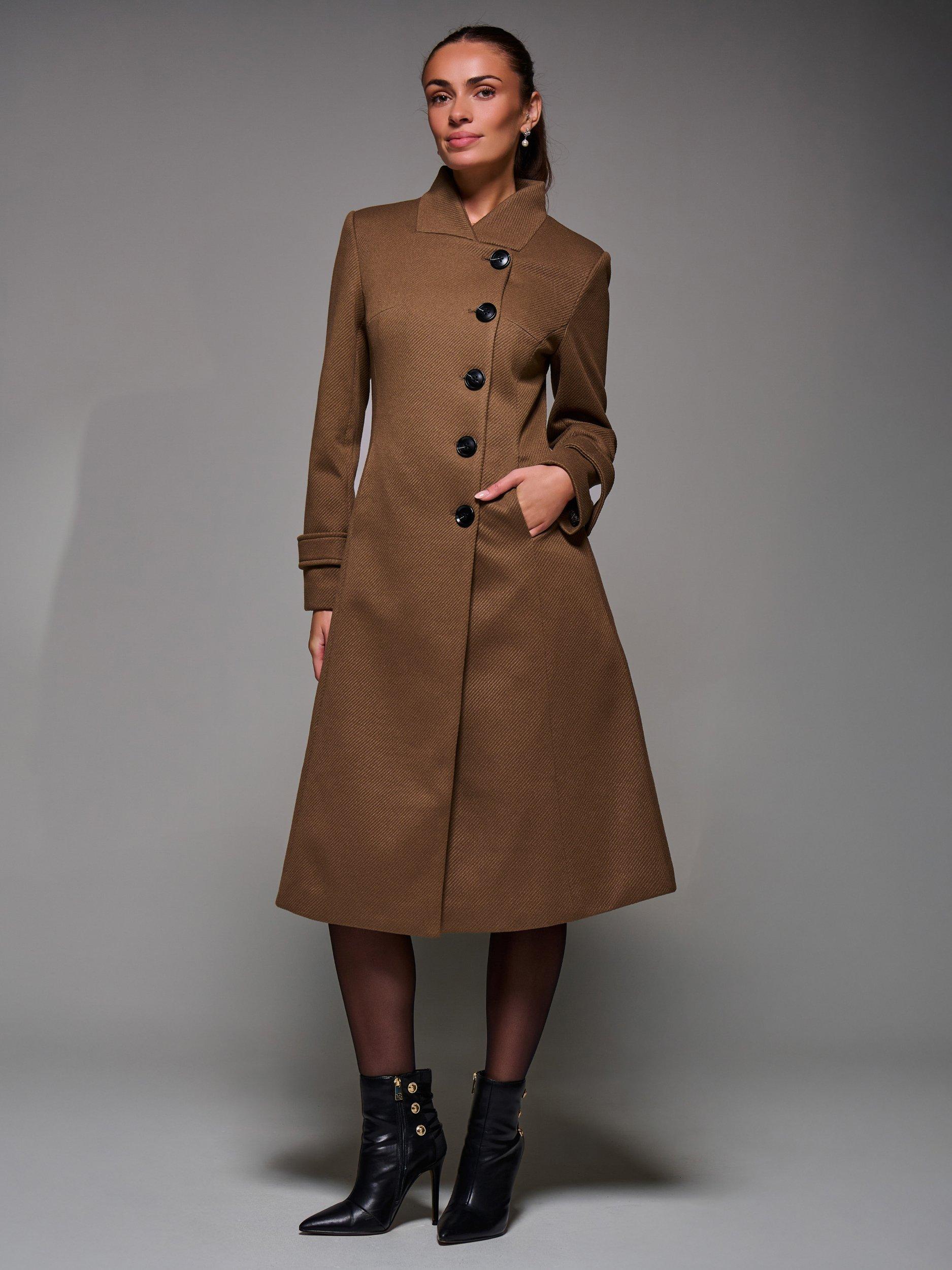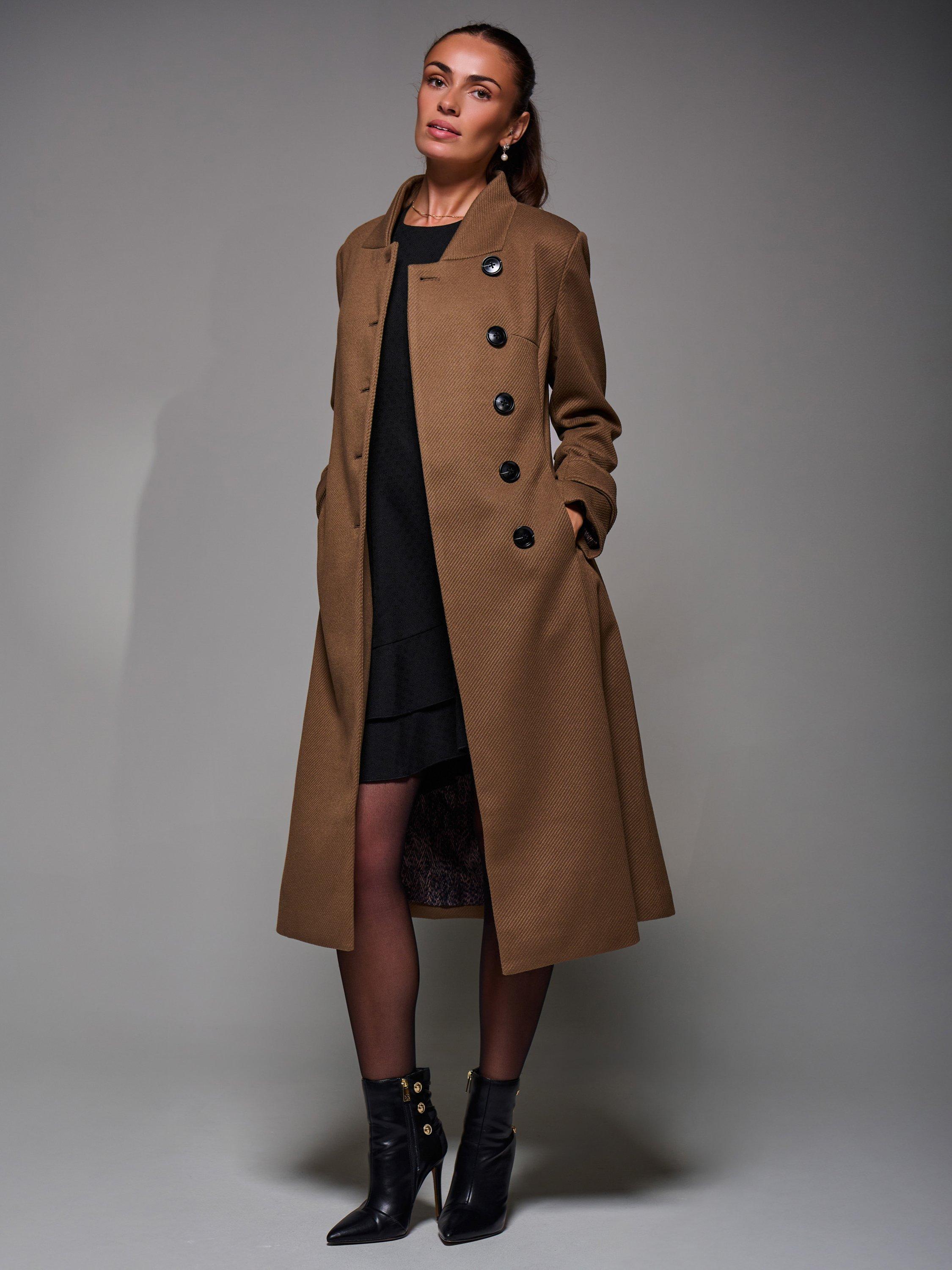The Buttoned Flare Coat by Jolie Moi is made from a textured, wool-like polyester fabric. Designed in an asymmetric fit and flare silhouette, it features button detailing at the front fastening and on the cuff straps. Complete with two discreet side pockets, an inner lining, and a longline cut. The coat is finished with panel detailing and a centre back slit for ease of movement.
