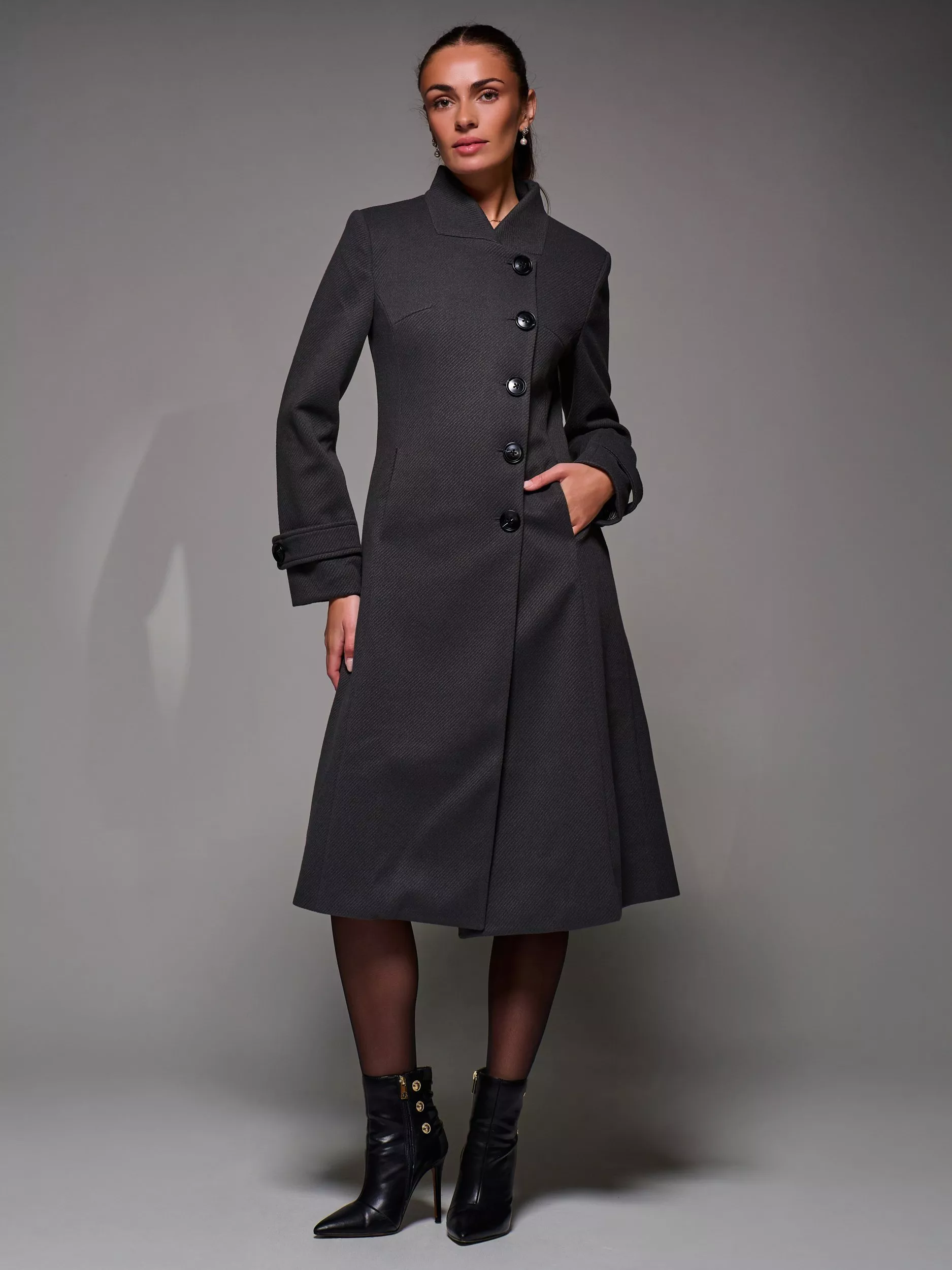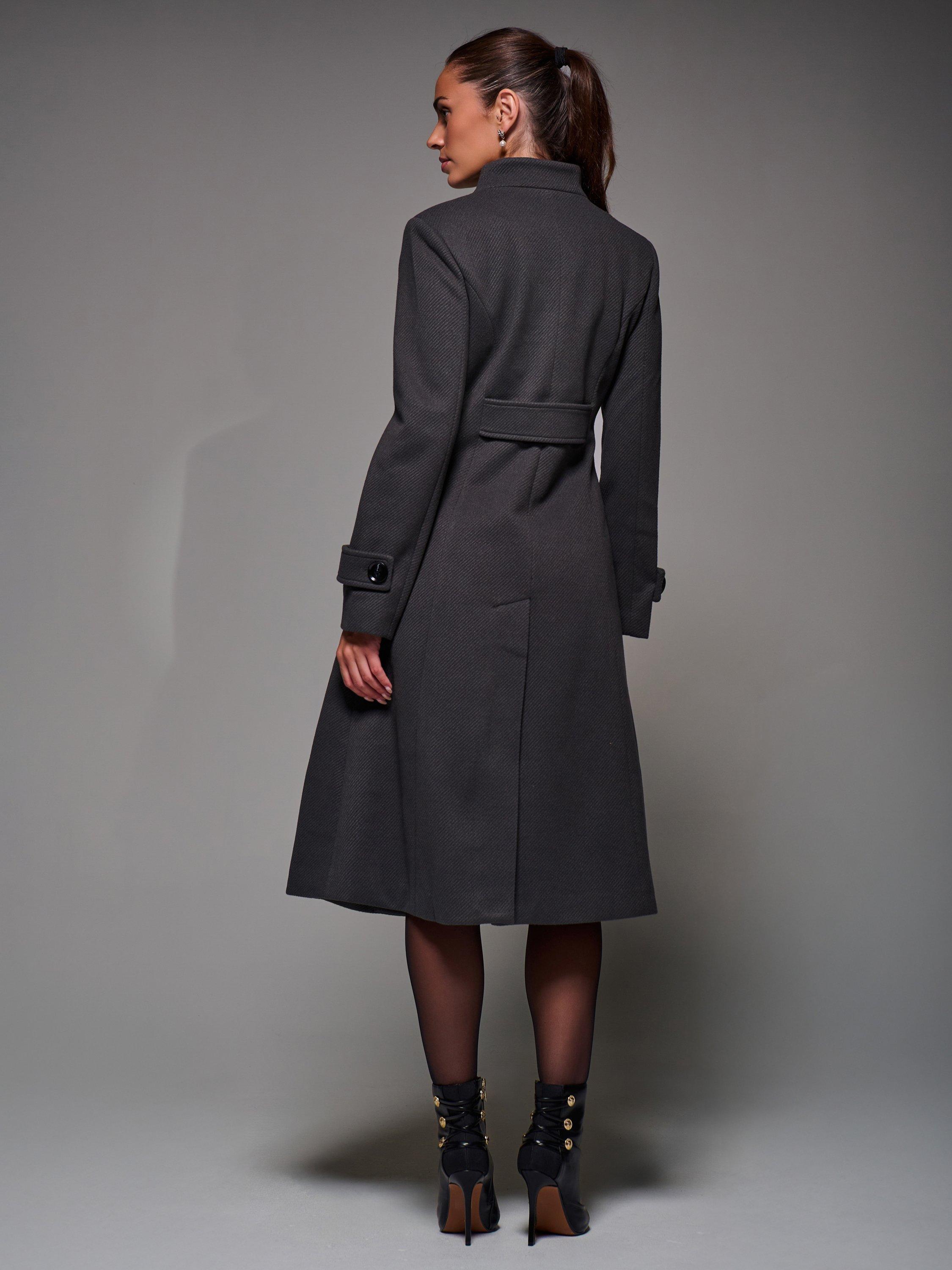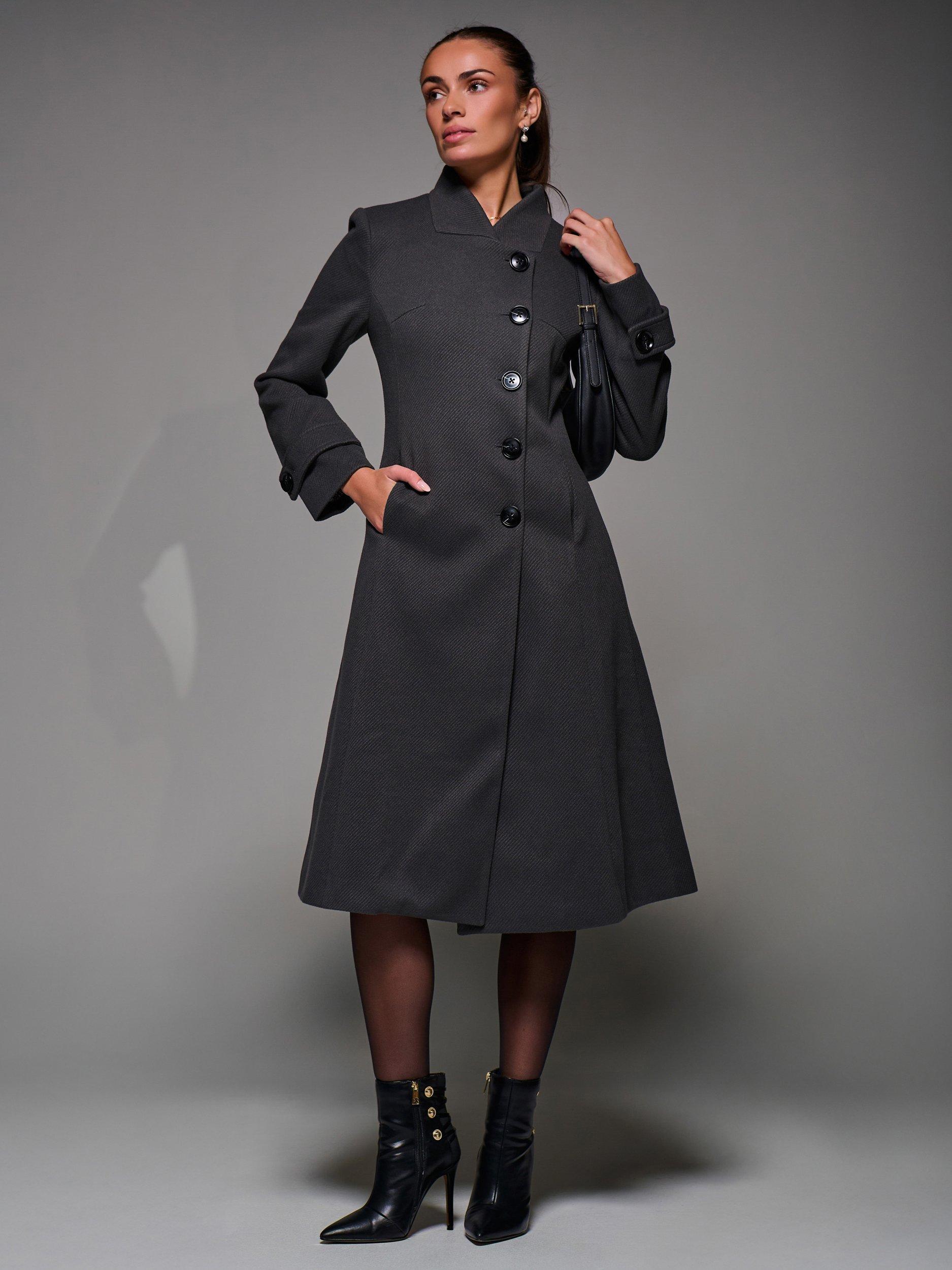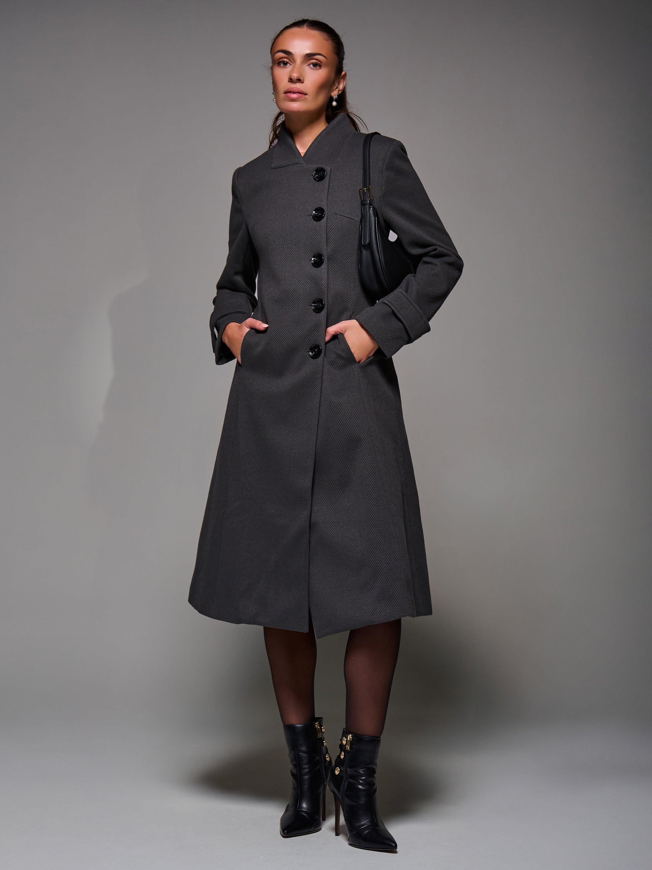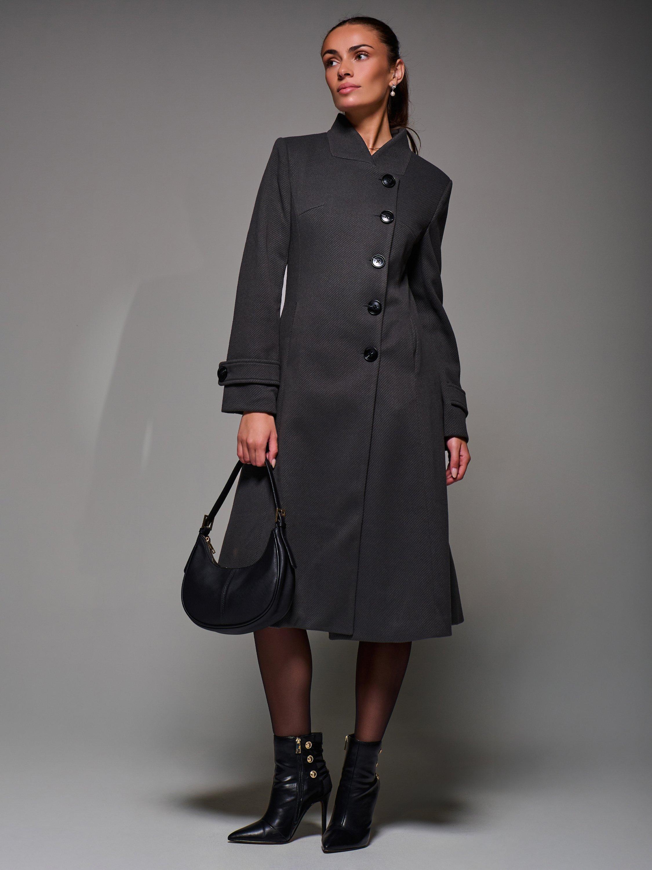 The Buttoned Flare Coat by Jolie Moi is made from a textured, wool-like polyester fabric. Designed in an asymmetric fit and flare silhouette, it features button detailing at the front fastening and on the cuff straps. Complete with two discreet side pockets, an inner lining, and a longline cut. The coat is finished with panel detailing and a centre back slit for ease of movement.