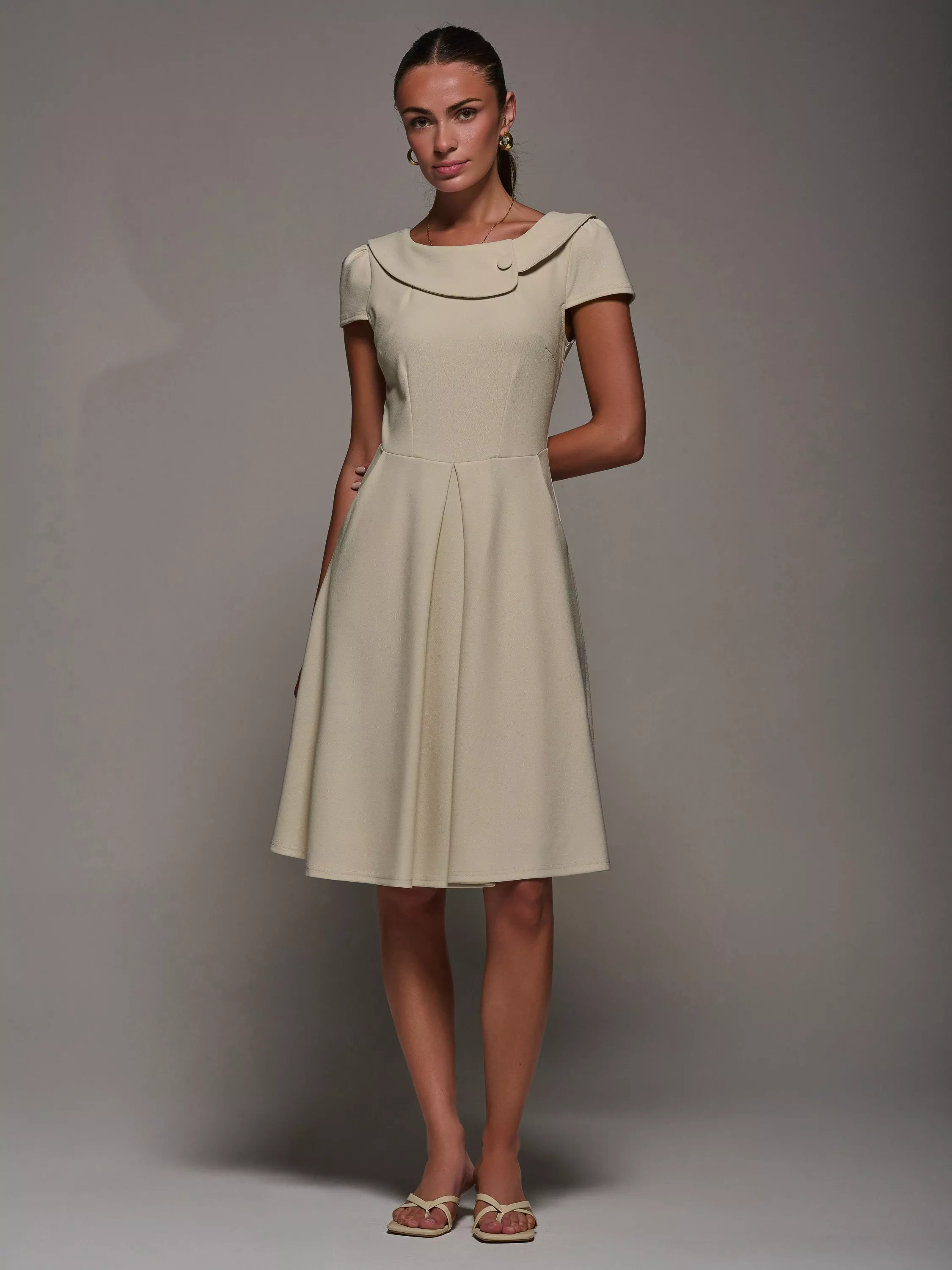 The Cap Sleeve Collar Dress by Jolie Moi brings vintage charm to modern elegance with its 50s‑inspired roll collar, gathered cap sleeves, flattering A‑line midi skirt, subtle front pleat, side pockets, and a concealed centre‑back zip for easy wear.