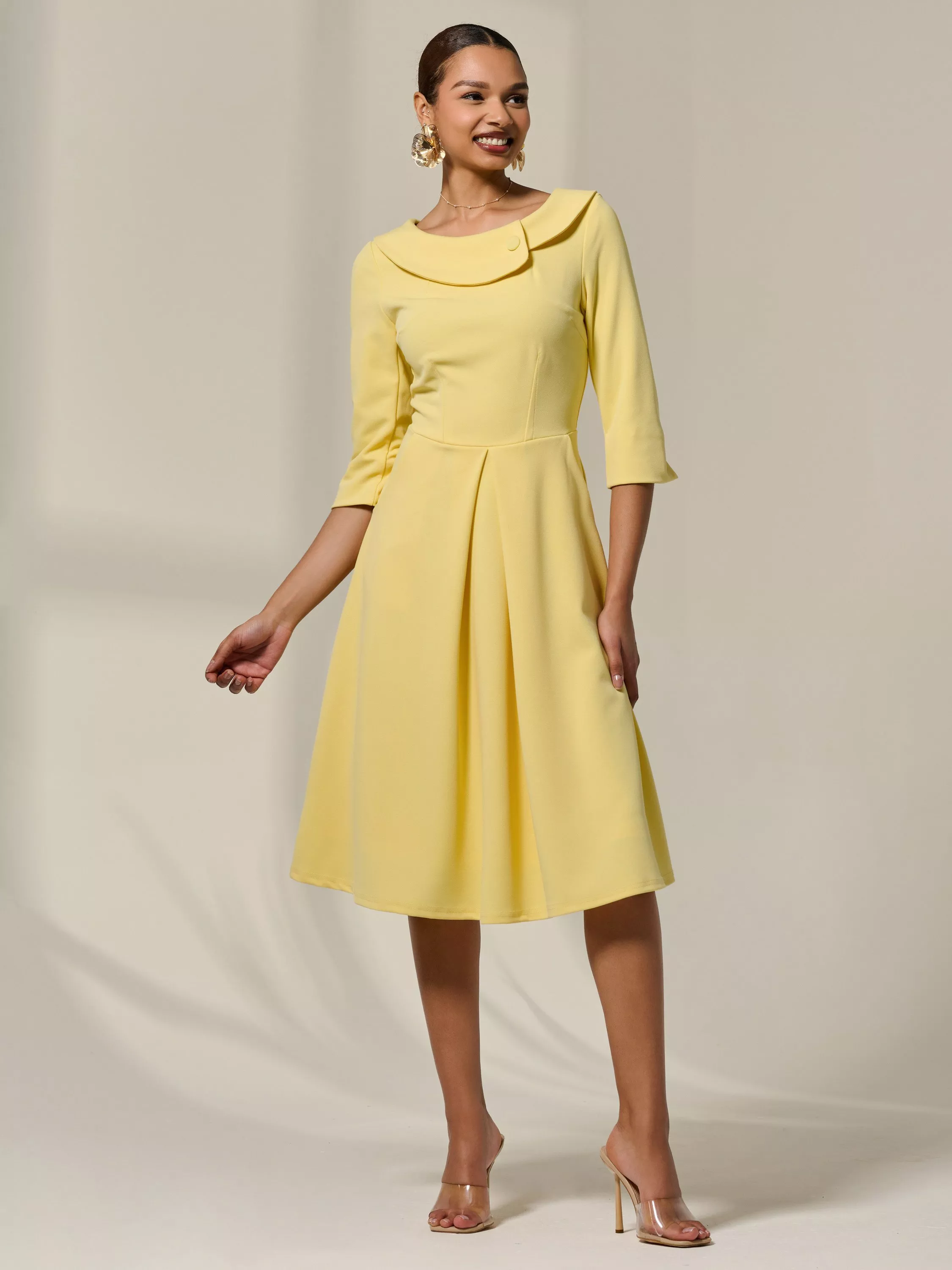 Channel your inner vintage elegance with the timeless 50's-inspired, 3/4 Sleeve Midi Dress from Jolie Moi, just in time for your spring summer wardrobe. The flattering round-collared neckline evokes timeless 50's glamour, while the 3/4 sleeves with chic slit detailing add a touch of sophistication. Designed to flatter, the flowy hem with a soft front pleat creates graceful movement, perfect for twirling through any occasion. It also features discreet front side pockets and a concealed zip for a seamless, elegant finish.