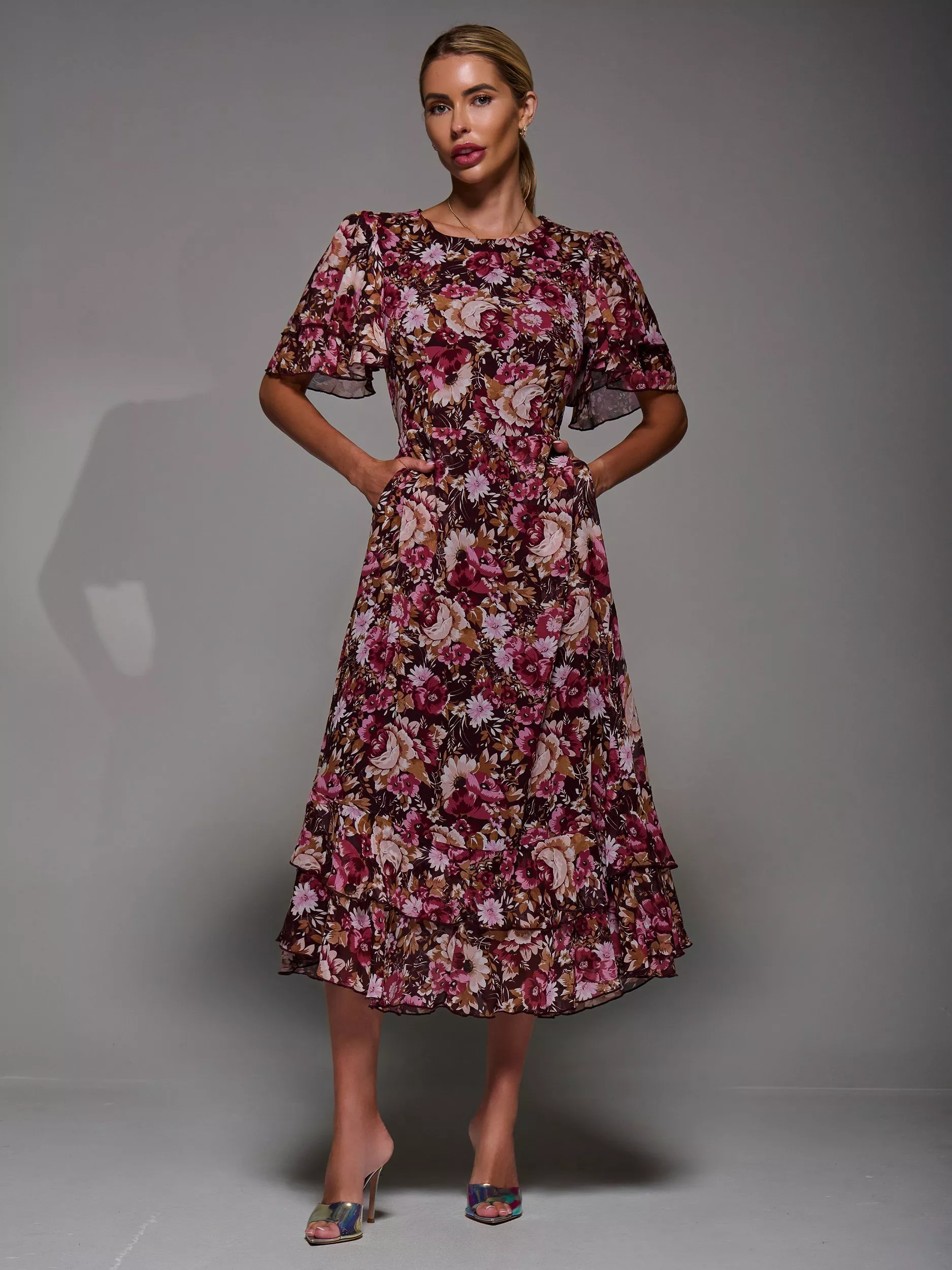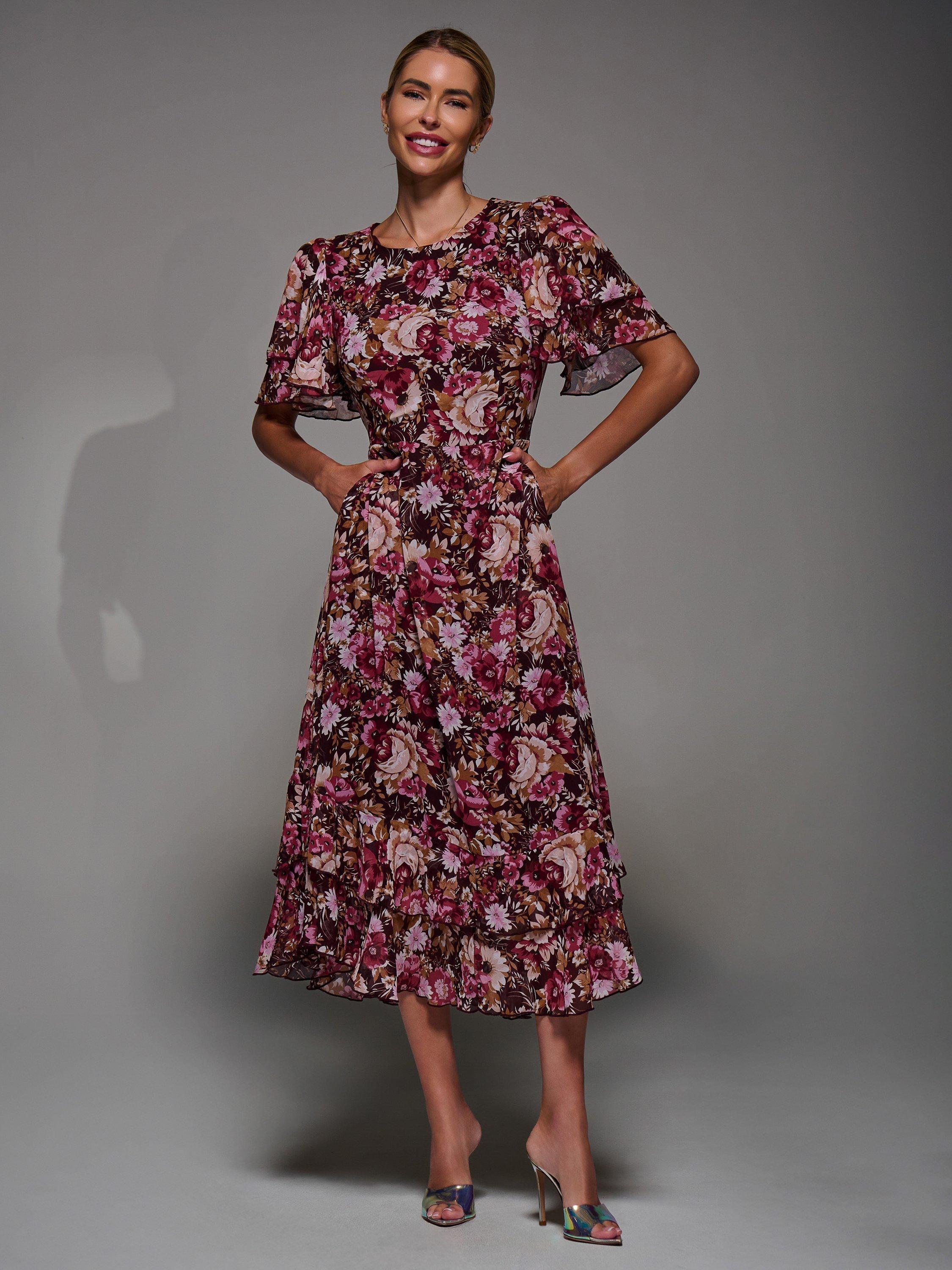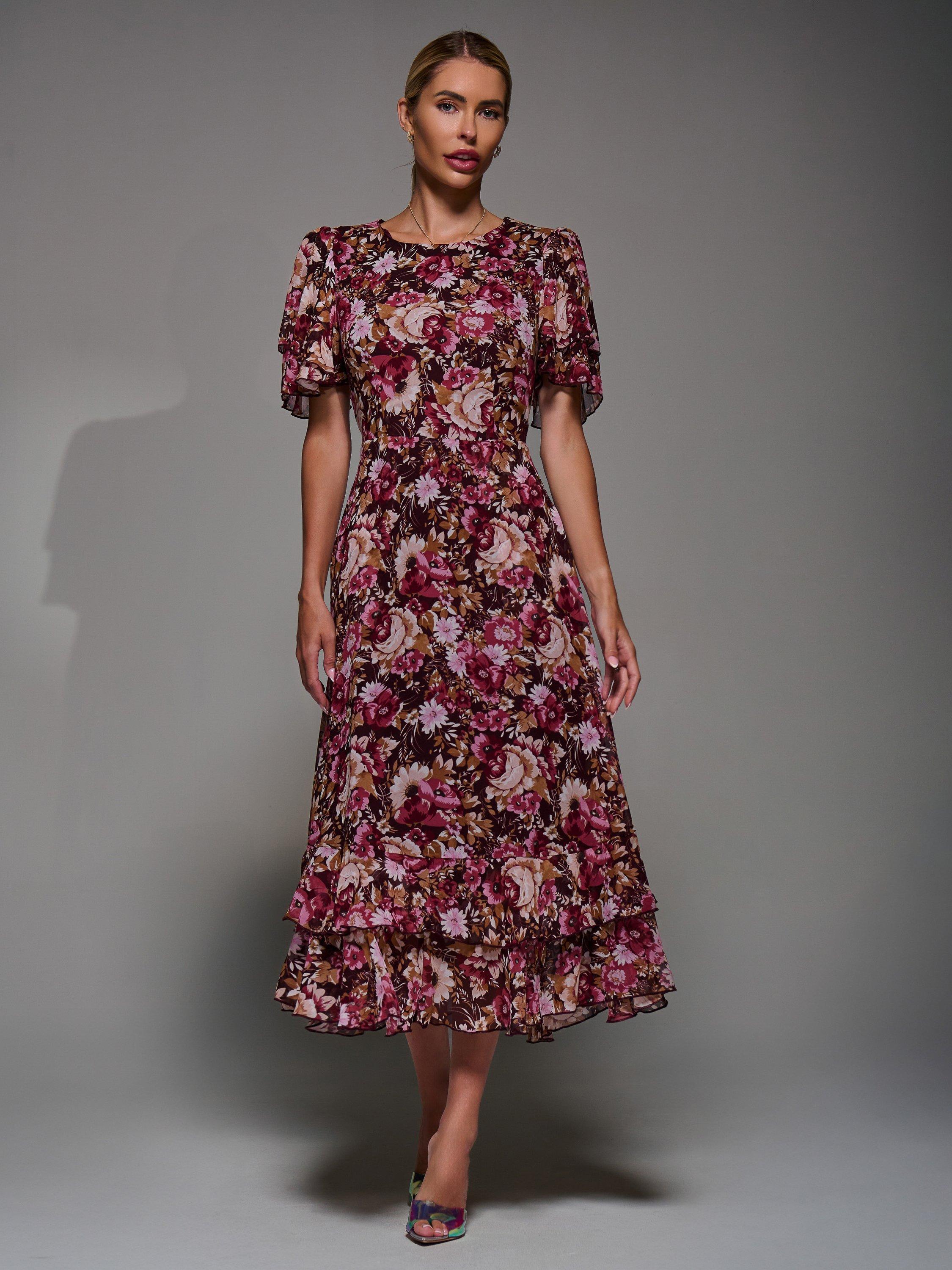 The Frill Detail Chiffon Midaxi Dress by Jolie Moi features a round neckline, a flattering tie waist, and a concealed zip at the back. Soft, 2-layer short flowy sleeves and a double-frilled hem add a graceful, romantic touch. Finished with practical side pockets, it’s a versatile piece perfect for both day and evening occasions.