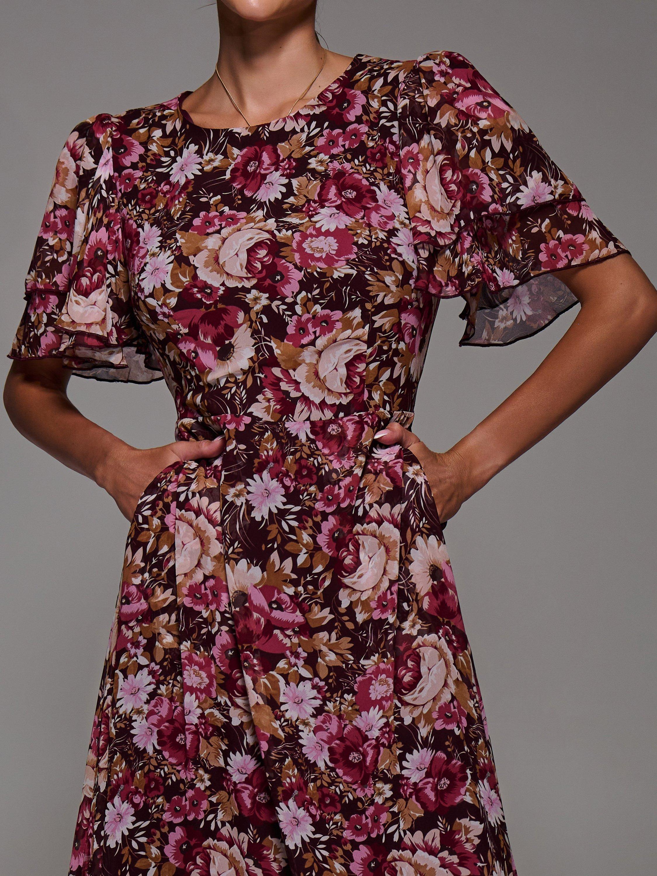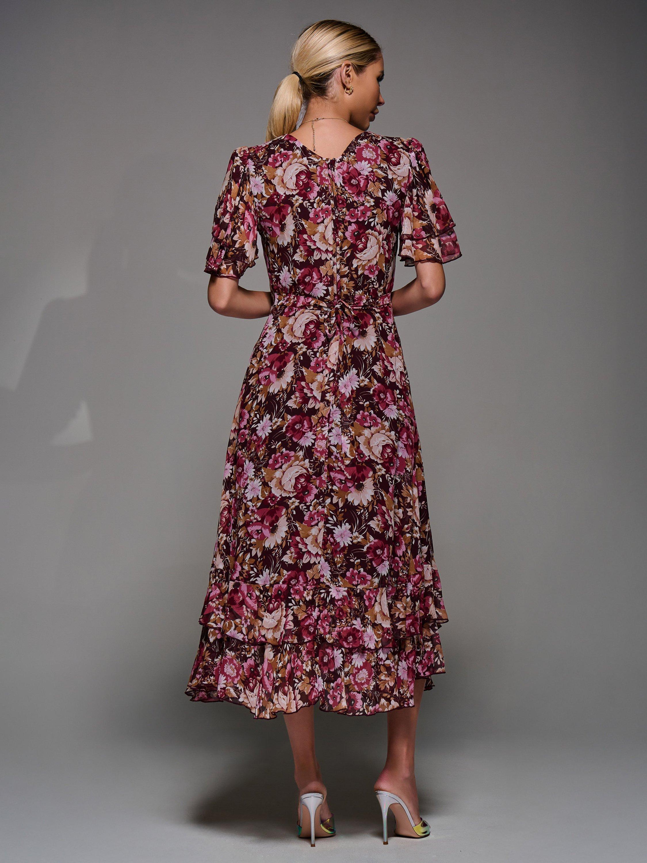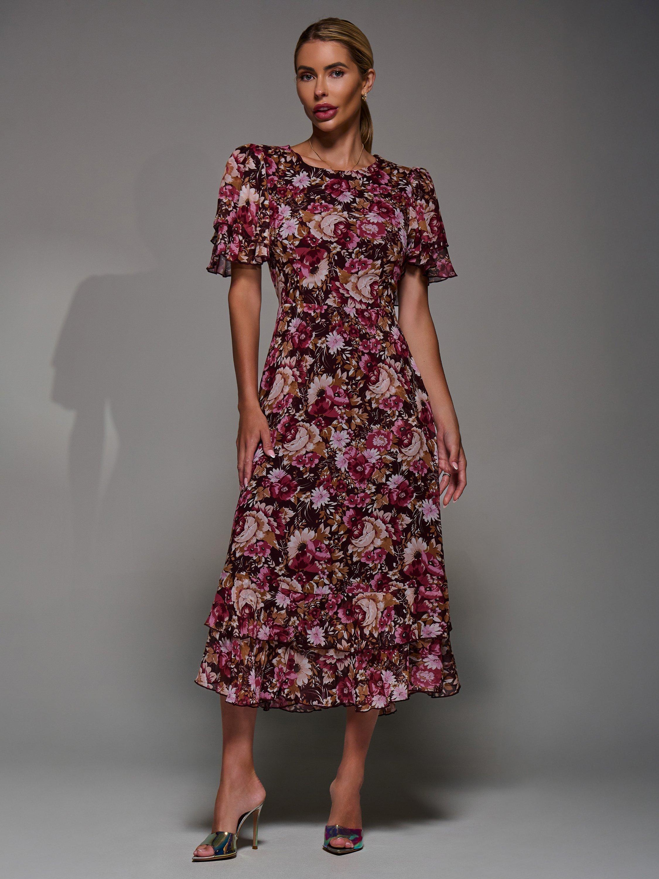 The Frill Detail Chiffon Midaxi Dress by Jolie Moi features a round neckline, a flattering tie waist, and a concealed zip at the back. Soft, 2-layer short flowy sleeves and a double-frilled hem add a graceful, romantic touch. Finished with practical side pockets, it’s a versatile piece perfect for both day and evening occasions.