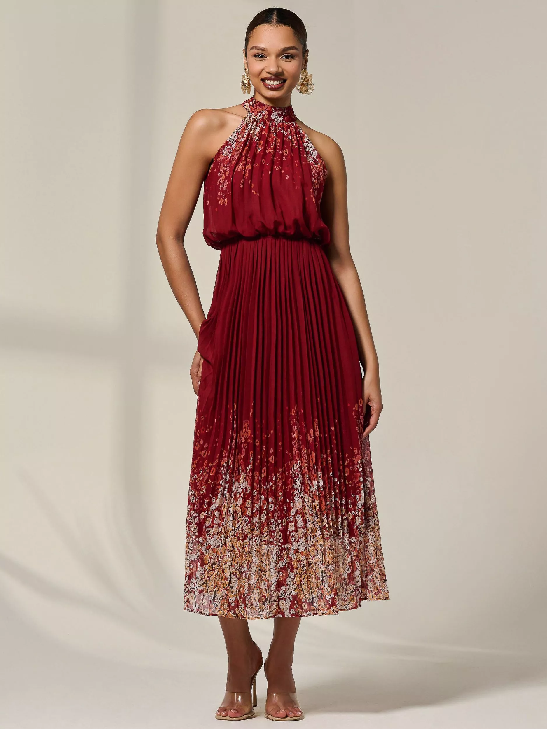 Fall in love with the Halterneck Maxi Dress from Jolie Moi. Combining elegance and femininity with an extremely flattering neckline and silhouette, this dress would be the perfect fit for any bridesmaid, as well as being an amazing summer piece. The pleated fabric combined with the use of floaty, floral print gives it an elevated look, whilst still having an air of simplicity and sophisticated style. Attention to detail is key in this piece, with its tie neck detail being the perfect addition to this sleeveless maxi dress.