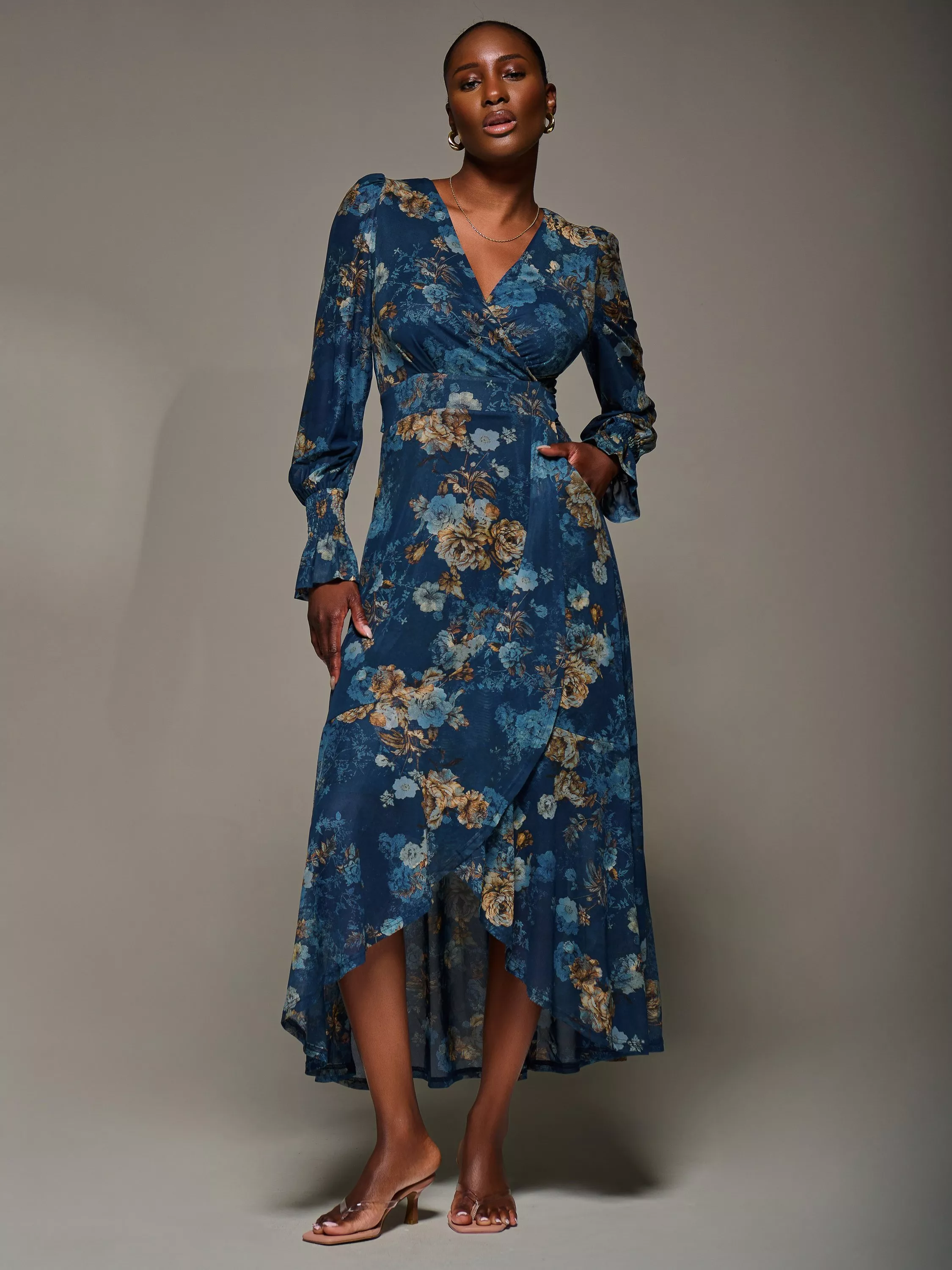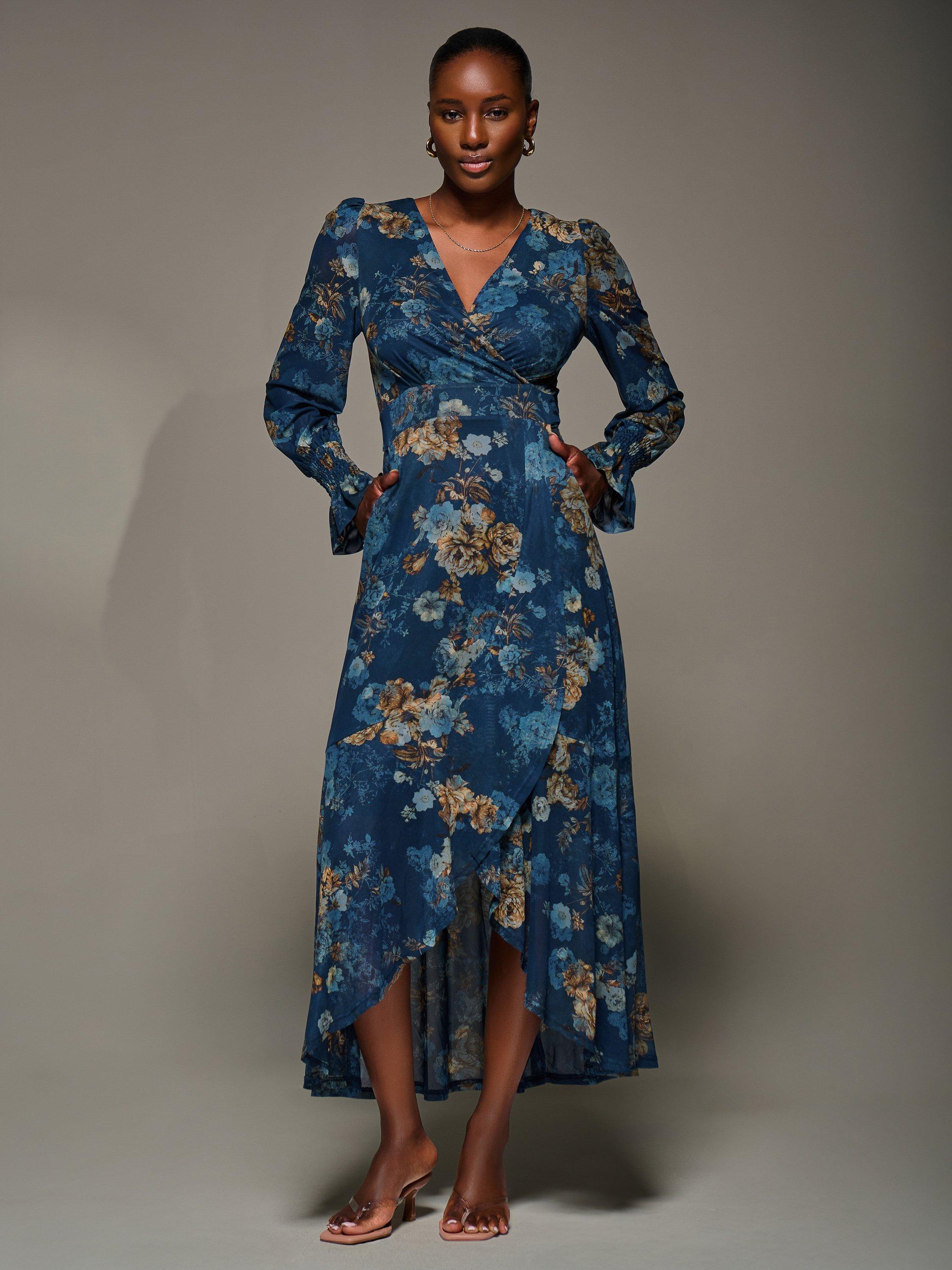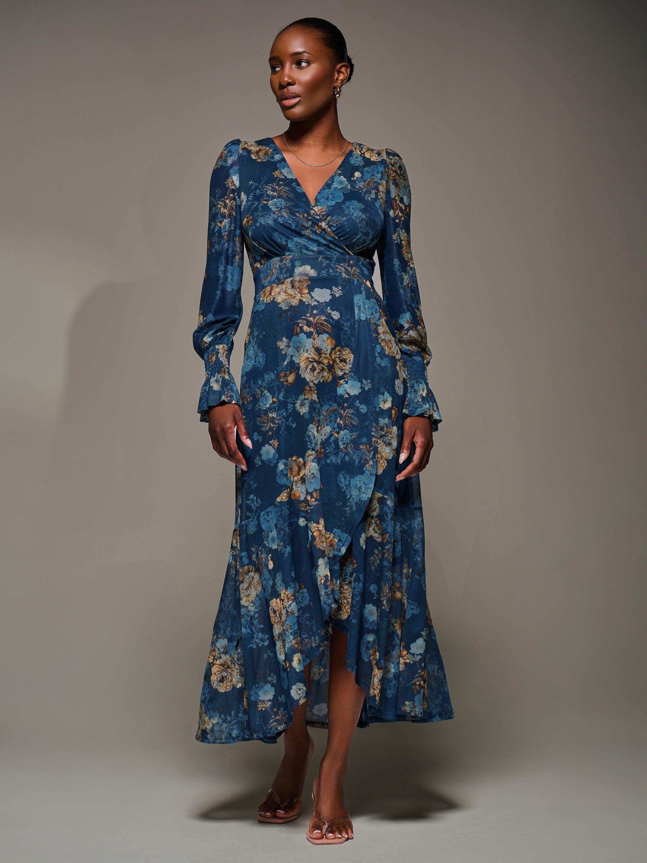 The Long Sleeve Frill Hem Mesh Maxi Dress by Jolie Moi features a wrap-style front with a V-neckline, thick waistband, and two side pockets. The long sleeves have shirred cuffs that flare out, and the wrap-style skirt is detailed with frills starting at the waistband and extending to the hem, forming a shorter front length.