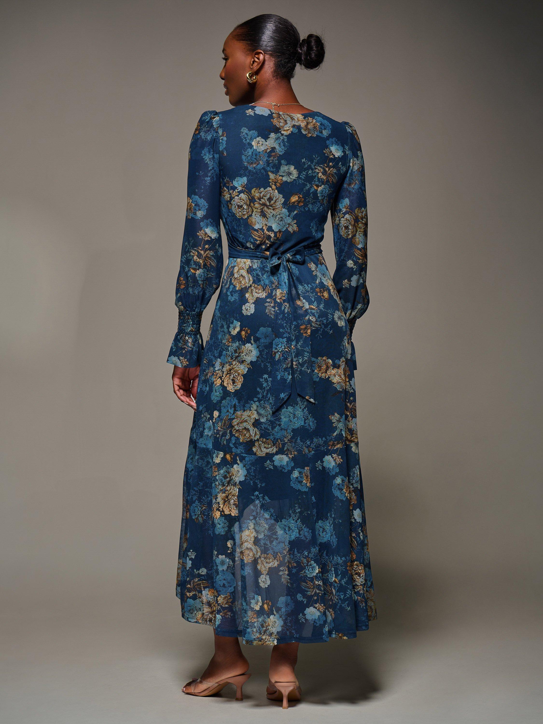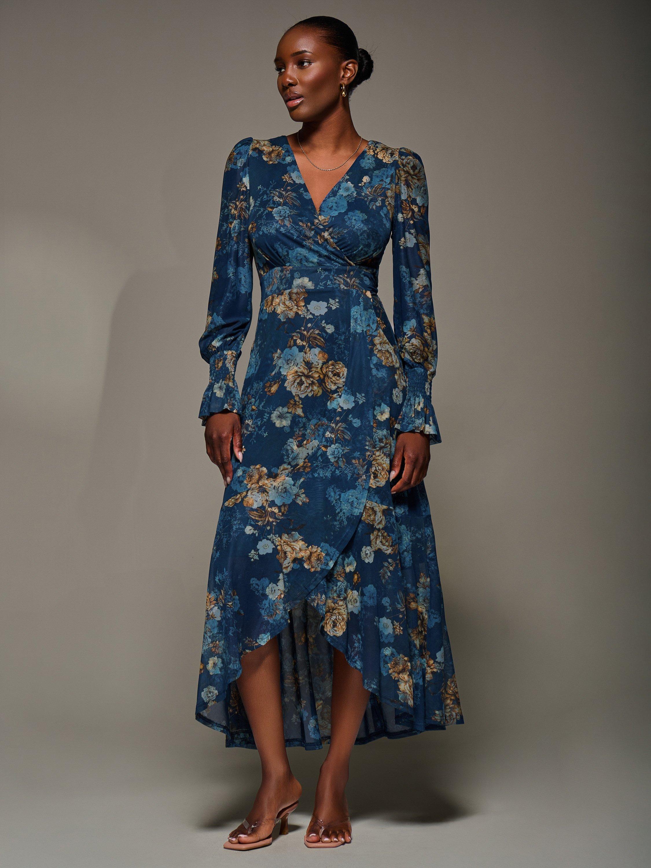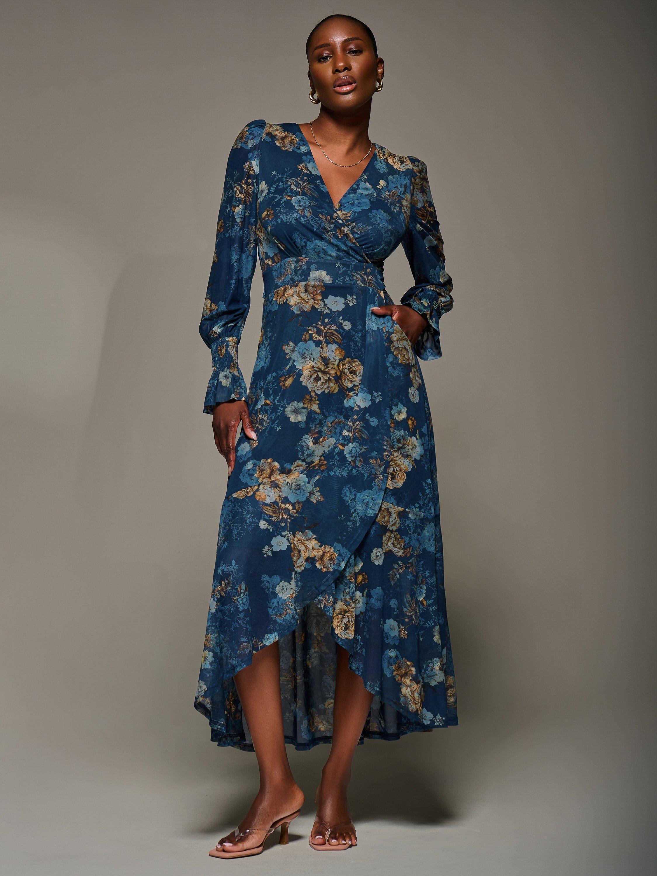 The Long Sleeve Frill Hem Mesh Maxi Dress by Jolie Moi features a wrap-style front with a V-neckline, thick waistband, and two side pockets. The long sleeves have shirred cuffs that flare out, and the wrap-style skirt is detailed with frills starting at the waistband and extending to the hem, forming a shorter front length.