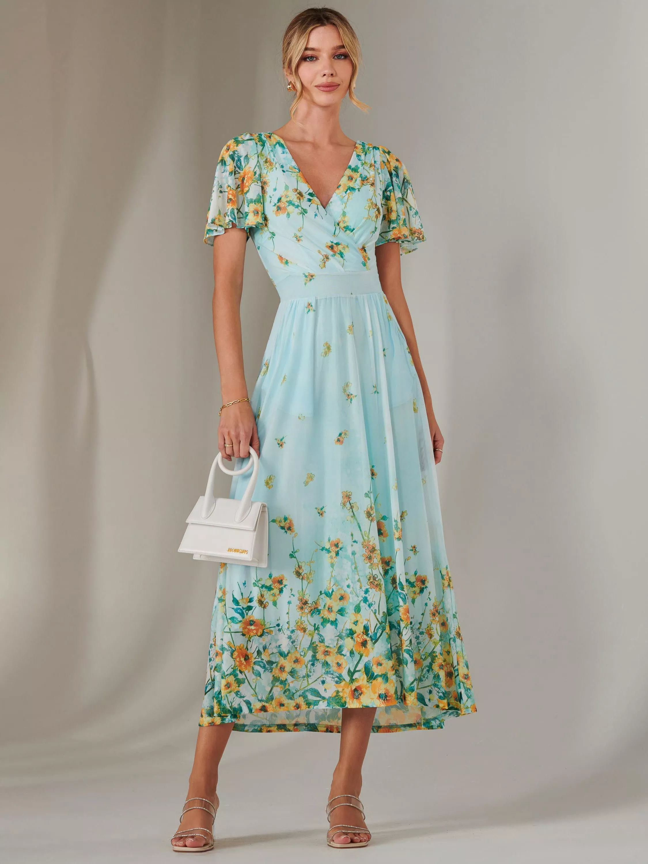 Perfect for weddings, garden parties or other special occasions, this elegant maxi dress is cut in a flattering wrap shape. Easy to slip on thanks to a zip-free design, it features a delicate floral pattern, a V-shaped neckline and a soft lining. The short mesh sleeves add a whimsical finishing touch.