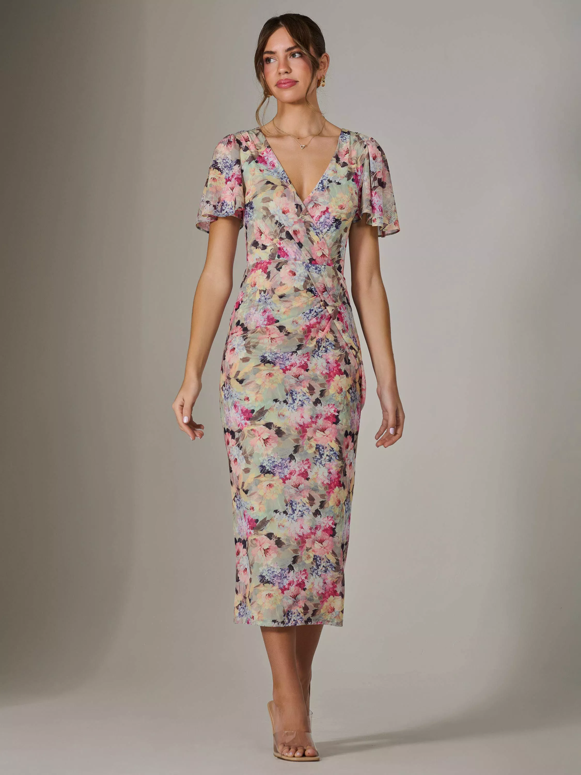 Flaunt in floral with this beautiful Mesh Short Sleeve Midi Dress by Jolie Moi. Crafted from figure-flattering mesh bodycon material, this dress hugs your curves for a sleek, streamlined look. The midi-length design is complemented by a flattering V-neckline and short angel sleeves, adding a touch of softness to its sculpted silhouette. Ideal for any fancy occasion, this dress is fully lined for complete comfort. Simply finish the look by pairing it with stylish heels and a small clutch bag to make a grand entrance.