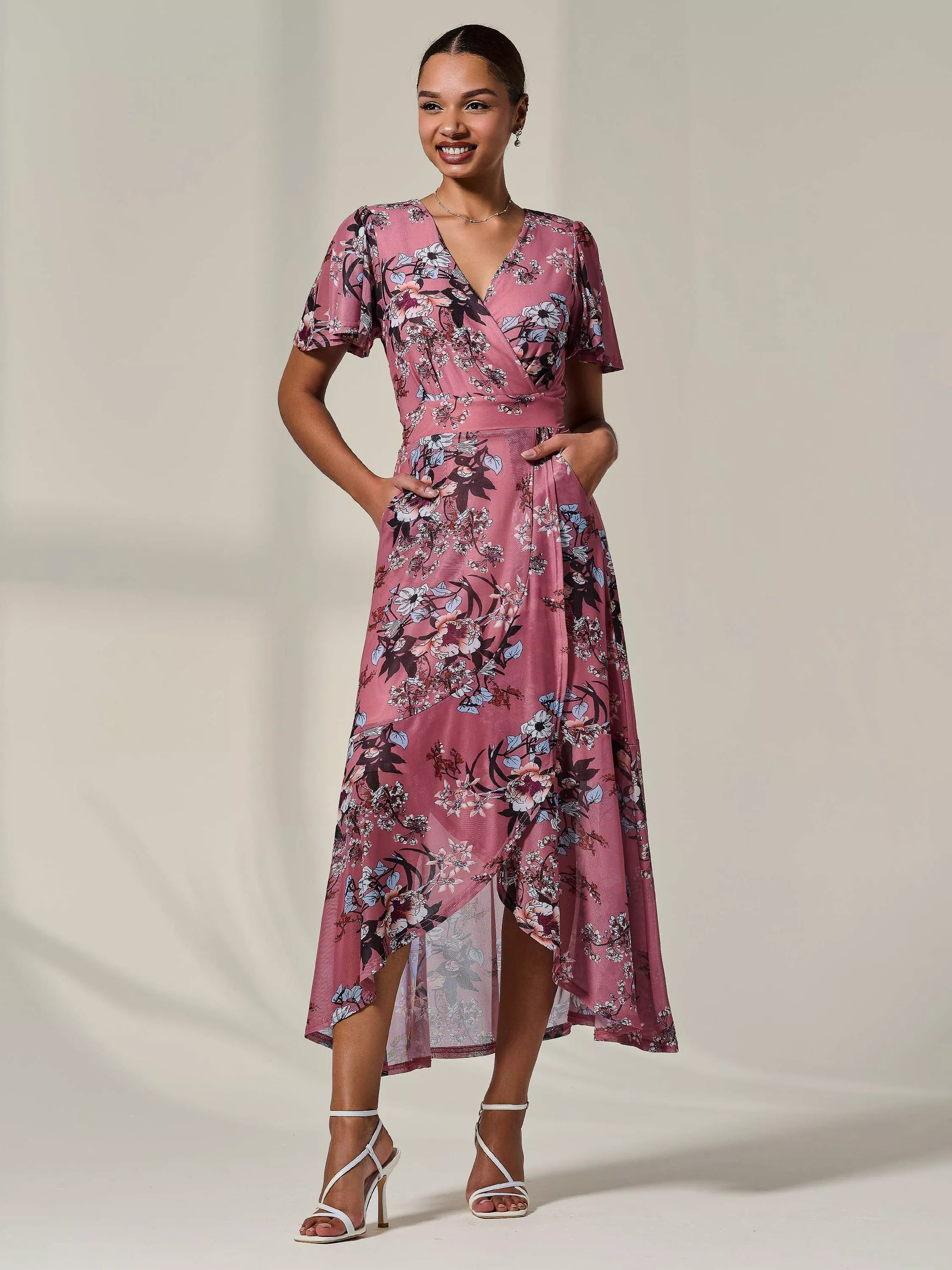 This short sleeve maxi dress by Jolie Moi features a wrap over neckline and a fab, floral pattern.