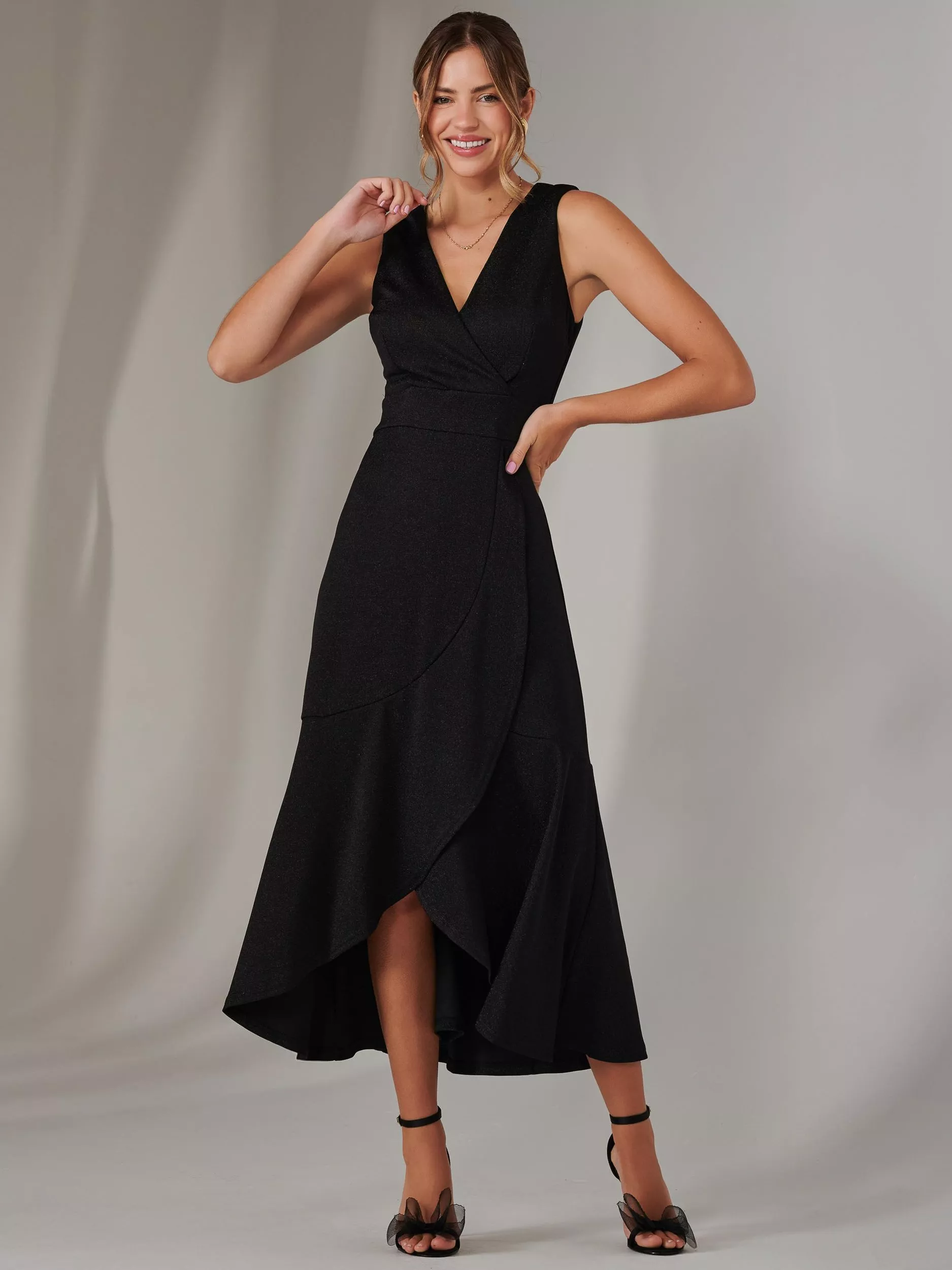 Stand out in the Frill Maxi Dress by Jolie Moi, with its form fitting bodice which features a faux wrap v neckline and flattering waistband detail. The shimmery fabric is guaranteed to turn heads, as well as its ruffle skirt which cascades down to an elegant maxi length. This sleeveless style features a concealed zip fastening that is discreet whilst making this dress easy to wear, perfect for evening events or occasions where you want feel special.