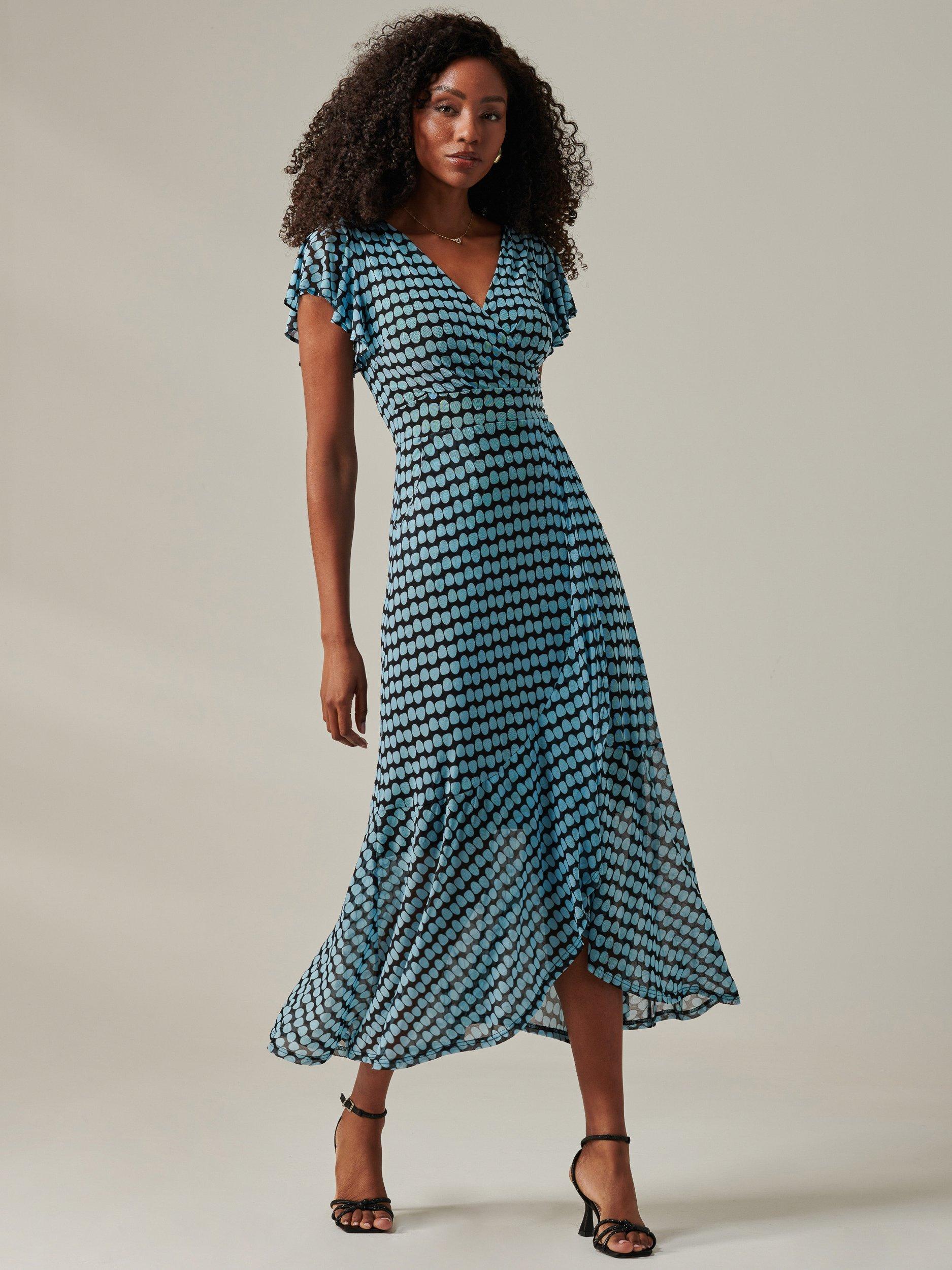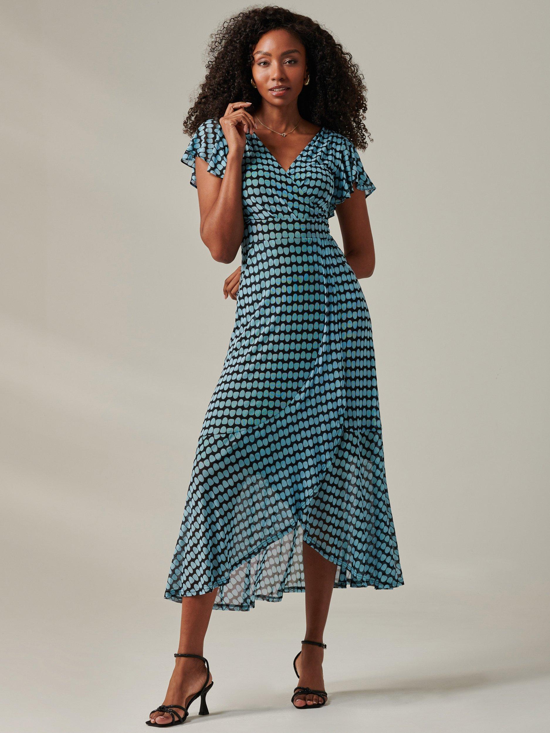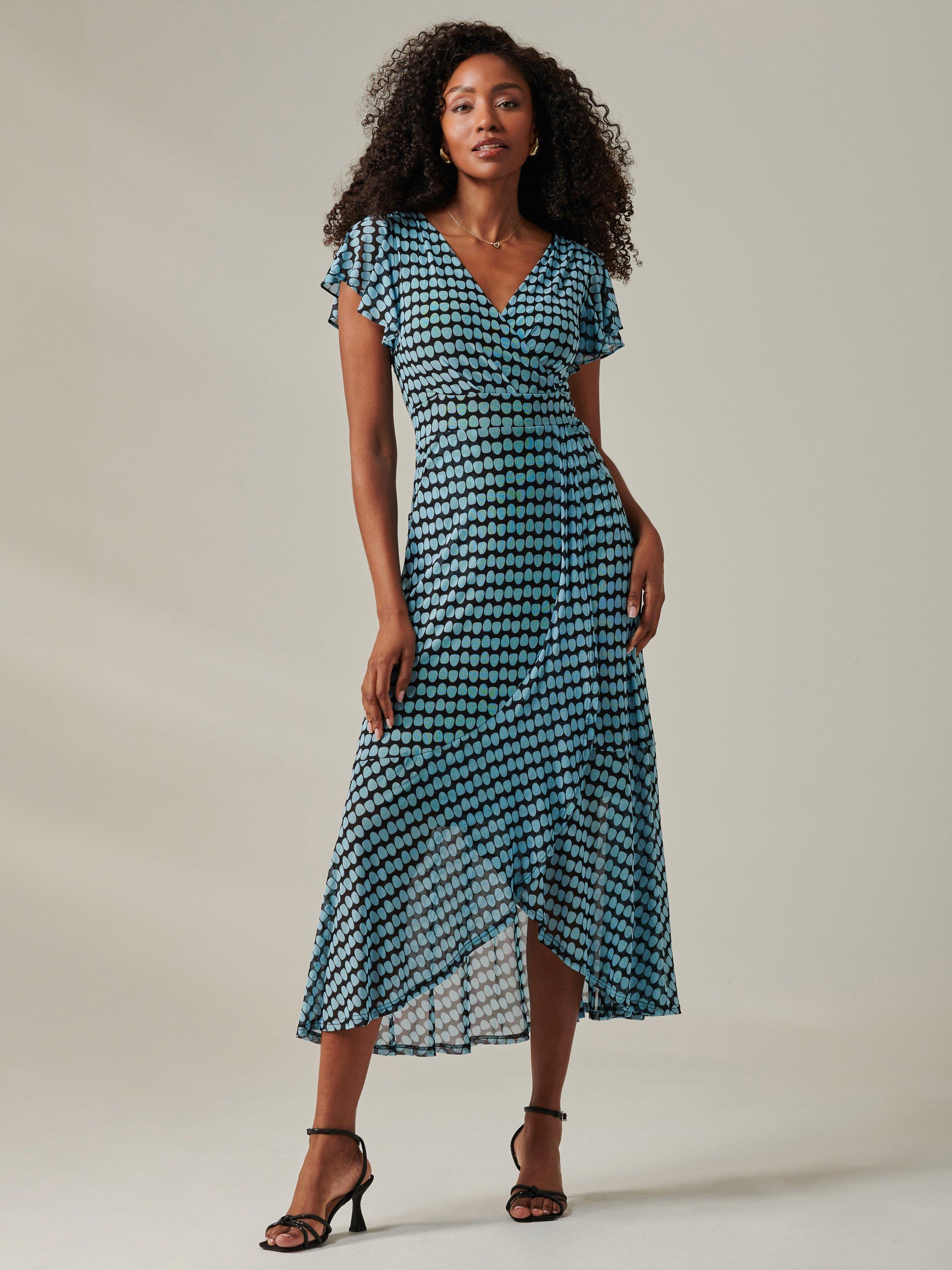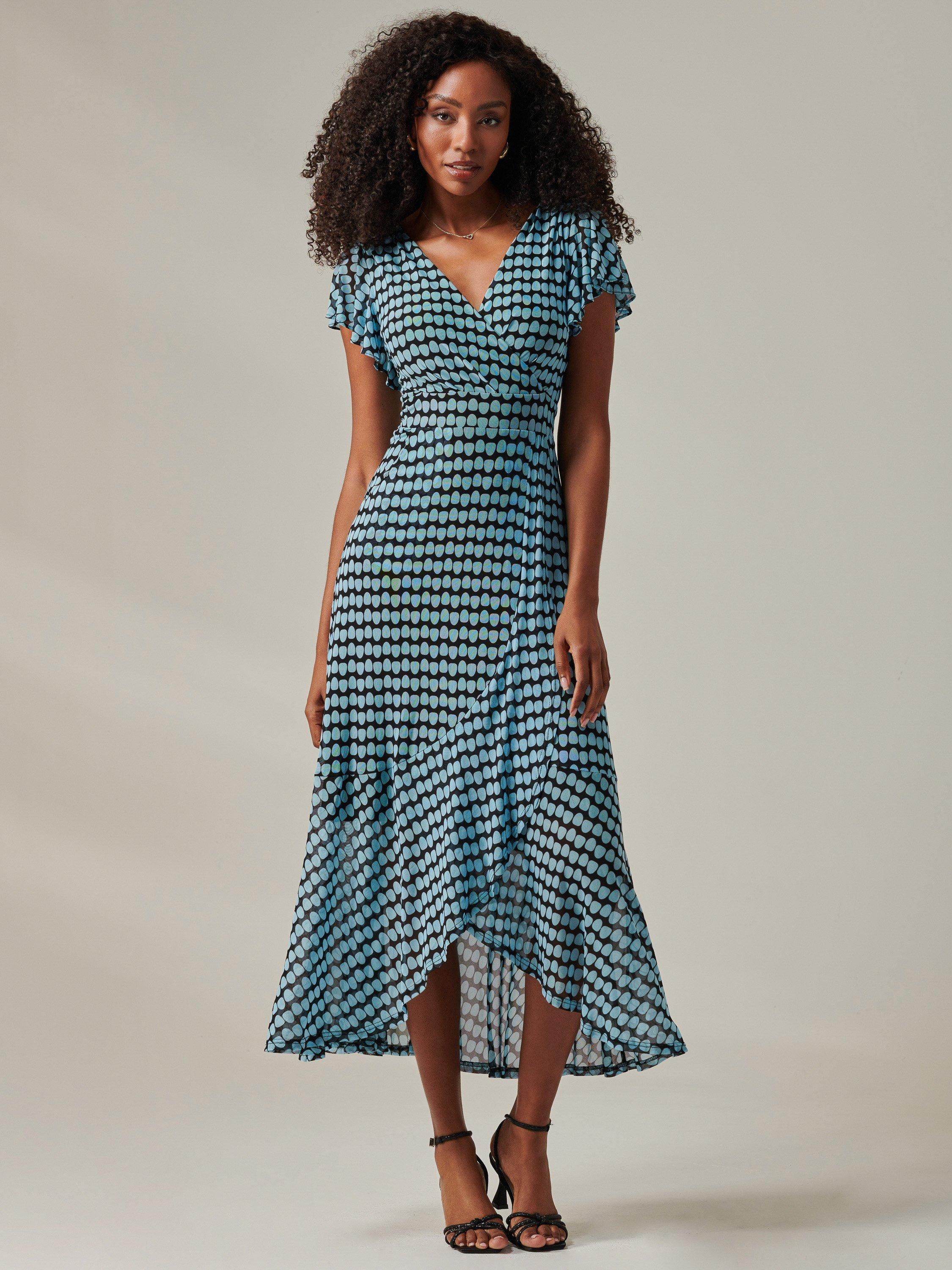 The Geo Print Mesh Maxi Dress effortlessly blends playful charm with sophisticated style. Crafted from lightweight mesh fabric,is dress showcases a vibrant spotted print that exudes fun and sophistication.The design features short angel sleeves for a delicate look and a wrap V-neckline that flatters the bust. A concealed back zip ensures a smooth and streamlined fit. Ideal for both casual and special occasions.