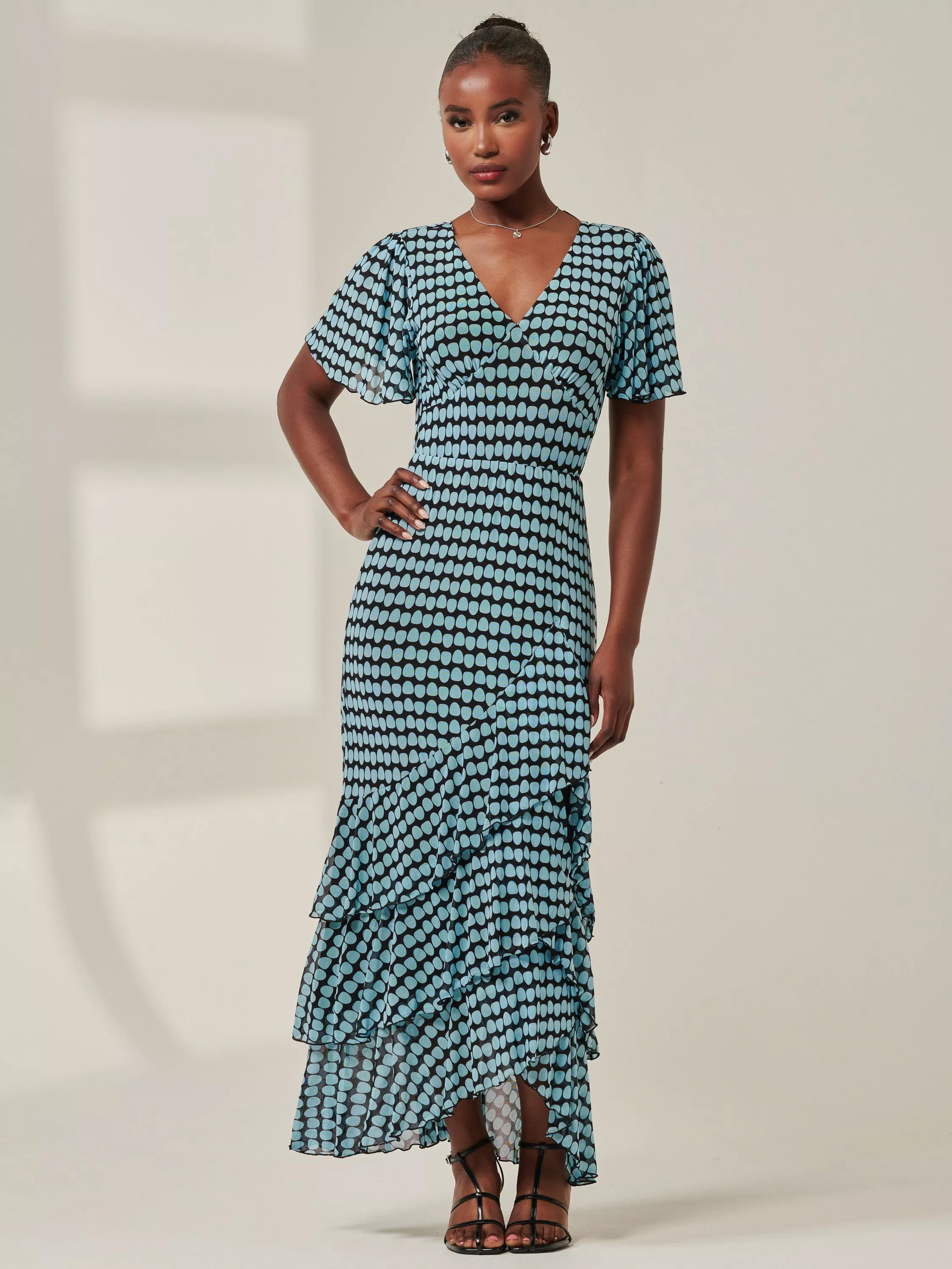 Make a bold statement with the Geo Print Tiered Maxi Dress, a vibrant addition to any wardrobe. Showcasing a lively spot print, this dress features short angel sleeves and a soft V-neckline that enhance its stylish appeal. The layered tiered hem adds a playful, flowing movement, making it perfect for any occasion where you want to stand out with elegance and flair.