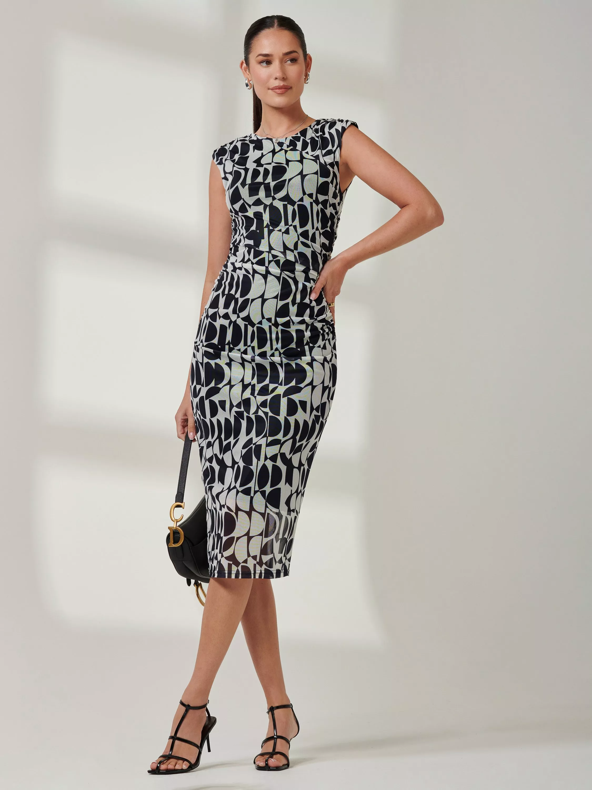 Exude effortless, sultry sophistication in this Mesh Bodycon Dress from Jolie Moi. Made from premium lightweight mesh fabric, it features a sleeveless design with shoulder pads and a flattering V-neckline. The gathered waist enhances your curves.