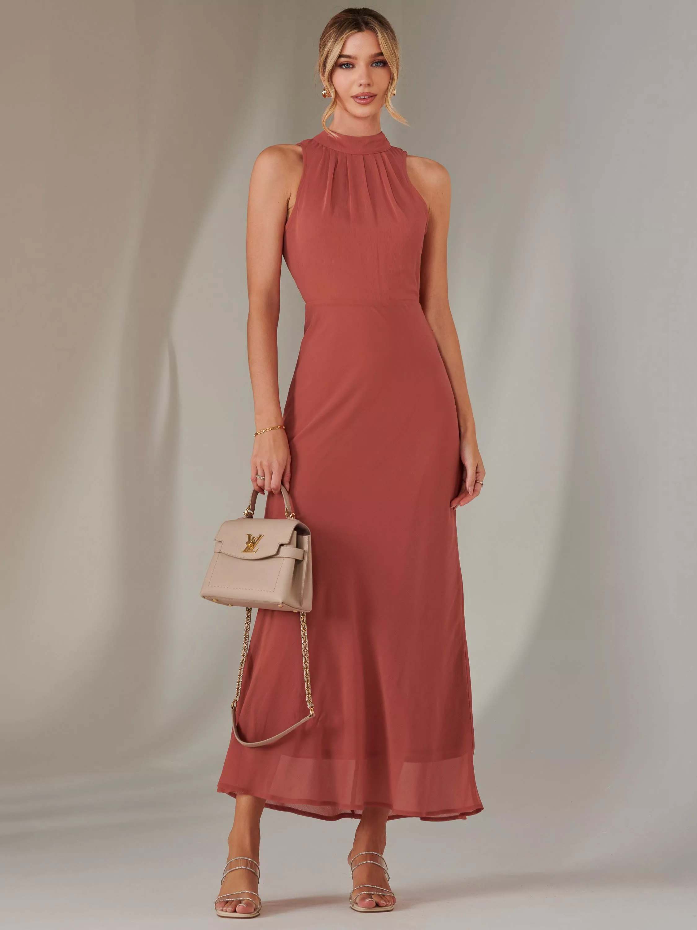 The Halterneck Maxi Dress is an elegant and minimalistic dress that is versatile enough for any special occasion. With an adjustable tied halter neck, this formal maxi dress features a stunning low-cut back and sleeveless design. This halterneck style dress stands out, adding a touch of sophistication and uniqueness to this maxi dress. A softly pleated body, this halter neck maxi dress boasts a flowing yet fitted skirt with a comfortable and stretchy fitted underlayer to ensure a smooth silhouette. The lightweight chiffon material ensures breathability to maintain comfort when wearing.