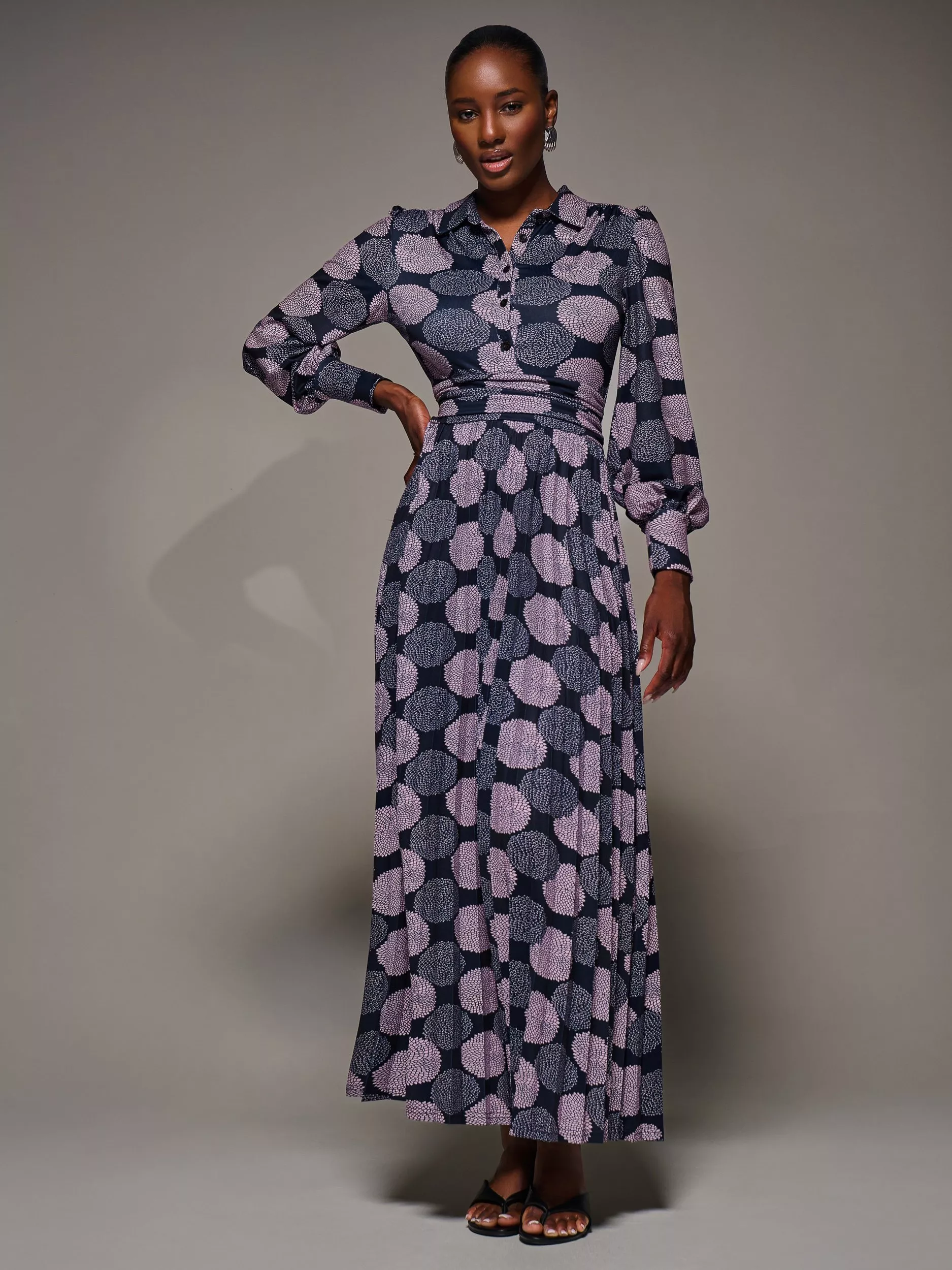 The Jersey Pleated Dress by Jolie Moi. Made from soft jersey fabric, this maxi-length dress features a button-up shirt design with a structured collar neckline. It has cuffed long sleeves and a flowing pleated skirt for graceful movement. Fully lined, the dress also includes a tie detail at the back to cinch the waist, along with two discreet side pockets for practicality.