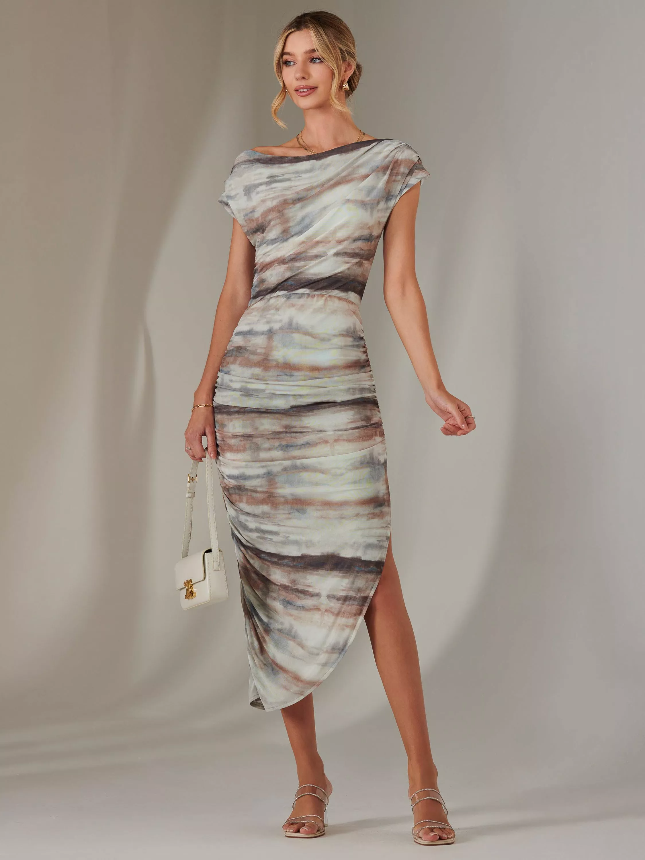 The flattering Off-Shoulder Bodycon dress is a simplistic yet elegantly bold dress that is sure to dazzle any special occasion. Featuring a geo print, this sleeveless breatheable dress is designed to be comfortable yet stylish, with a ruched body and skirt to support and create a sleek and sophisticated silhoutte. Detailed with a small side split that remains classy with a touch of glamour. The high boat neckline beautifully frames your shoulders, while the sleeveless design offers a chic and sophisticated silhouette.