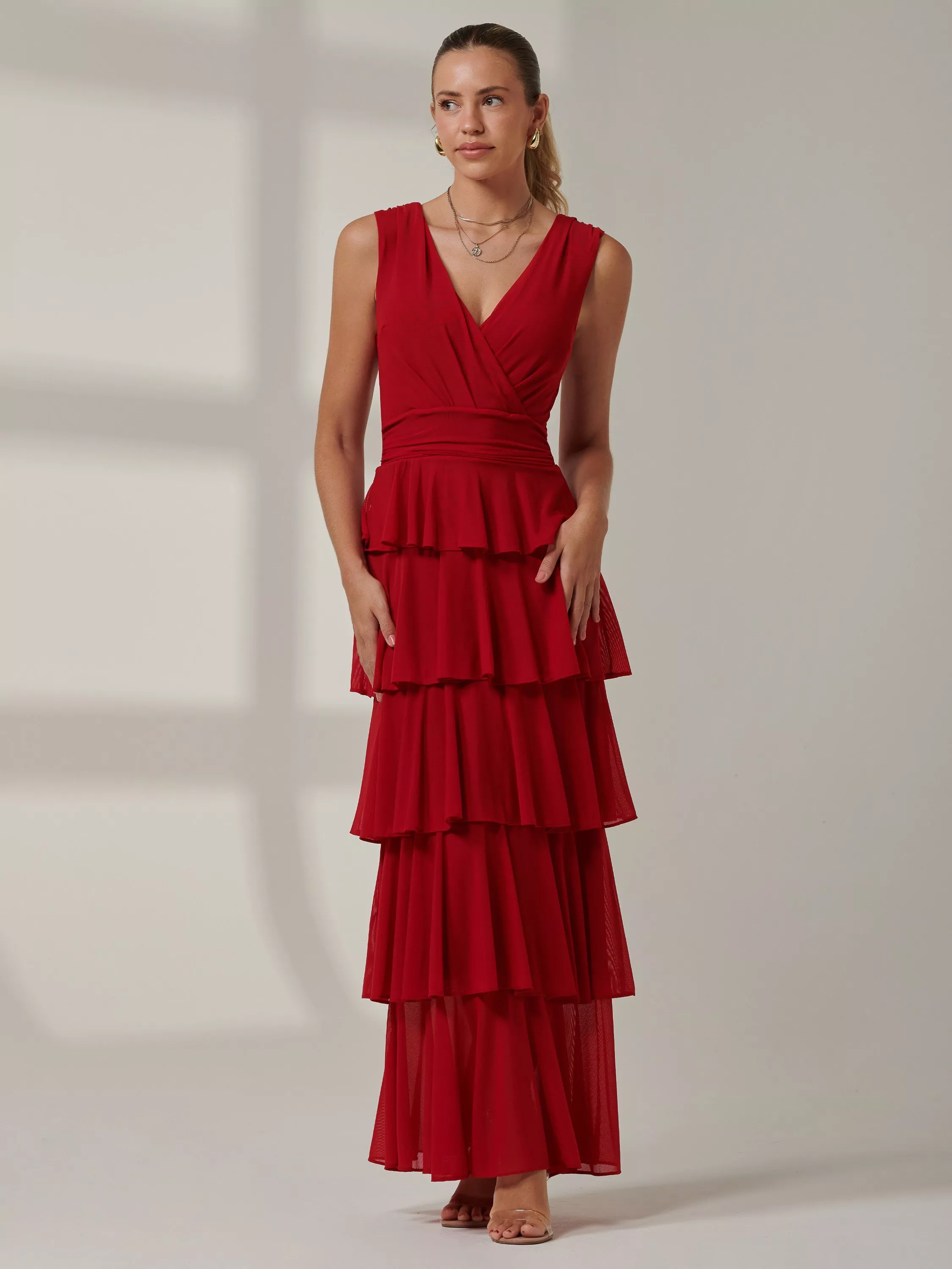 Fitted, flared, and fabulous. This sleeveless maxi dress by Jolie Moi is framed with a V-neck and is tiered at the skirt for added movement.