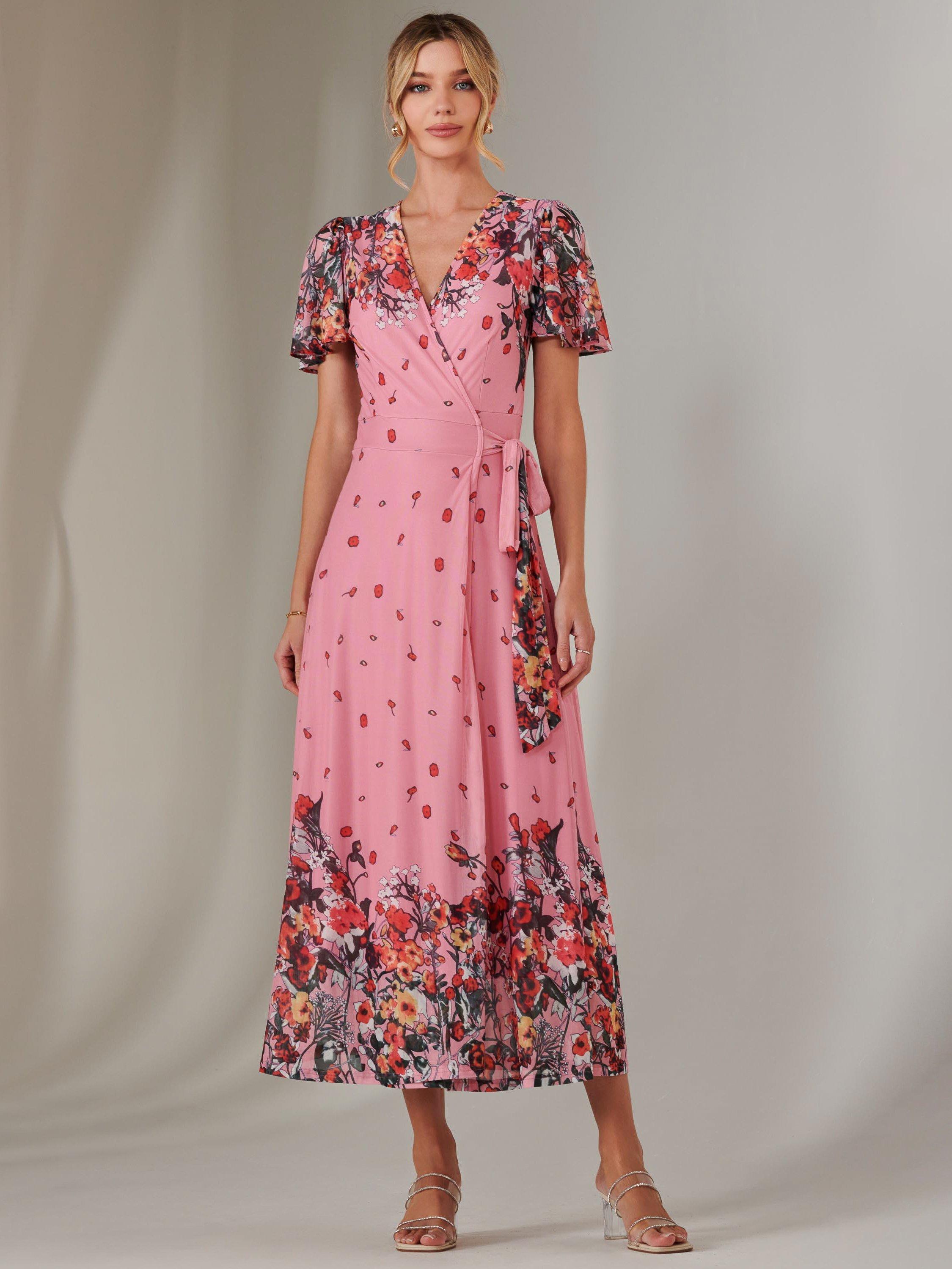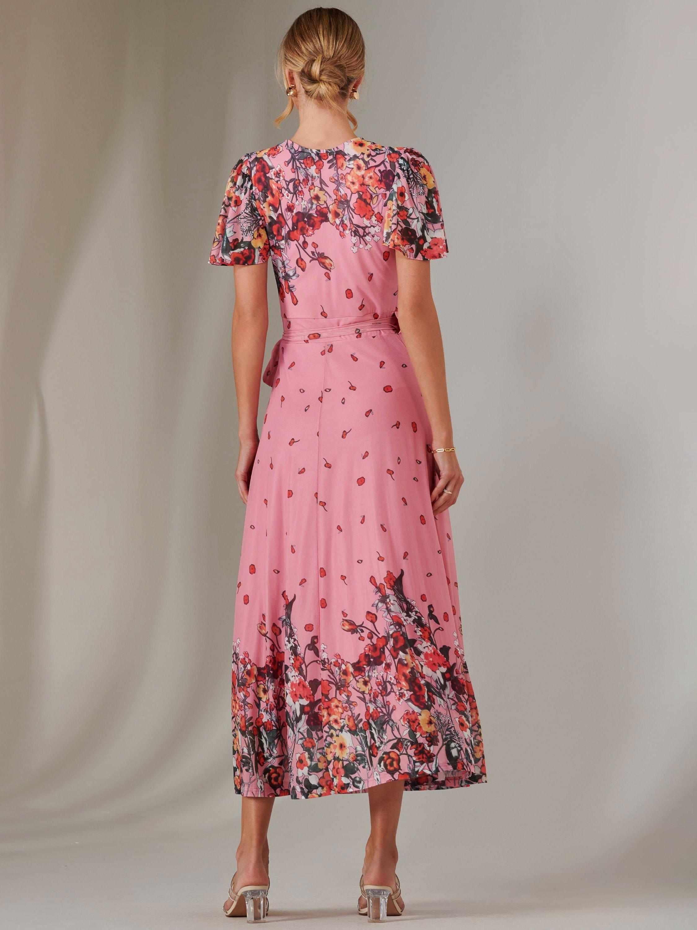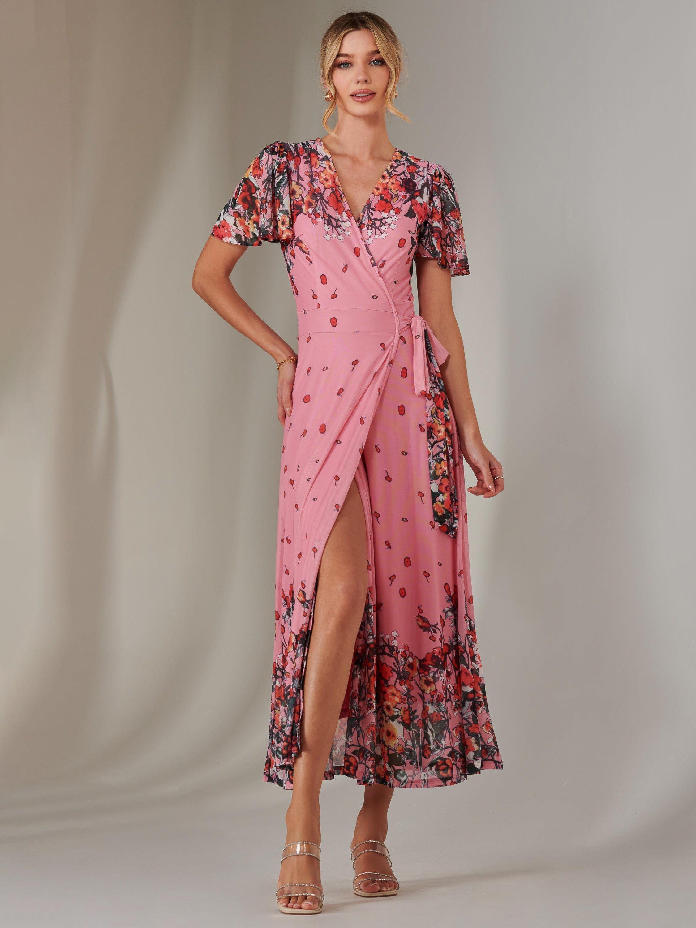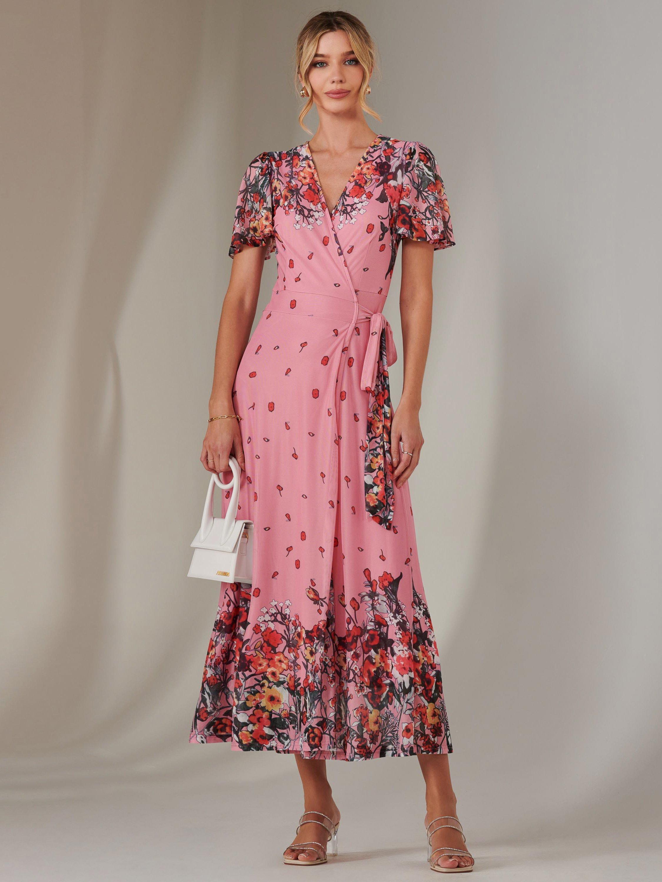 Cut to a flattering and effortless wrap shape, this dress features beautiful floral prints that cascade across the airy mesh fabric. Its short sleeves and v-neckline add a touch of sophistication, making it a perfect choice for all occasions.