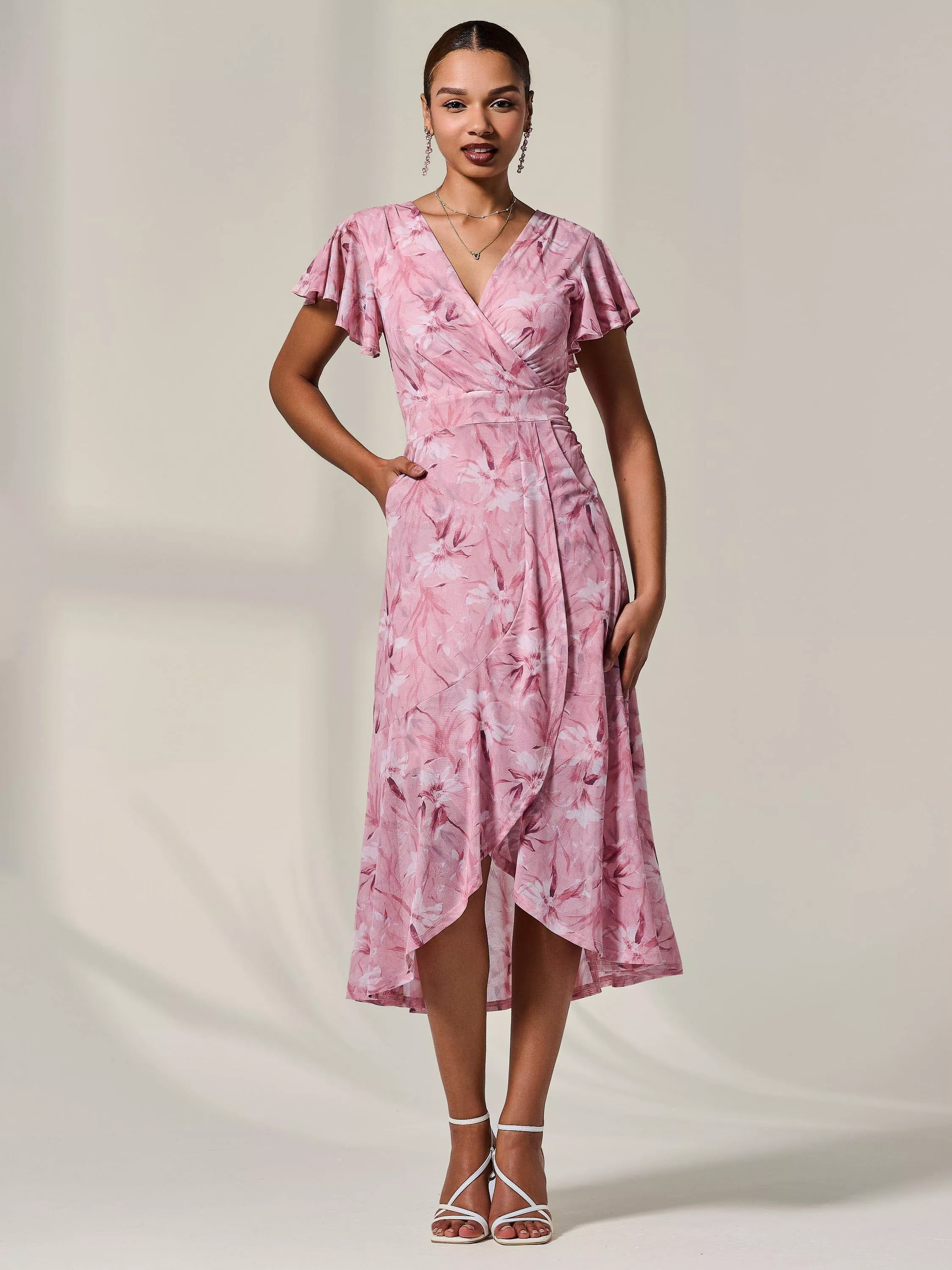 With its delicate short angel sleeves and flattering v-neckline, the Petite Wrap Midaxi Dress from Jolie Moi exudes an air of timeless elegance. Adorned in a whimsical pink floral print, the soft airy mesh fabric falls at the perfect length, featuring a faux wrap skirt with an asymmetric ruffle hem. The v neckline is complimented by a thick waistband which flatters the body, making this dress perfect for any summer occasion. This dress also has a back v neckline, which flows into a discreet centre back zip, as well as having front side pockets.