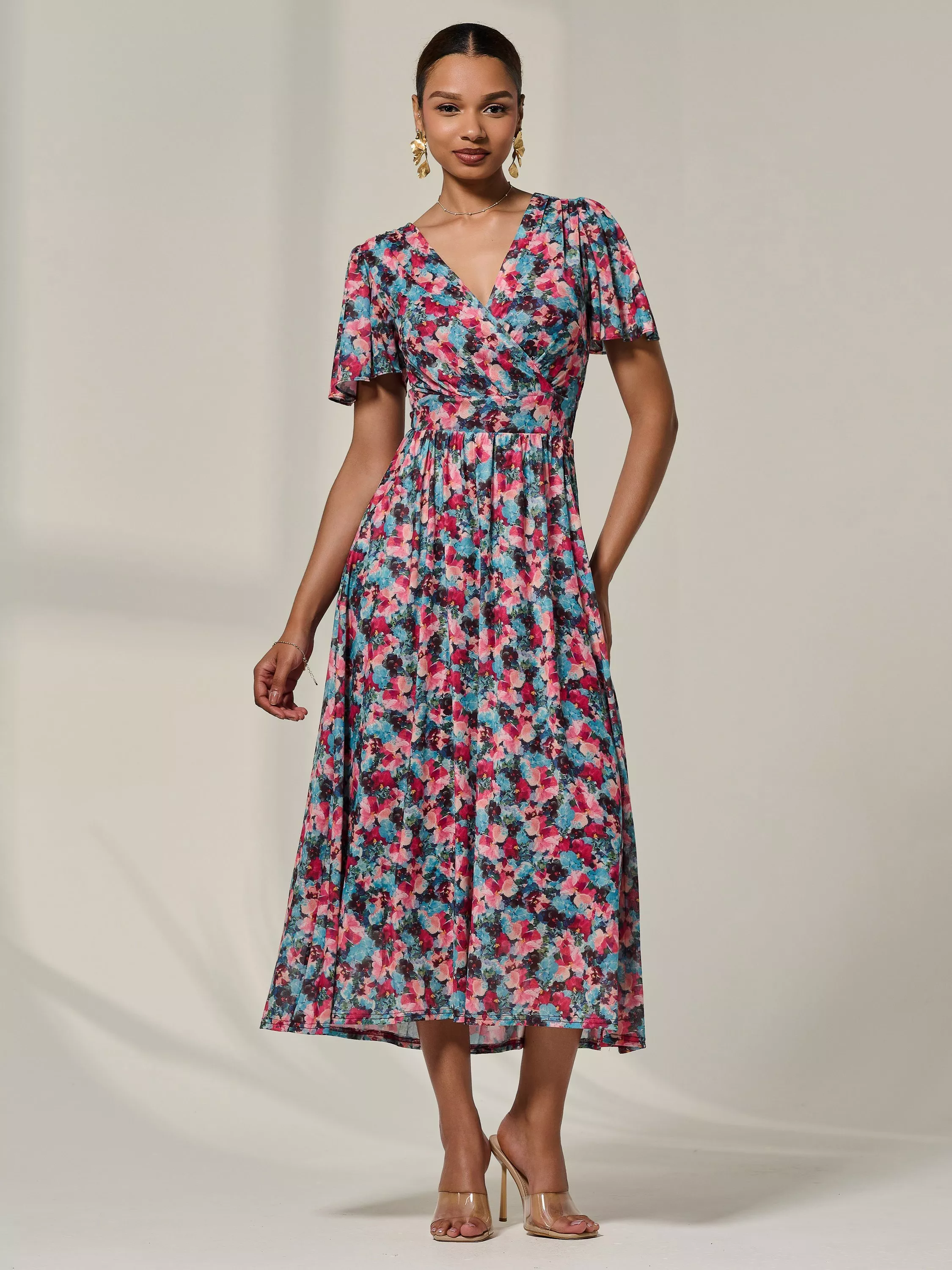 Nothing flatters like a fit and flare shape. This short sleeved midi dress by Jolie Moi is framed with a V-neckline and is printed with pretty florals.