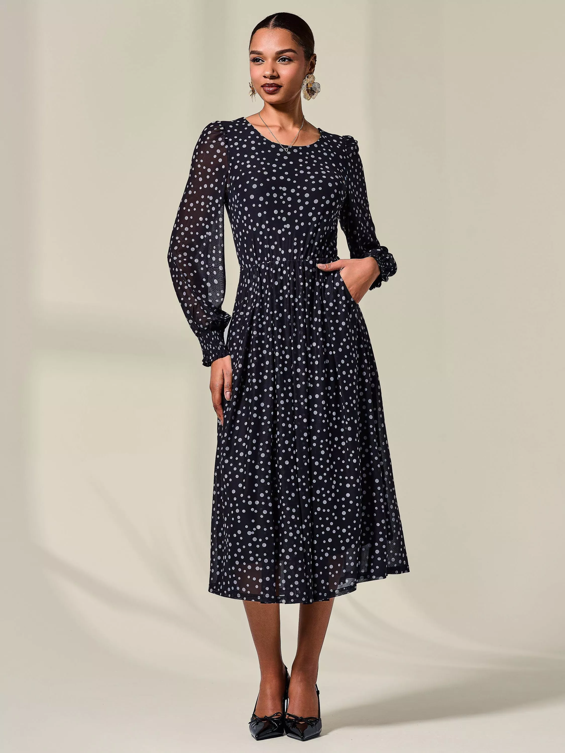 Turn heads in the Polka Dot Mesh Midi Dress from Jolie Moi, perfect for your next special occasion. Crafted from a soft mesh material which has a slight stretch for extra comfort, adorned in a classic polka print, this dress falls to the perfect midi length, with the ruched waistband complementing this style so well, accompanied by a thick tie belt at the waist to create a super flattering silhouette. The classic round neckline adds a sophisticated touch, whilst the back boasts a V neckline to allow for easy wearing, as well as a back centre zip. The shirred cuffs are the perfect finishing touch to this piece, as well as it being fully lined for comfort, whilst also having our signature side front pockets, the practical touch every dress needs.