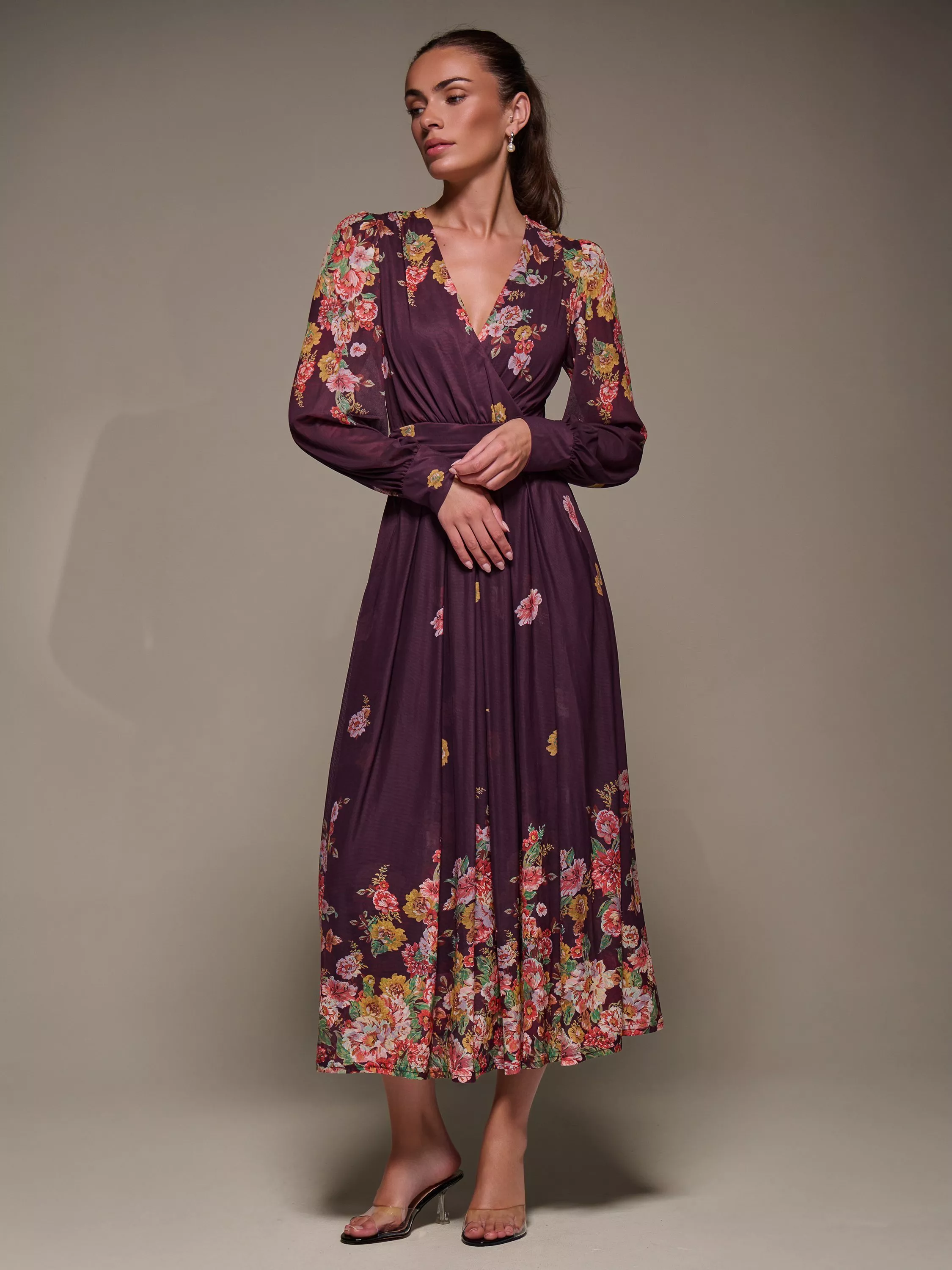 Given movement by soft pleats, this long sleeve maxi dress from Jolie Moi is framed with a V-neck and a splash of floral flair.