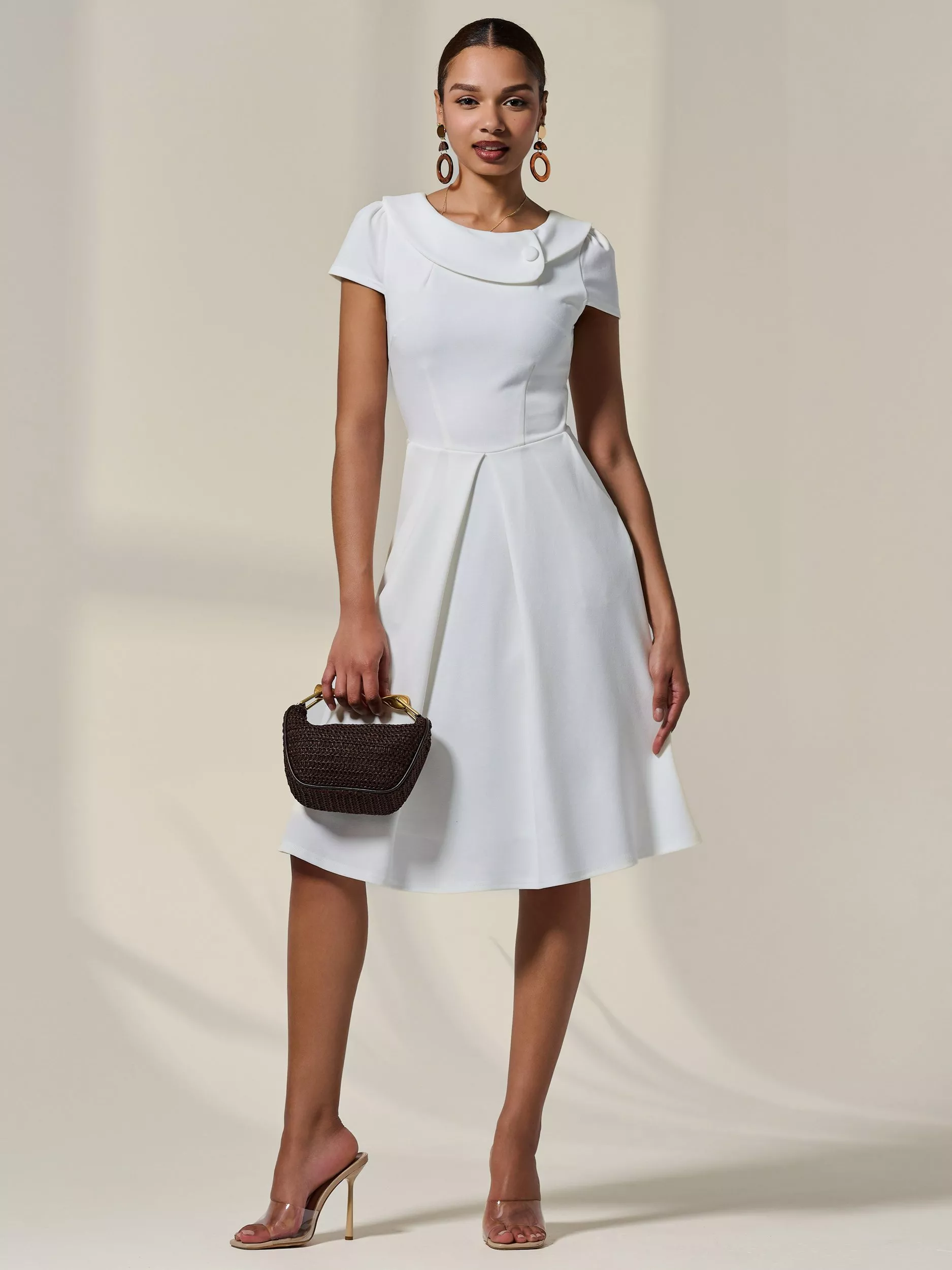 Embrace elegance in the Cap Sleeve Midi Dress, the perfect vintage-inspired piece with its 50’s style collar and pleated cap sleeves, complemented by an A-Line midi skirt which sits at the perfect length. This dress also features a front pleat and discreet front side pockets, as well as a v back neckline which flows into a back centre zip, for easy wearing. This would be the perfect piece for any occasion, as it can be styled in so many fun and unique ways and for any season.