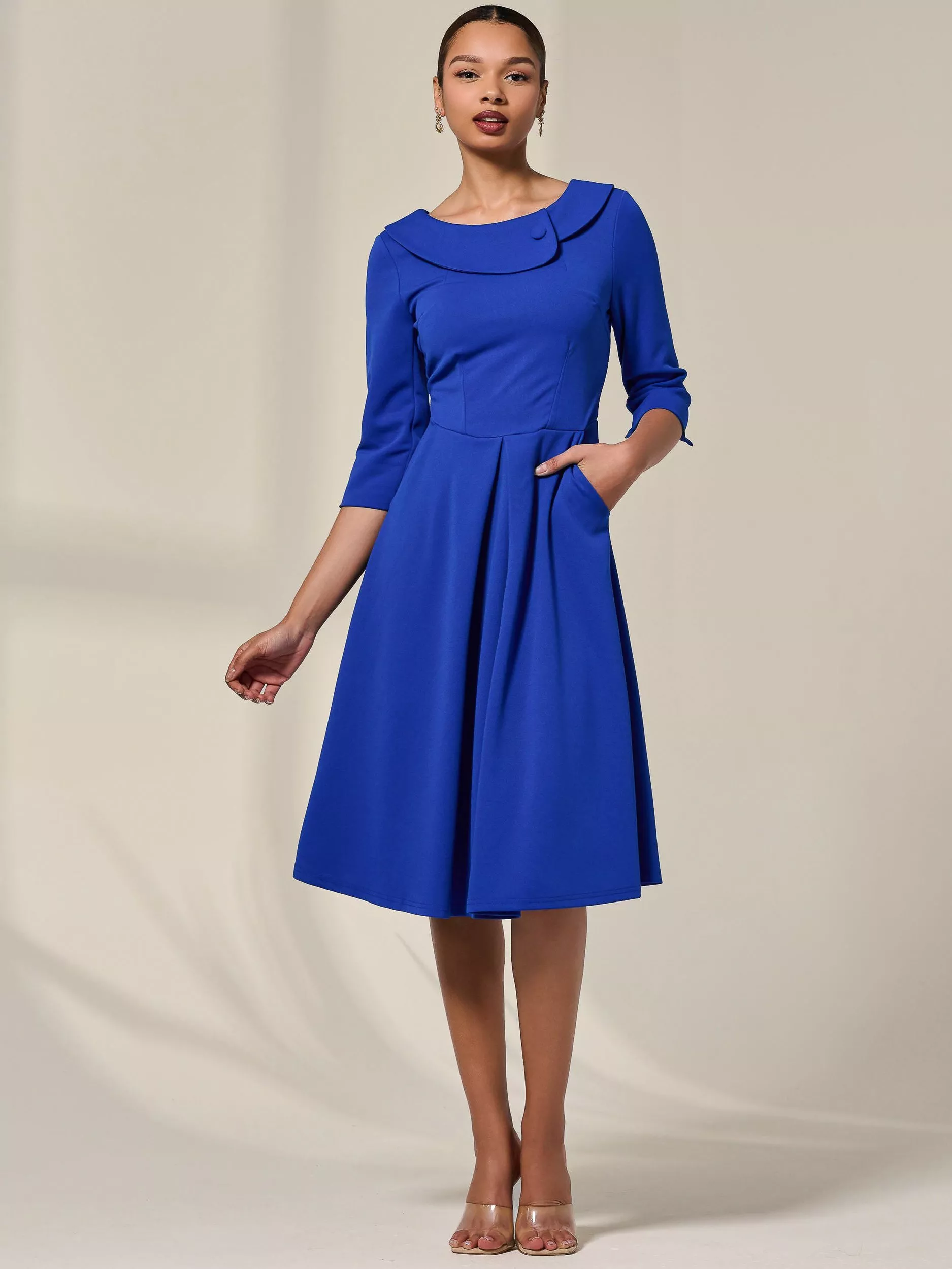 Channel your inner vintage elegance with the timeless 50's-inspired Midi Dress from Jolie Moi. The flattering round-collared neckline evokes timeless 50's glamour, while the 3/4 sleeves with chic slit detailing add a touch of sophistication. Designed to flatter, the flowy hem with a soft front pleat creates graceful movement, perfect for twirling through any occasion. It also features discreet front side pockets and a concealed zip for a seamless, elegant finish.
