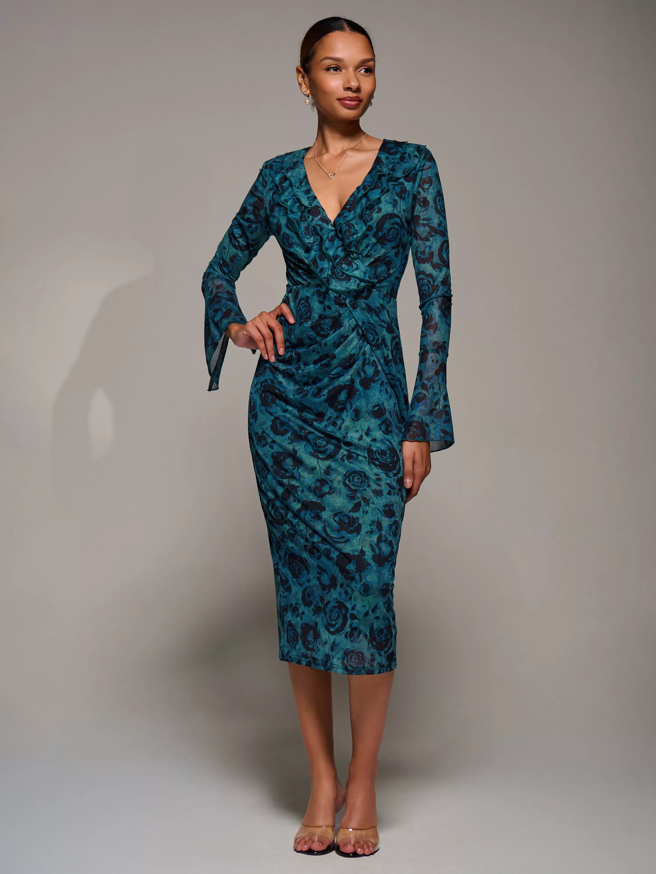 Ruffle Mesh Bodycon Dress by Jolie Moi features sheer chiffon sleeves flaring softly at the cuffs and a ruffle V neckline with a wrap front.