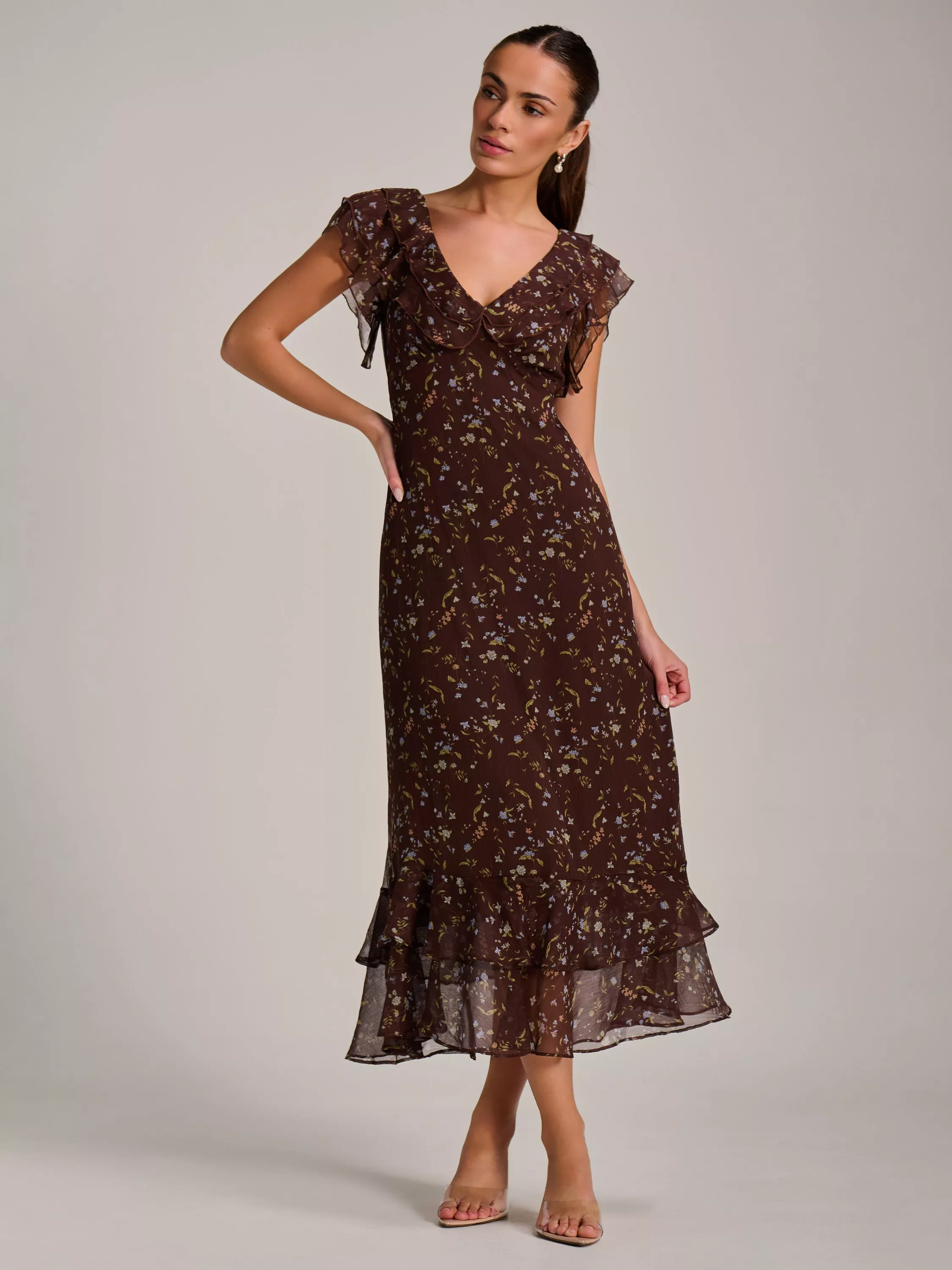 The Ruffle Neck Midaxi Dress from Jolie Moi. Featuring short ruffle sleeves and a ruffle V-neckline, this dress is made from lightweight chiffon and fully lined for comfort. The three-tiered ruffle skirt adds playful volume, flowing into a Midaxi length for a feminine and elegant silhouette.
