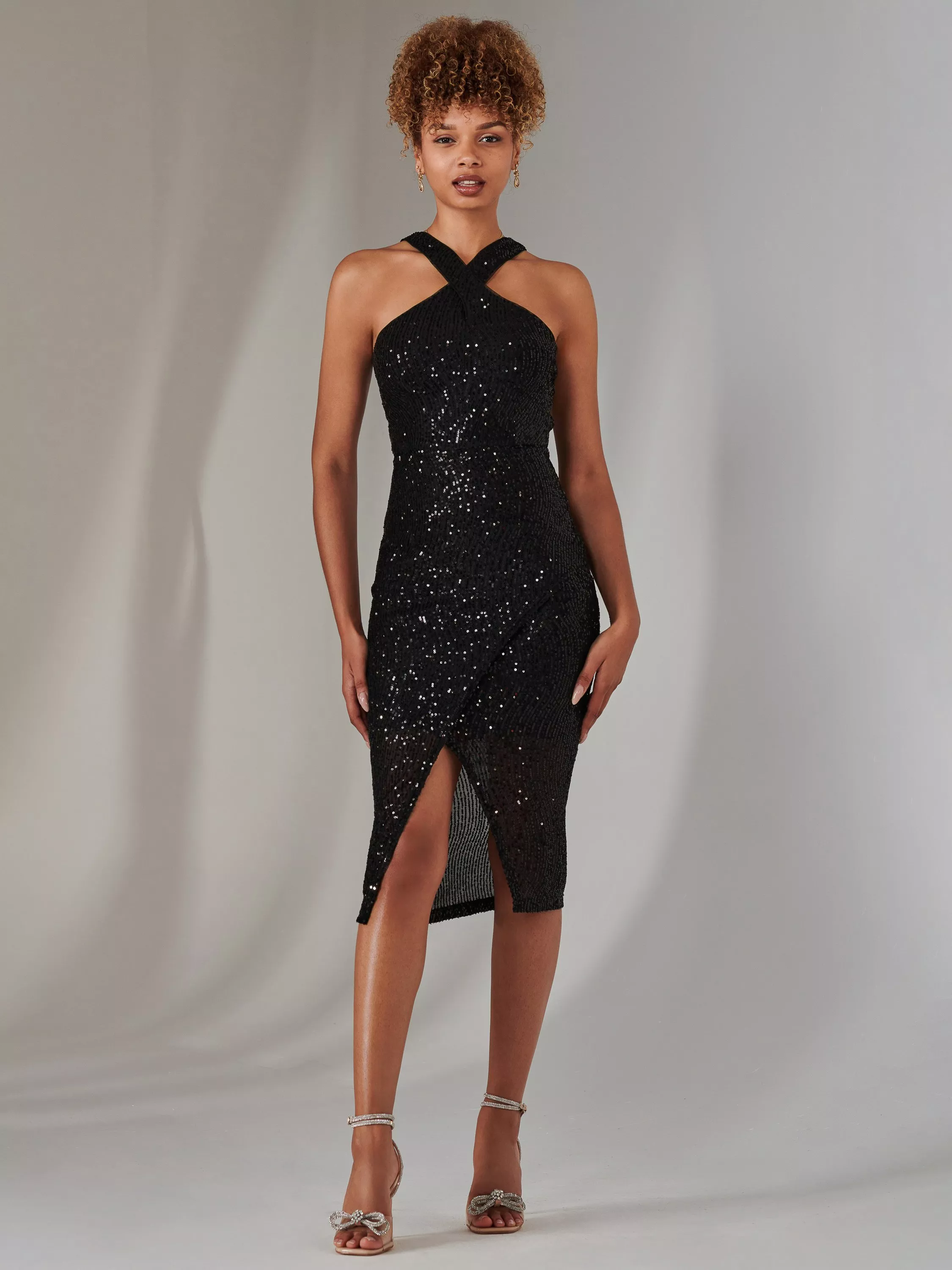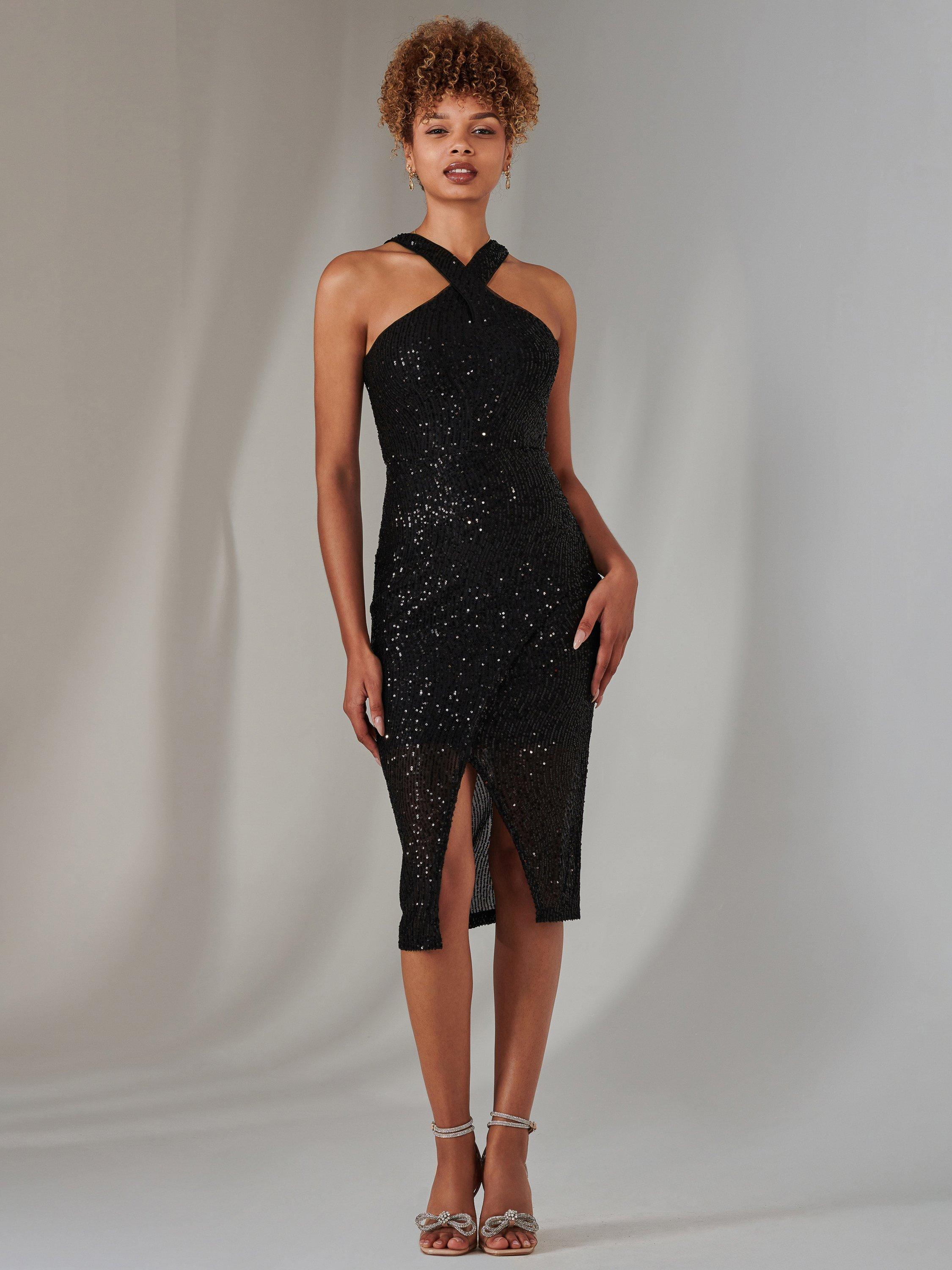 The Cross Neck Slit Bodycon Dress from Jolie Moi is a show-stopping piece perfect for glamorous nights out. Featuring a sleeveless design and an alluring cross neck, this dress elegantly highlights your shoulders. Adorned with shimmering sequins, it catches the light with every move, ensuring all eyes are on you. The figure-hugging bodycon silhouette is complemented by a daring slit, adding a touch of drama. With a convenient back zip closure for a seamless fit.
