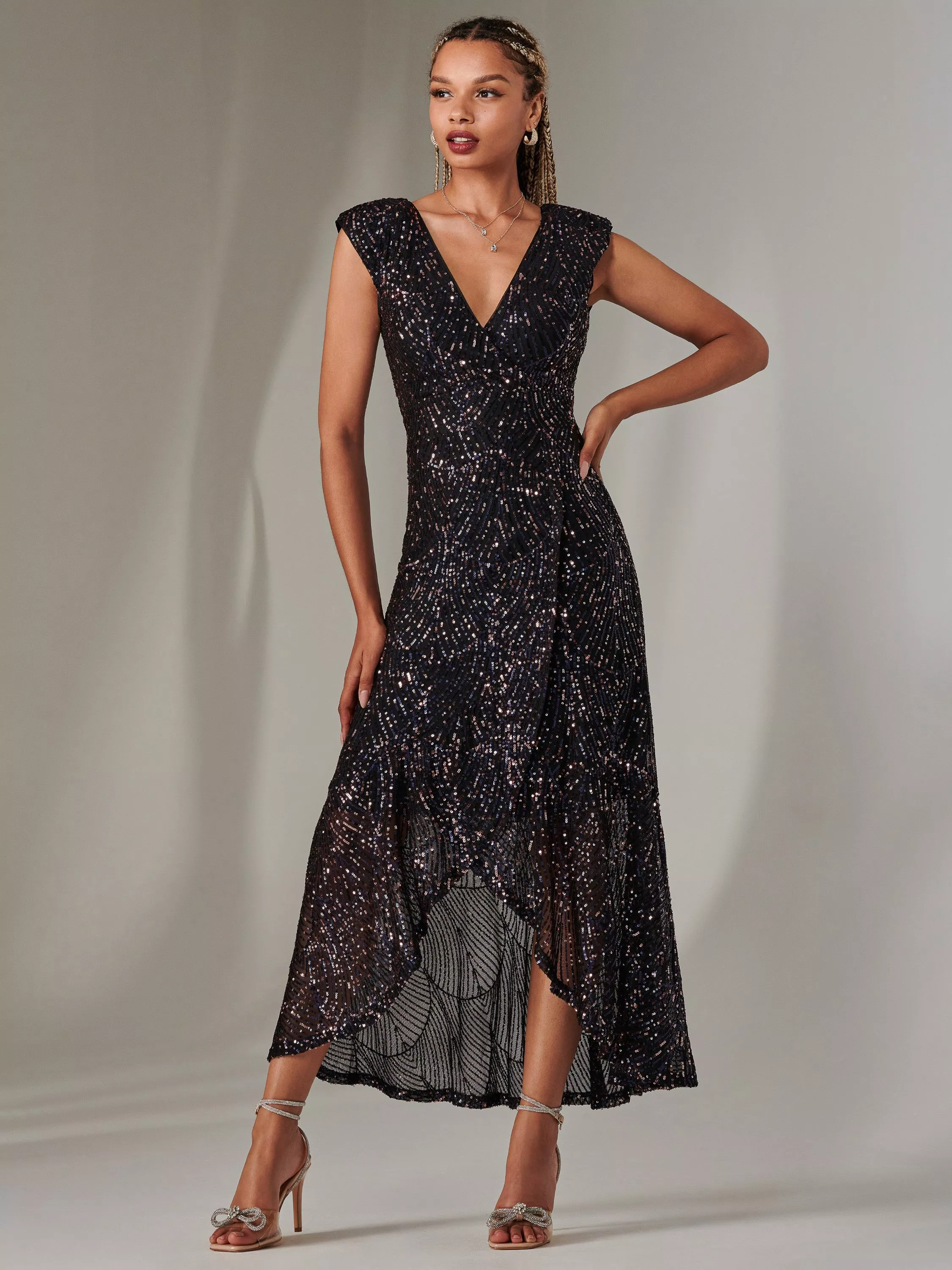 The Sequin Ruffle Hem Maxi Dress from Jolie Moi is a stunning addition to any wardrobe. Featuring a flattering sleeveless design and a stylish V-neck, this dress elegantly showcases your silhouette. The high-low hem adds a playful touch, while shimmering sequins provide a touch of glamour, making it perfect for special occasions or evening outings. Effortlessly chic, this dress combines comfort and sophistication for a standout look.
