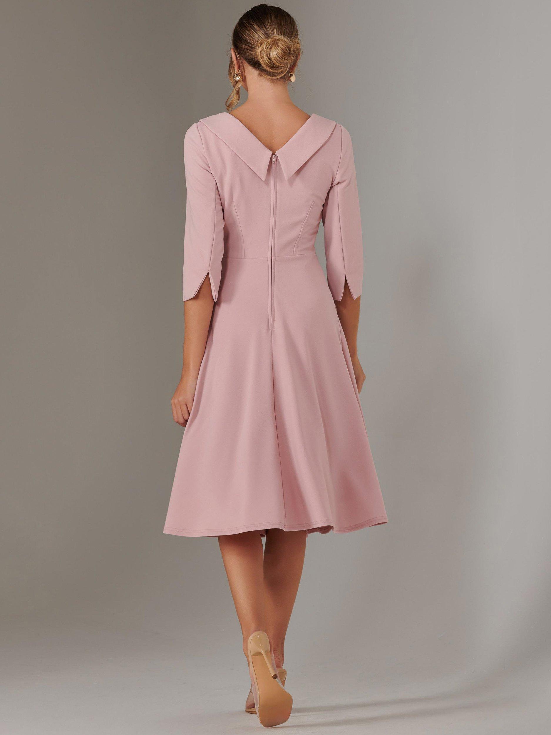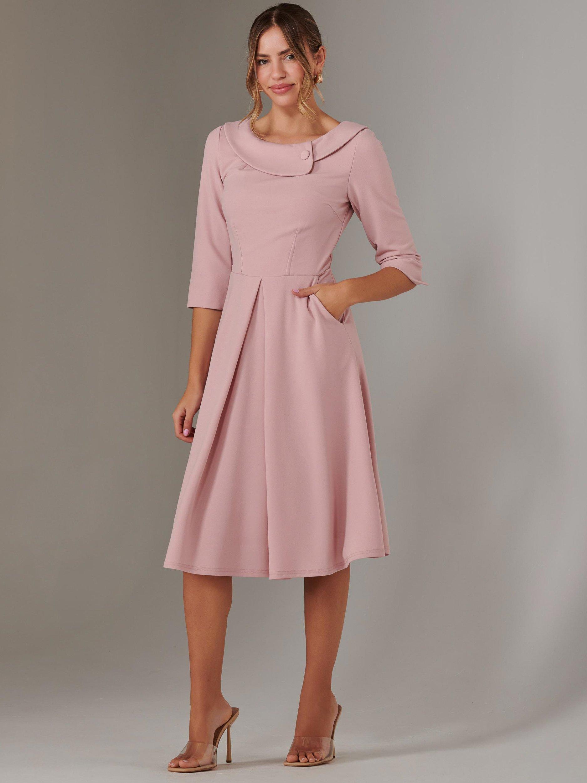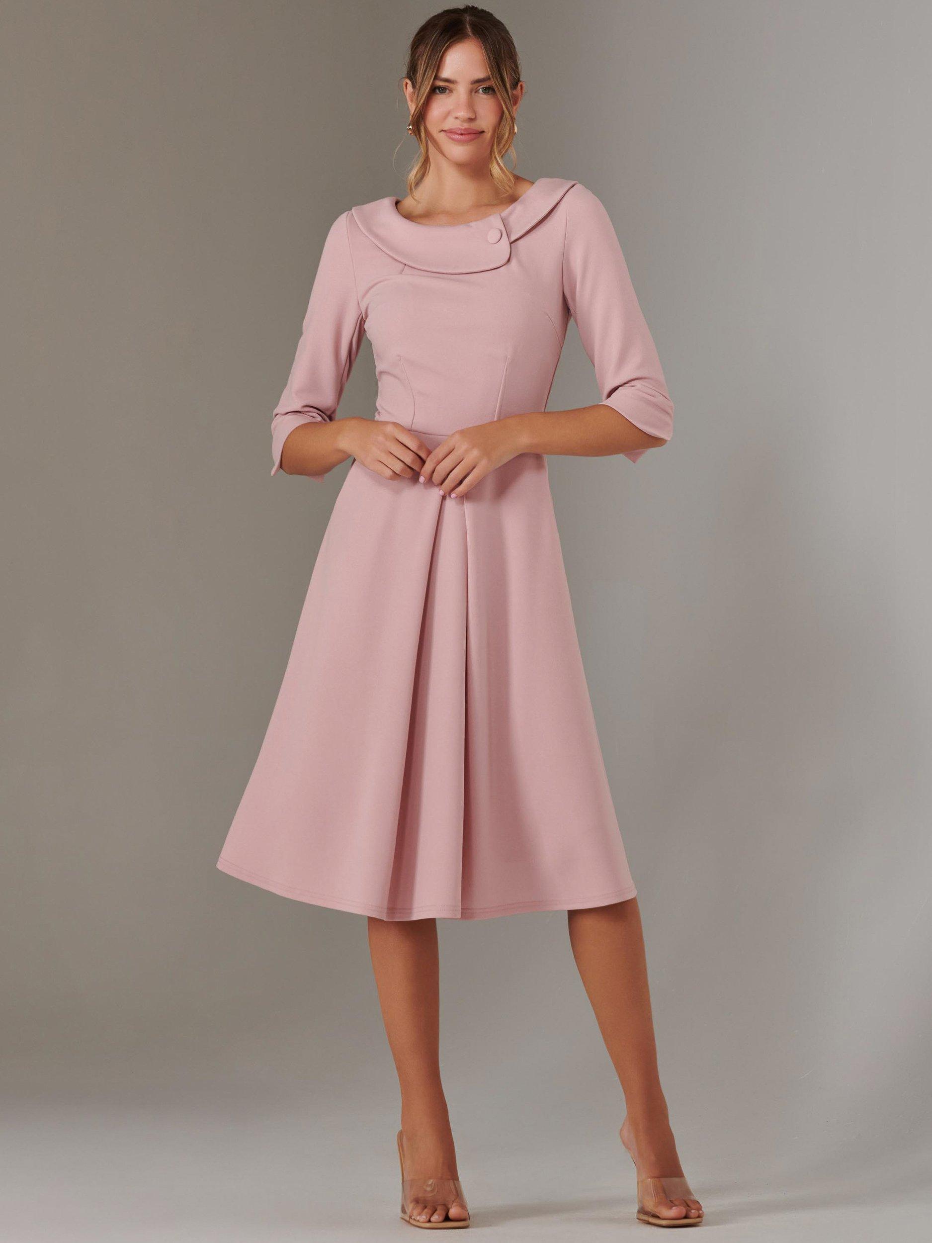 Channel your inner vintage elegance with the timeless 50's-inspired, Sloan Midi Dress from Jolie Moi. The flattering round-collared neckline evokes timeless 50's glamour, while the 3/4 sleeves with chic slit detailing add a touch of sophistication. Designed to flatter, the flowy hem with a soft front pleat creates graceful movement, perfect for twirling through any occasion.