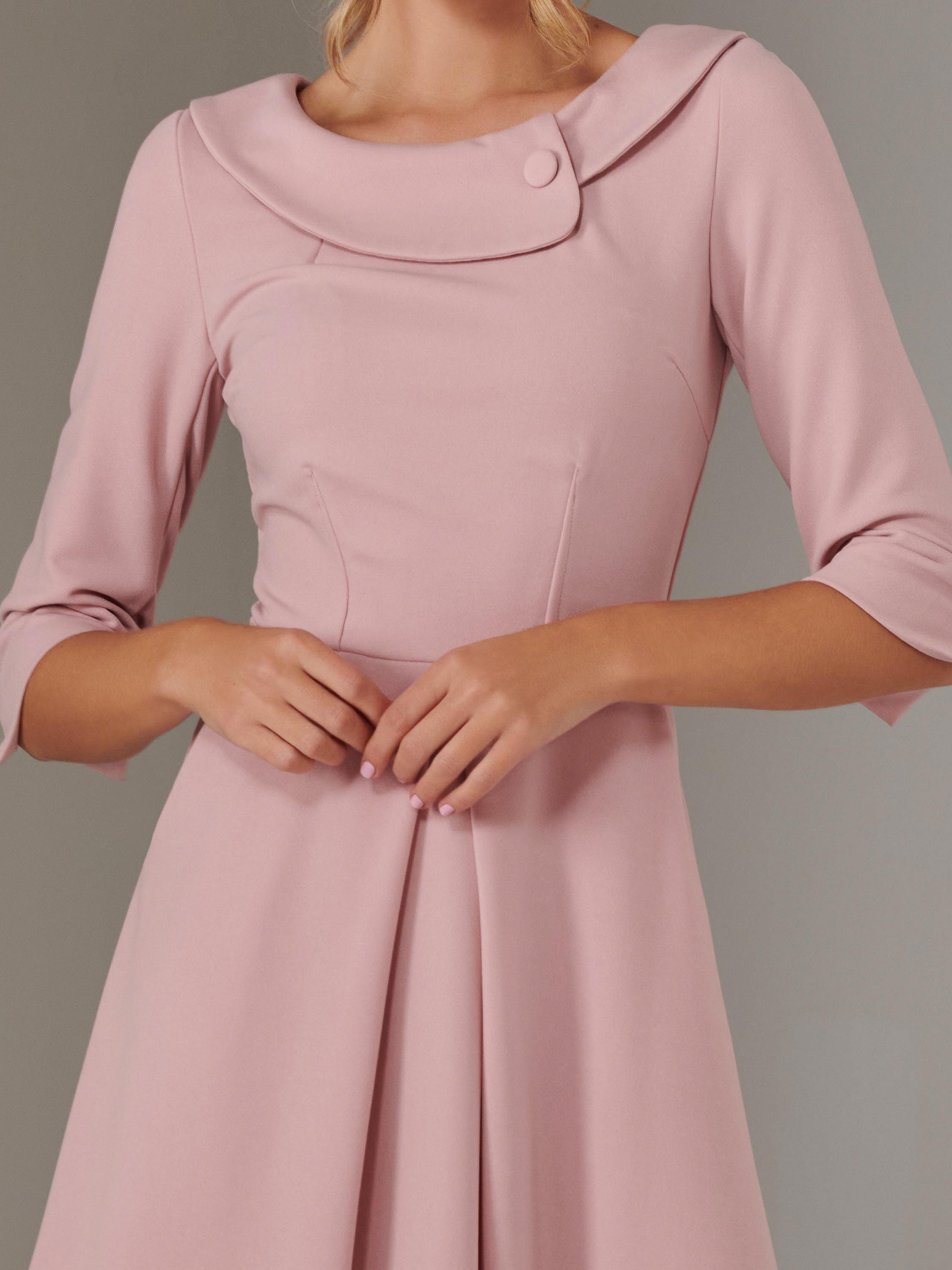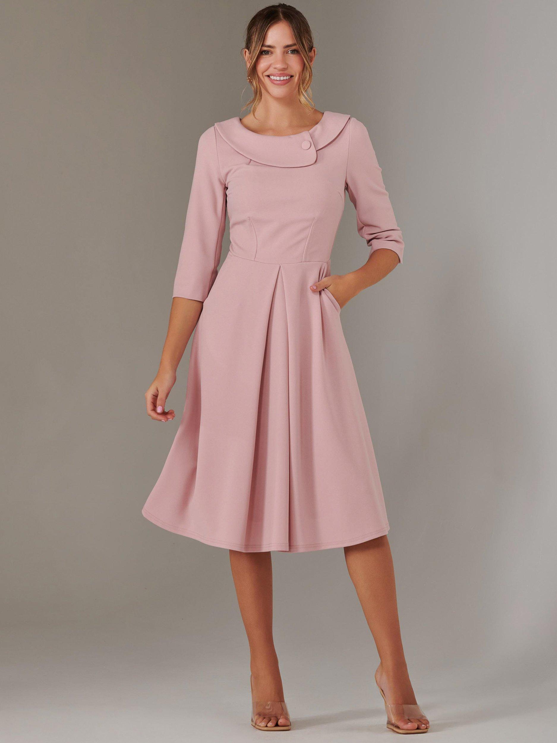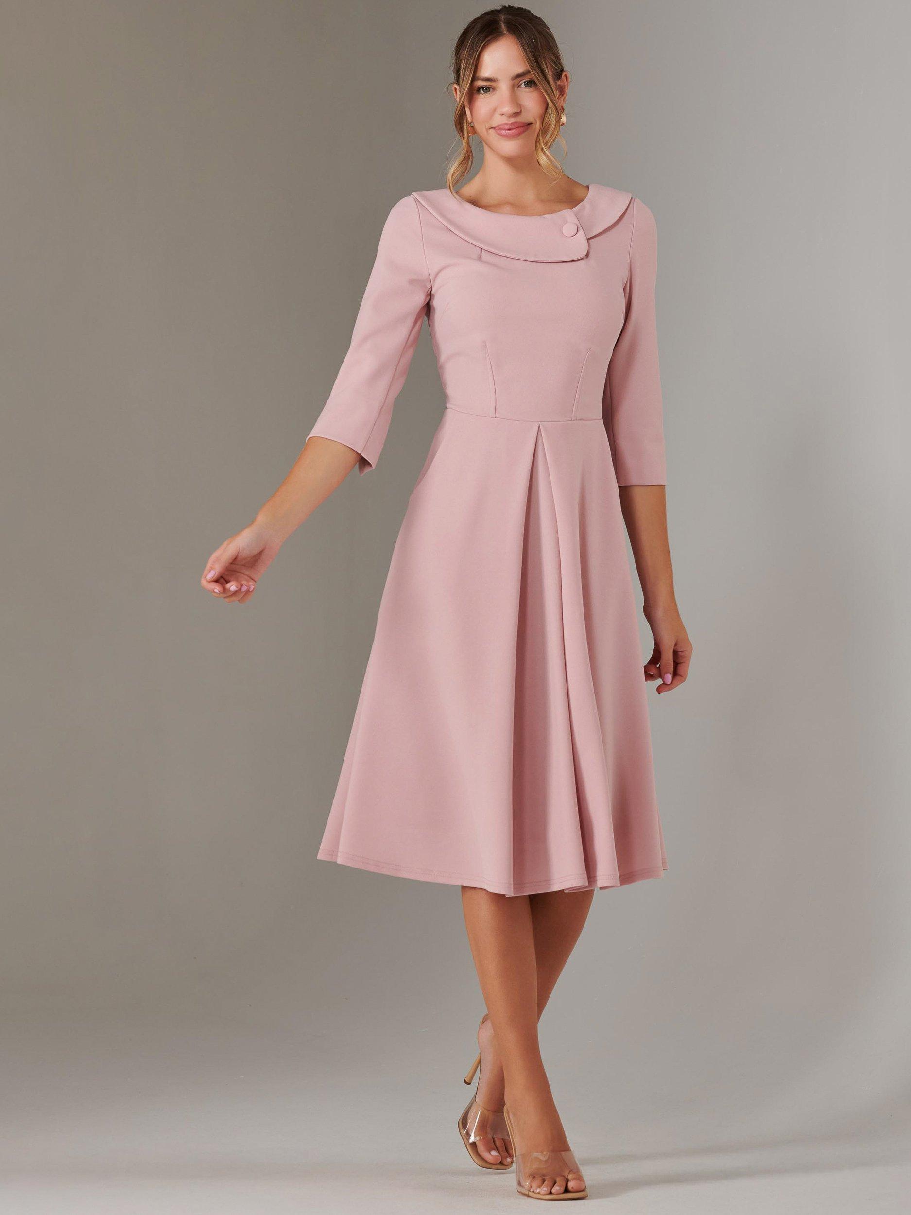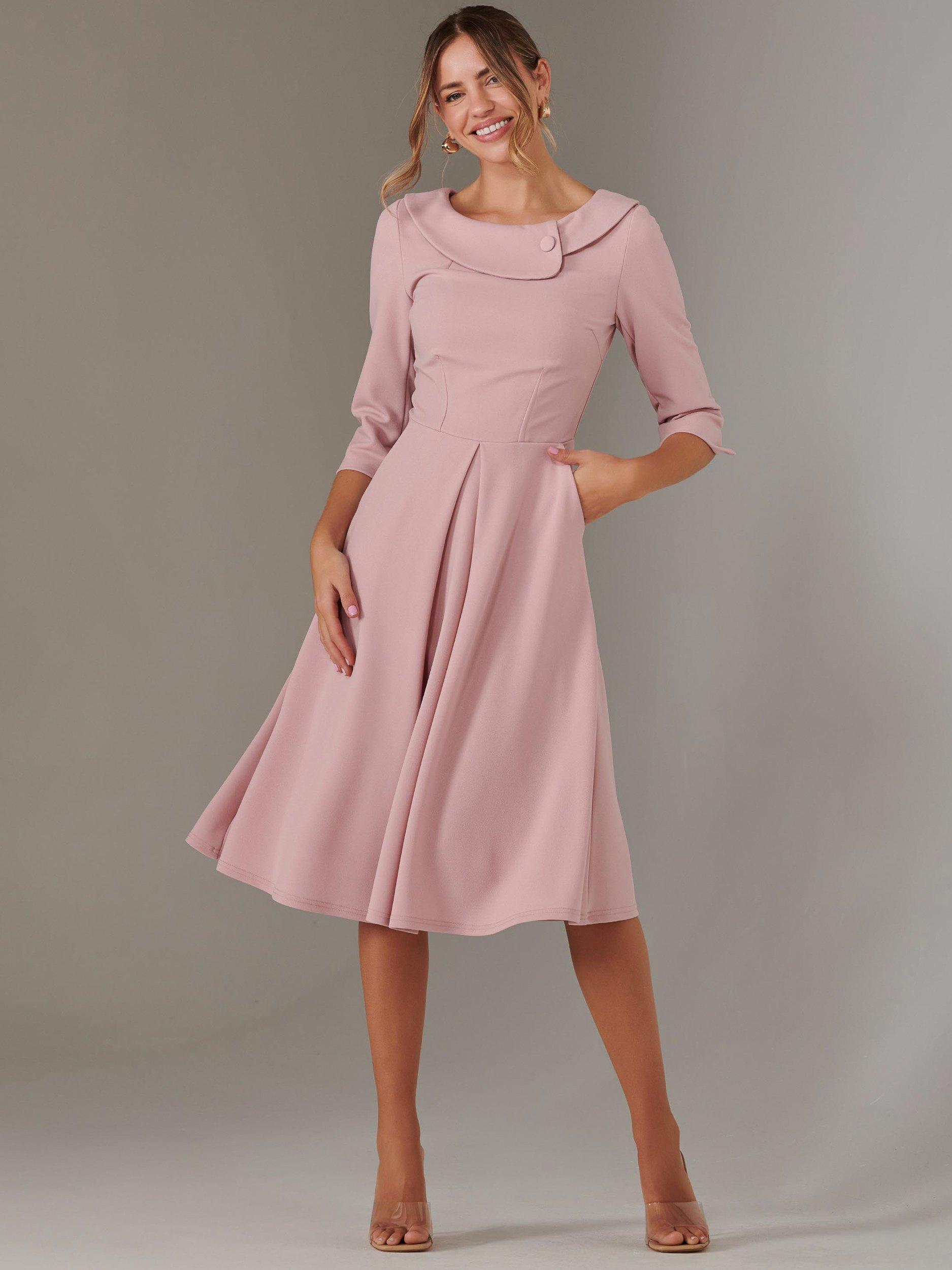 Channel your inner vintage elegance with the timeless 50's-inspired, Sloan Midi Dress from Jolie Moi. The flattering round-collared neckline evokes timeless 50's glamour, while the 3/4 sleeves with chic slit detailing add a touch of sophistication. Designed to flatter, the flowy hem with a soft front pleat creates graceful movement, perfect for twirling through any occasion.