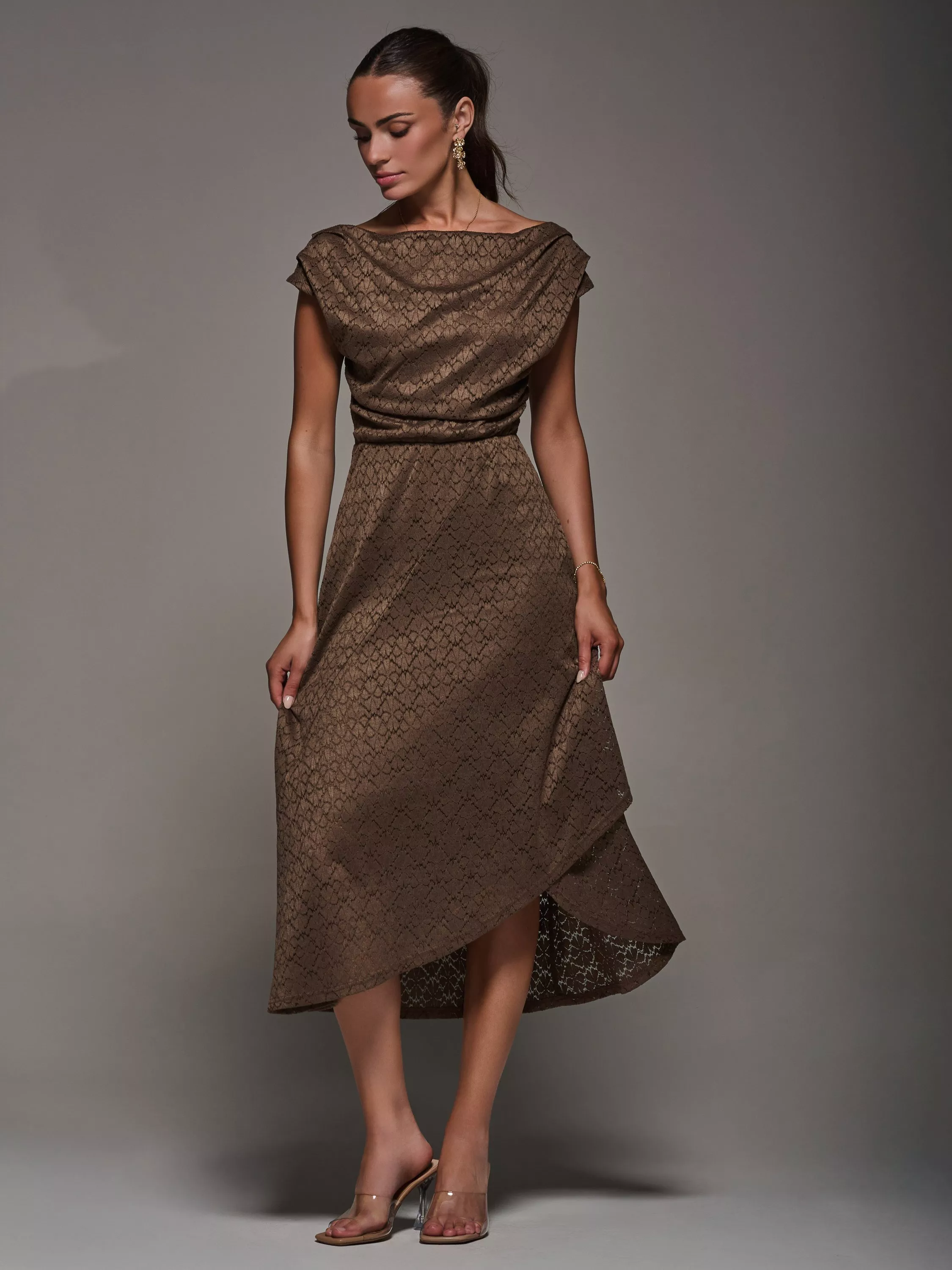 Sophisticated and elegant, the Textured Asymmetrical Draped Midaxi Dress by Jolie Moi will make you feel your best, with its floaty silhouette and unique pleated neckline, which can be worn in multiple ways, whether that be off the shoulder or as a more cowl neck style. Its asymmetric wrap hem adds an element of fun to this stylish piece, whilst the length keeps it classy. Crafted from a soft, abstract lace that drapes beautifully across the body, this is the perfect piece for your next special occasion.