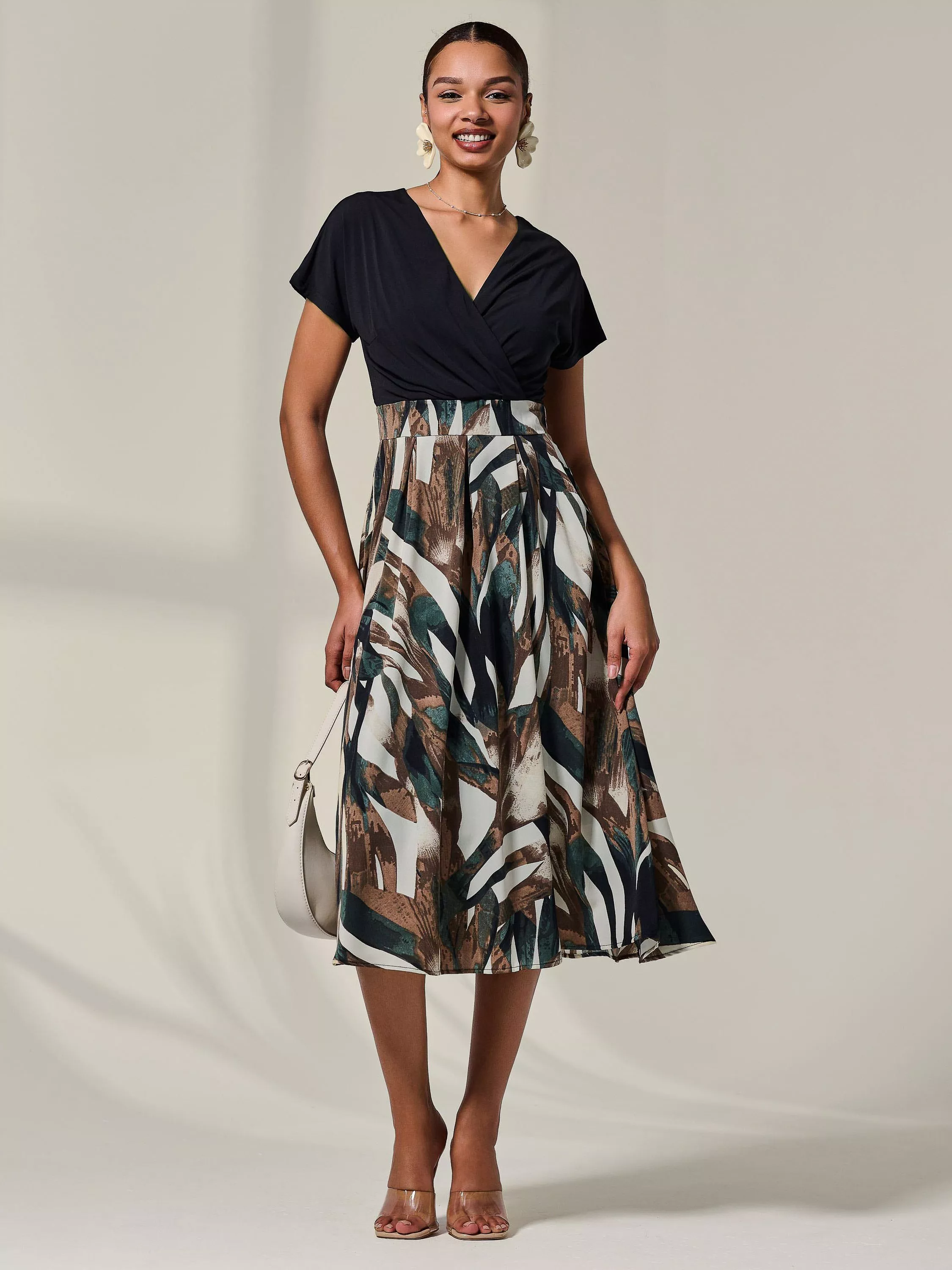 Make every moment unforgettable in the Two-Tone Midaxi Dress by Jolie Moi, a chic and sophisticated addition to your occasion wear wardrobe. This piece is like no other, with the top half being soft and form-fitting, with a faux wrap v neckline, crafted from the softest stretch material, whilst the pleated skirt is the head turner of this piece, adorned in a unique abstract print, which falls to the perfect midi length. The thick structured waistband creates a flattering shape, whilst the discreet side pockets add a touch of practicality. This dress is also fully lined and features a centre back zip for ease.