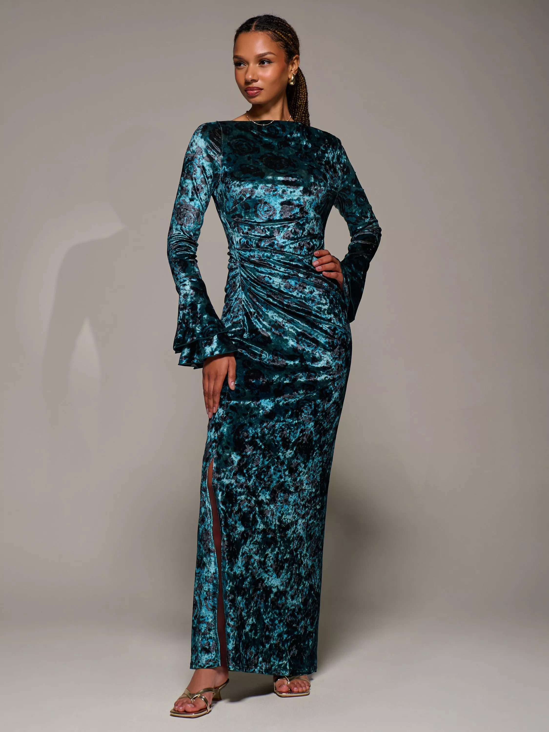 The Velvet Maxi Ruffle Dress by Jolie Moi features a slash neckline and soft pleats at the waist for a flattering draped effect. The long sleeves are finished with two delicate frills for a feminine touch, while a subtle side split adds ease of movement and a stylish detail that flatters with every step.