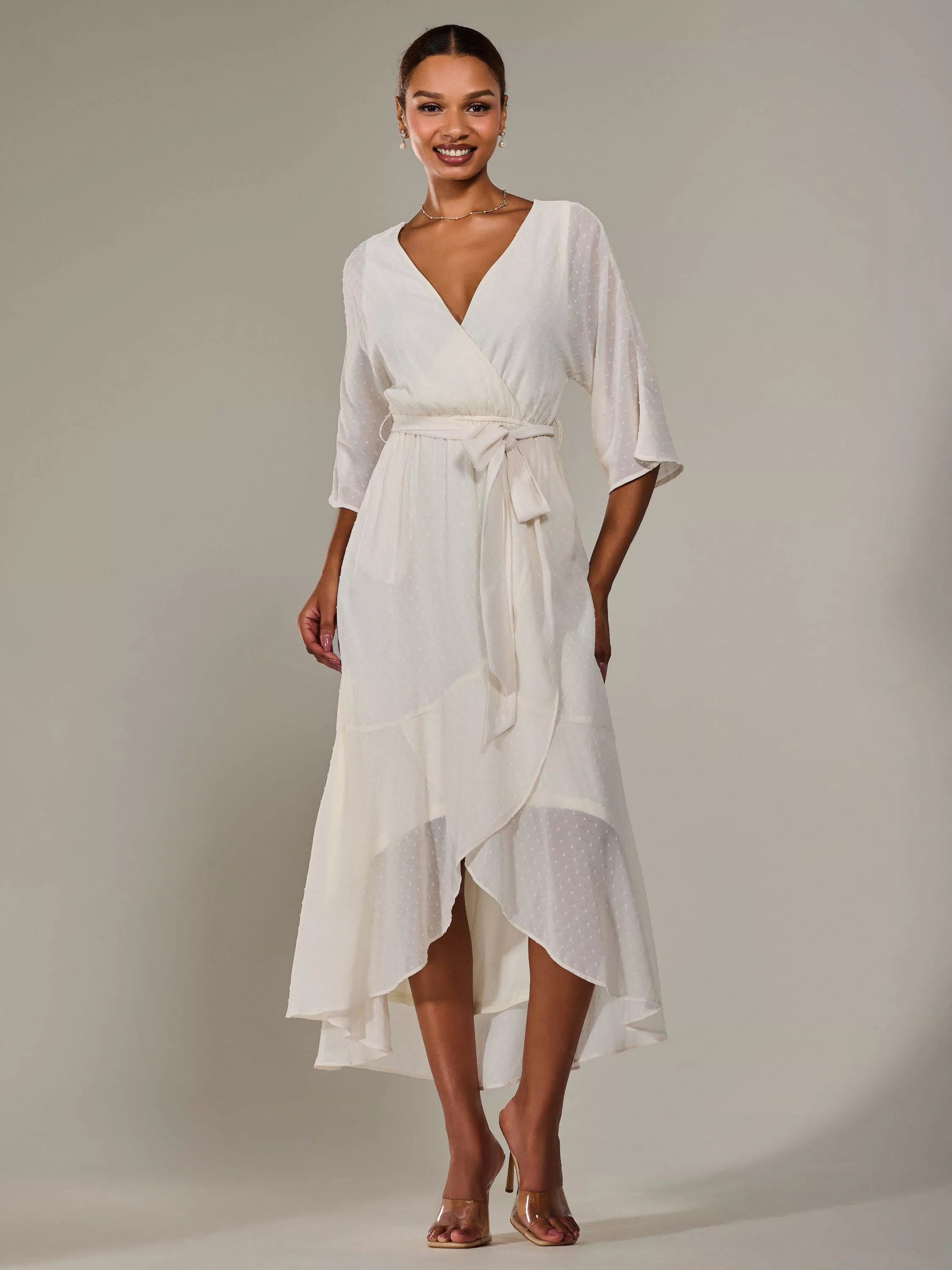 Step into a sunshine-filled day with the Wrap Tie Front Midi Dress by Jolie Moi. Ideal for smart casual wear, this pretty dress is crafted from fully lined, textured chiffon that is lightweight and as airy as it looks. The wrap-over V-neckline enhances its flattering shape, while the short sleeves offer just the right amount of coverage for warmer days. Designed with a comfortable elasticated waistband and a tie waist detail, it creates a graceful silhouette. The cascading ruffle high-low skirt adds movement and playfulness, making it perfect for a stroll through the park or a weekend brunch.