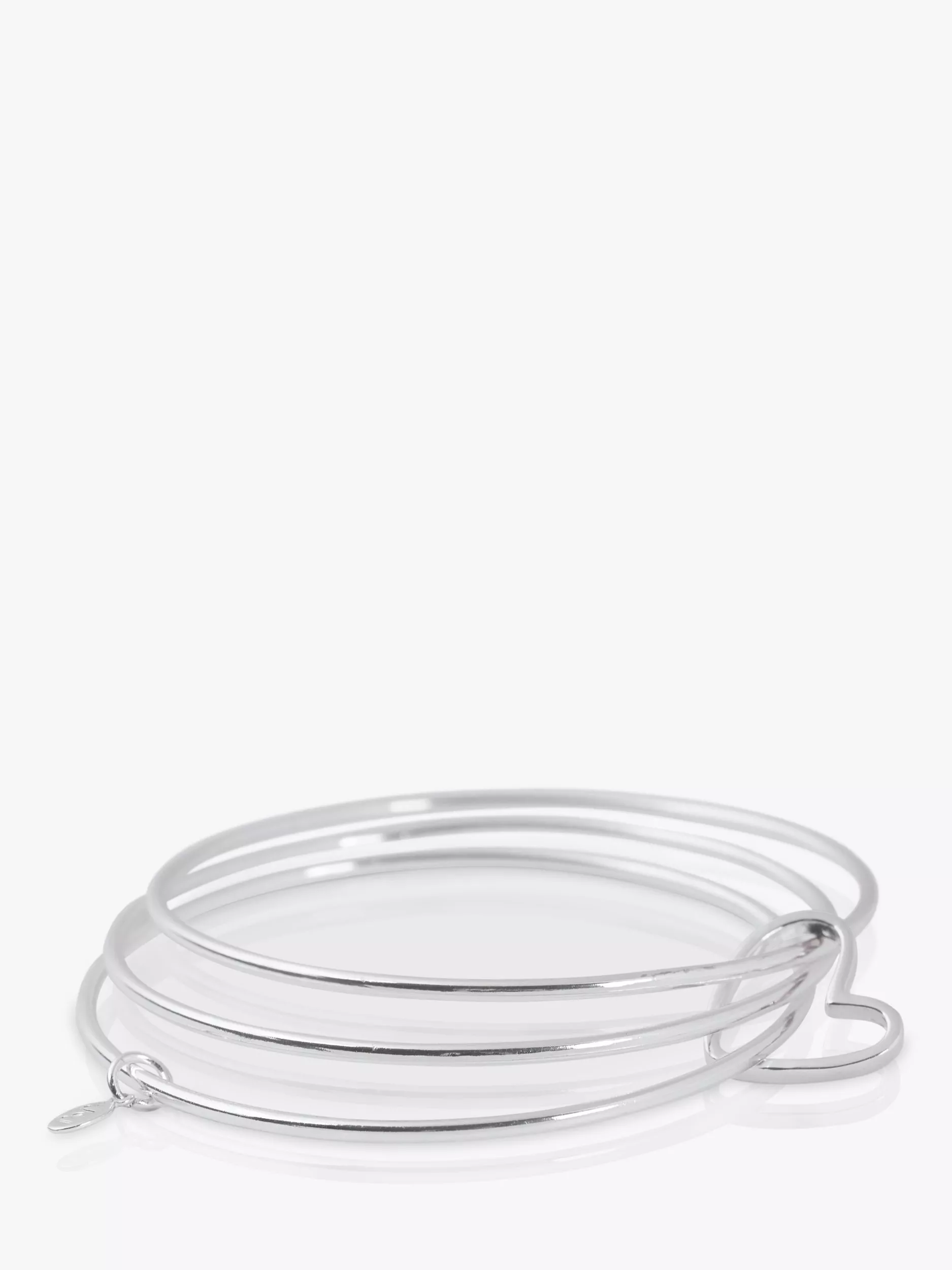 Three slim, silver plated bangles with a matte finish, threaded through a linking outline heart charm. This Joma Jewellery bangle has an inner diameter of 7cm.