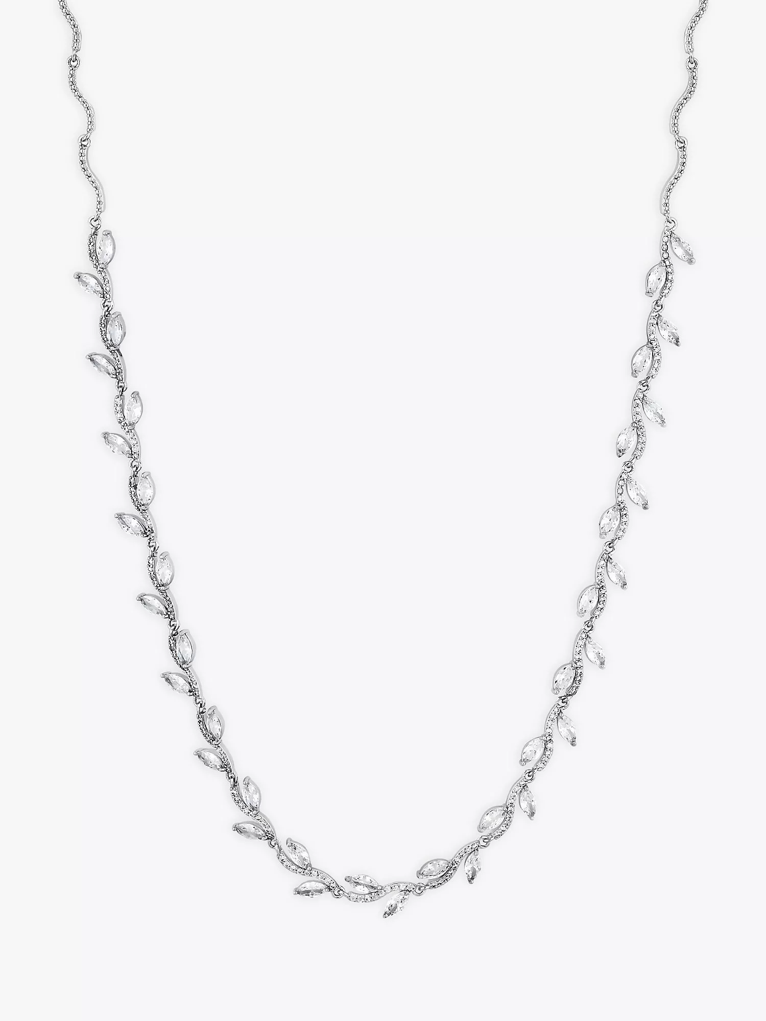 This Jon Richard wave leaf necklace is a simply stunning choice for any bride looking for sophisticated elegance. Inspired by nature, the necklace has a wavy design encrusted with pave set gems and adorned on either side with cubic zirconia charms that resemble leaves. Pair with the matching bracelet and earrings to complete the look.
