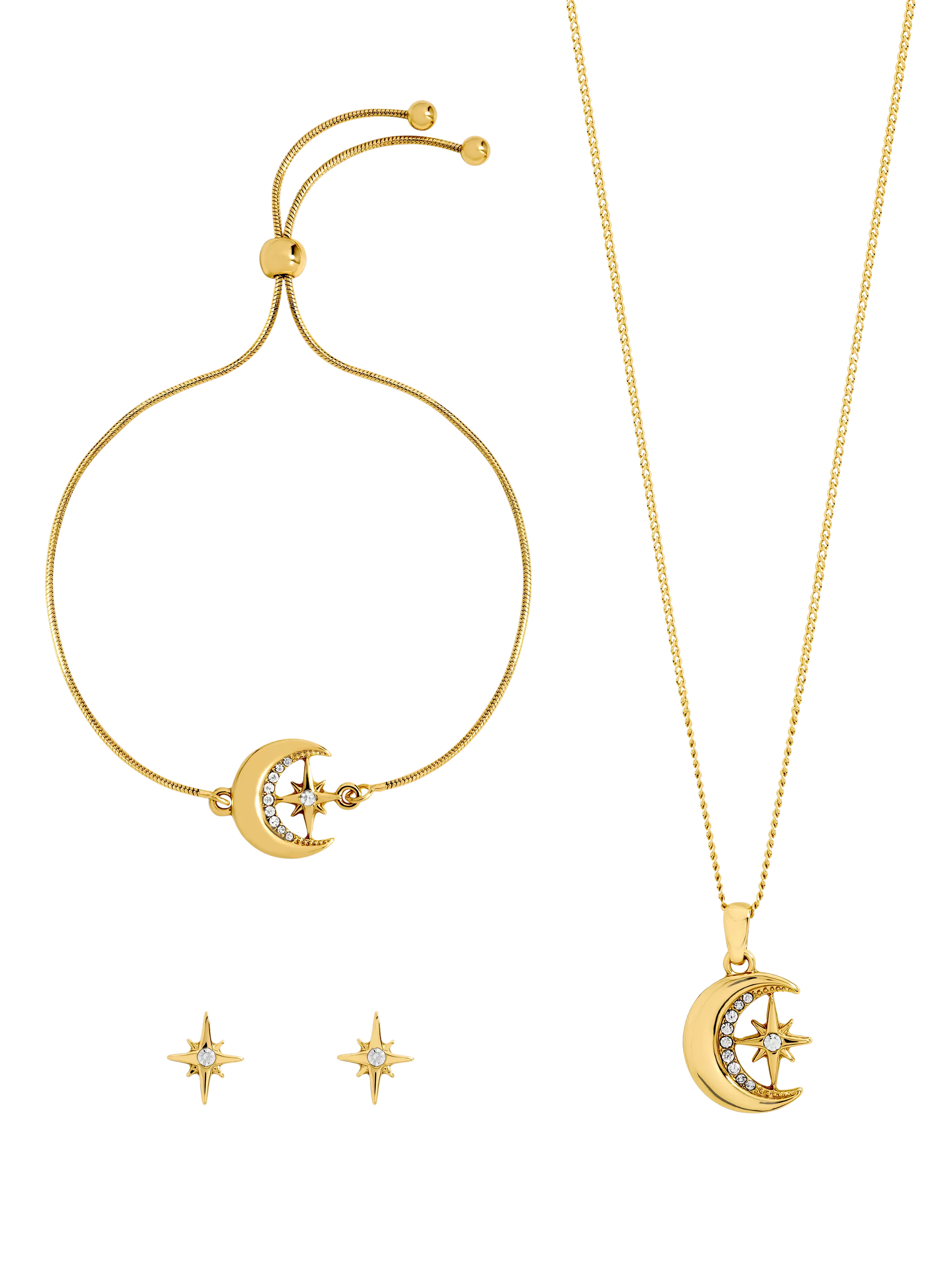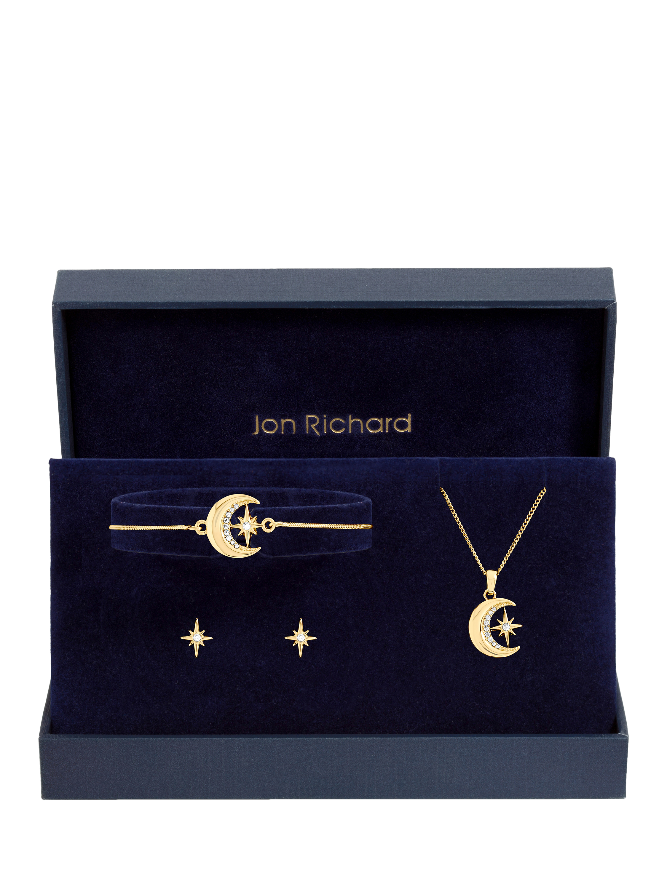 The Jon Richard Gold Plated Crystal and Moon Trio Set captures the mystery of moonlit nights. Let its celestial sparkle inspire dreams, hope, and inner glow. Beautifully presented in a reusable gift box. Fastens with a lobster clasp, toggle, post and bullet back. The earrings are suitable for pierced ears only.